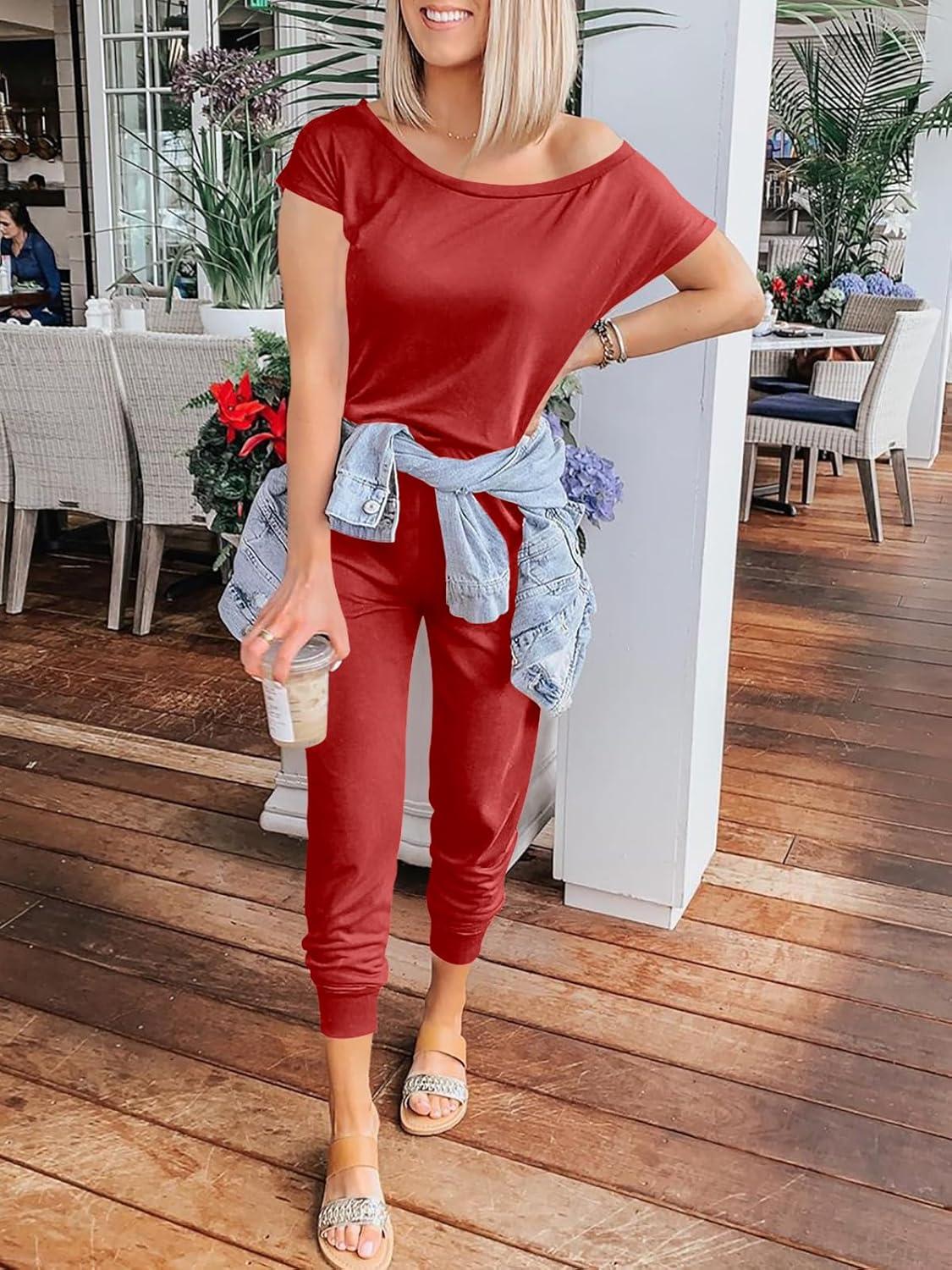 ANRABESS Women’s Loose Summer Casual Off Shoulder Elastic Waist Stretchy Long Romper Jumpsuit(01-brick Red)