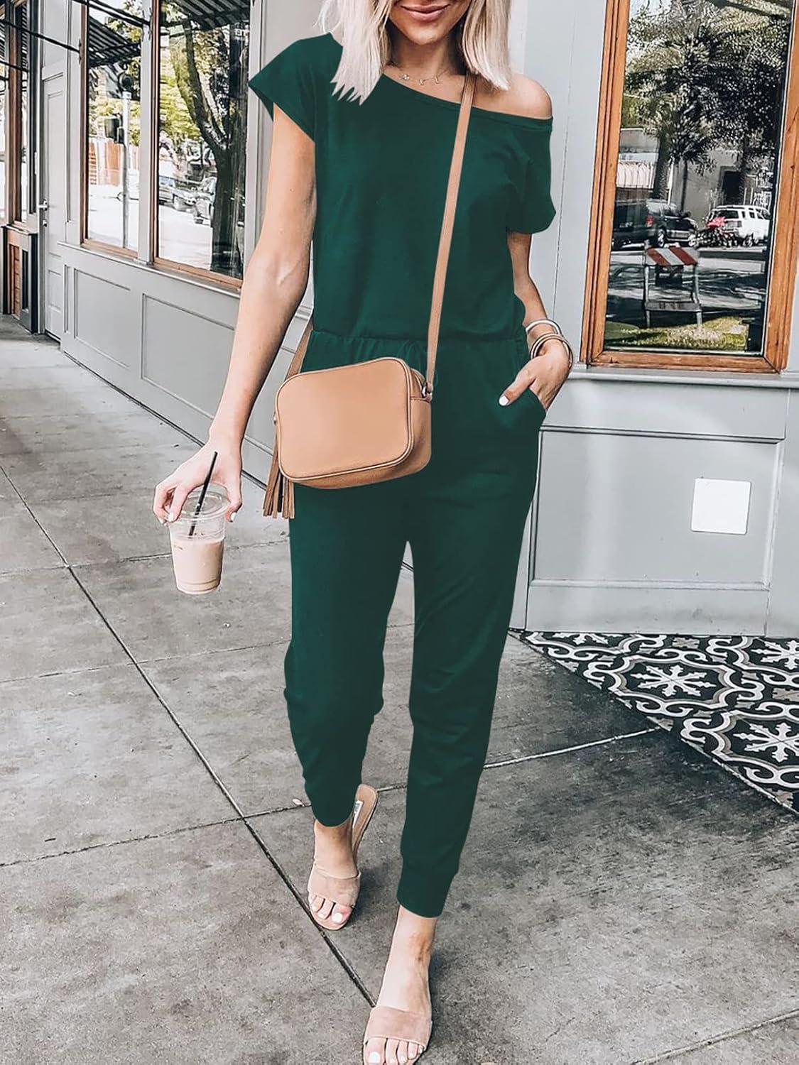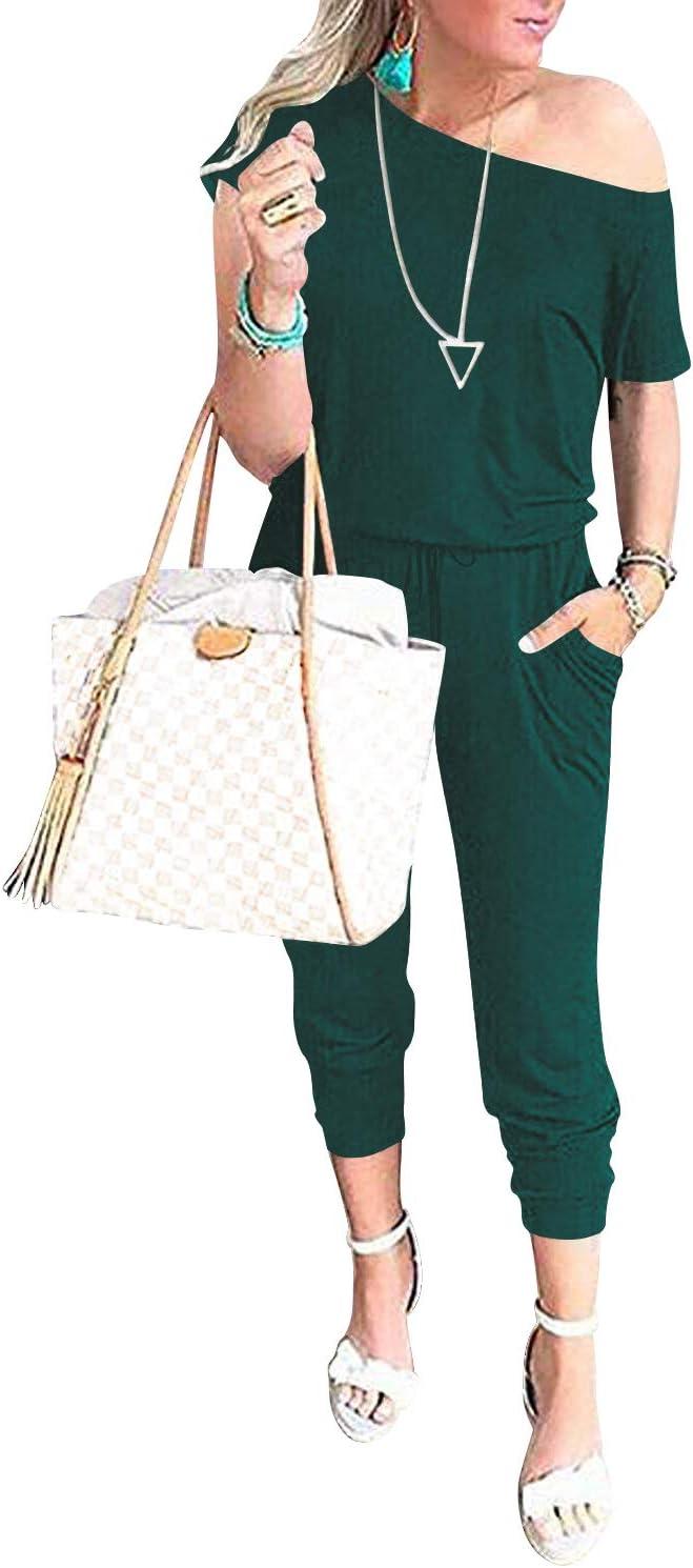 women's loose summer casual Off Shoulder neck elastic wais long romper jumpsuit short sleeve jumpsuits harem long pants overalls