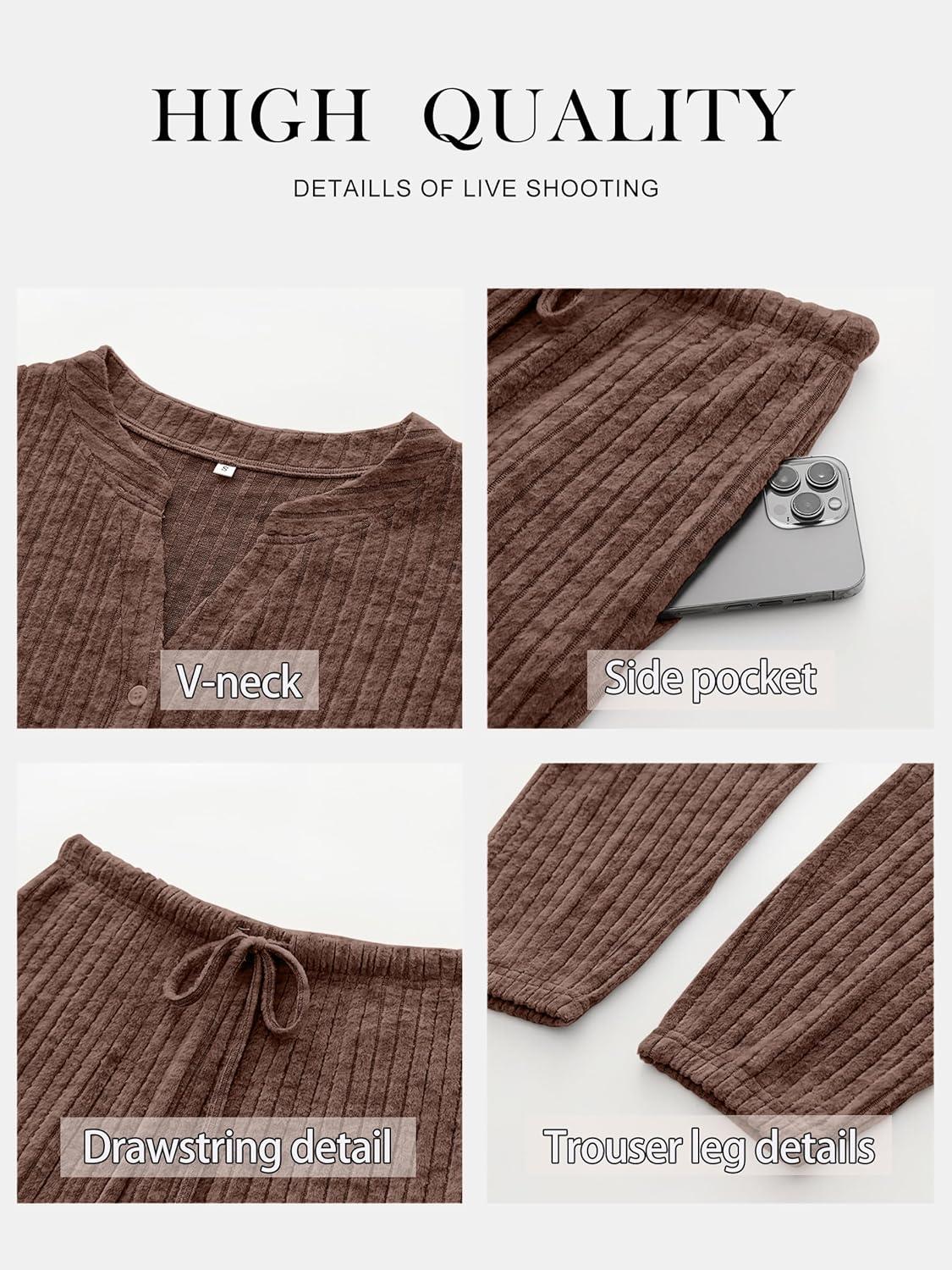 ANRABESS Womens Lounge Set 2025 Fall 2 Piece Outfit Long Sleeve Pajamas Sets Henley Top & Pants Loungewear Clothing(Brown)