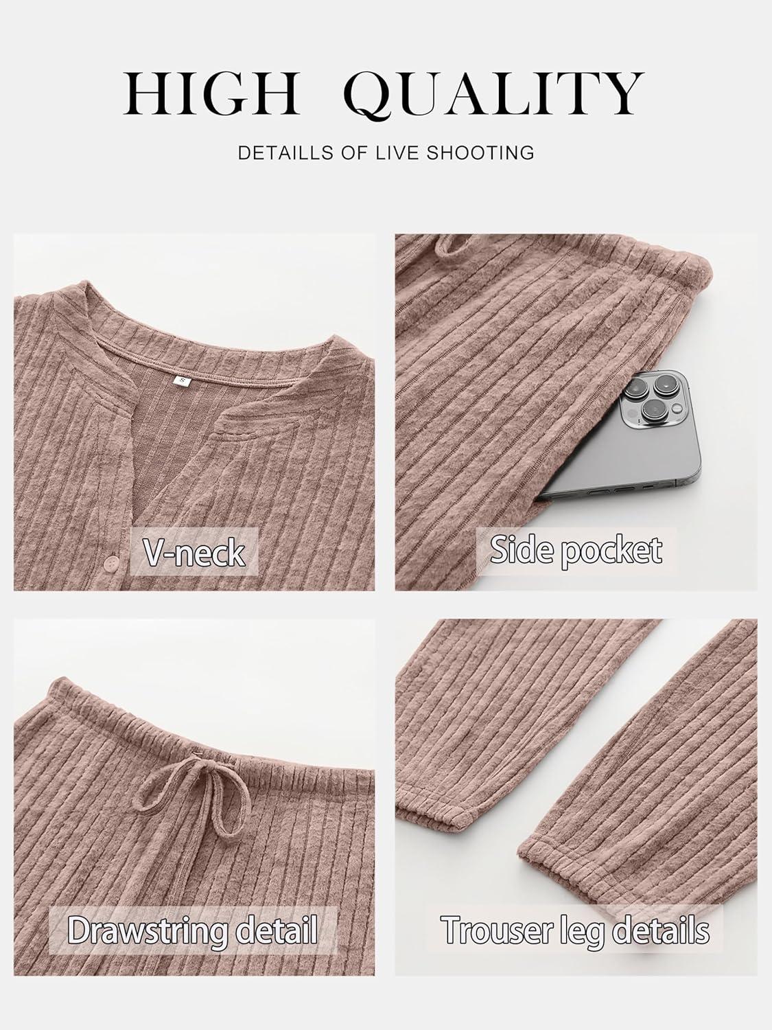 ANRABESS Womens Lounge Set 2025 Fall 2 Piece Outfit Long Sleeve Pajamas Sets Henley Top & Pants Loungewear Clothing(Tan)
