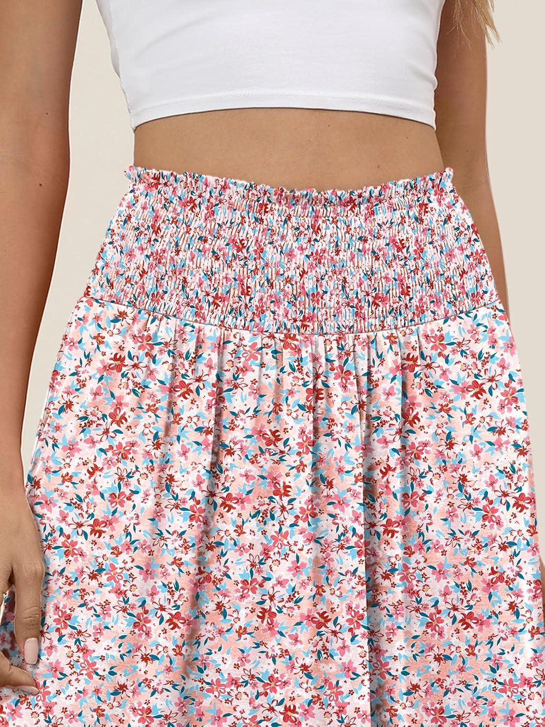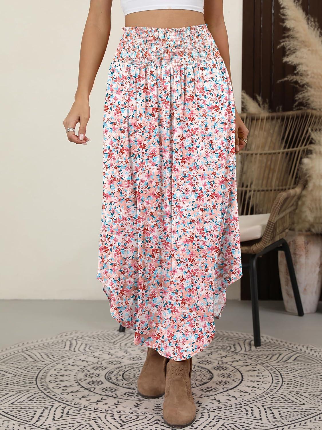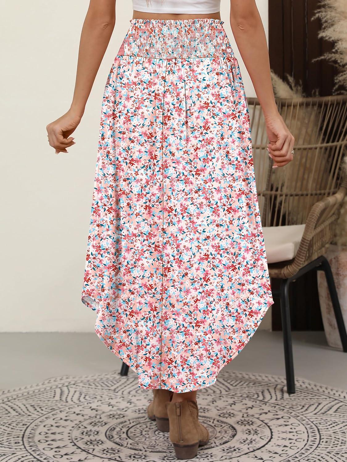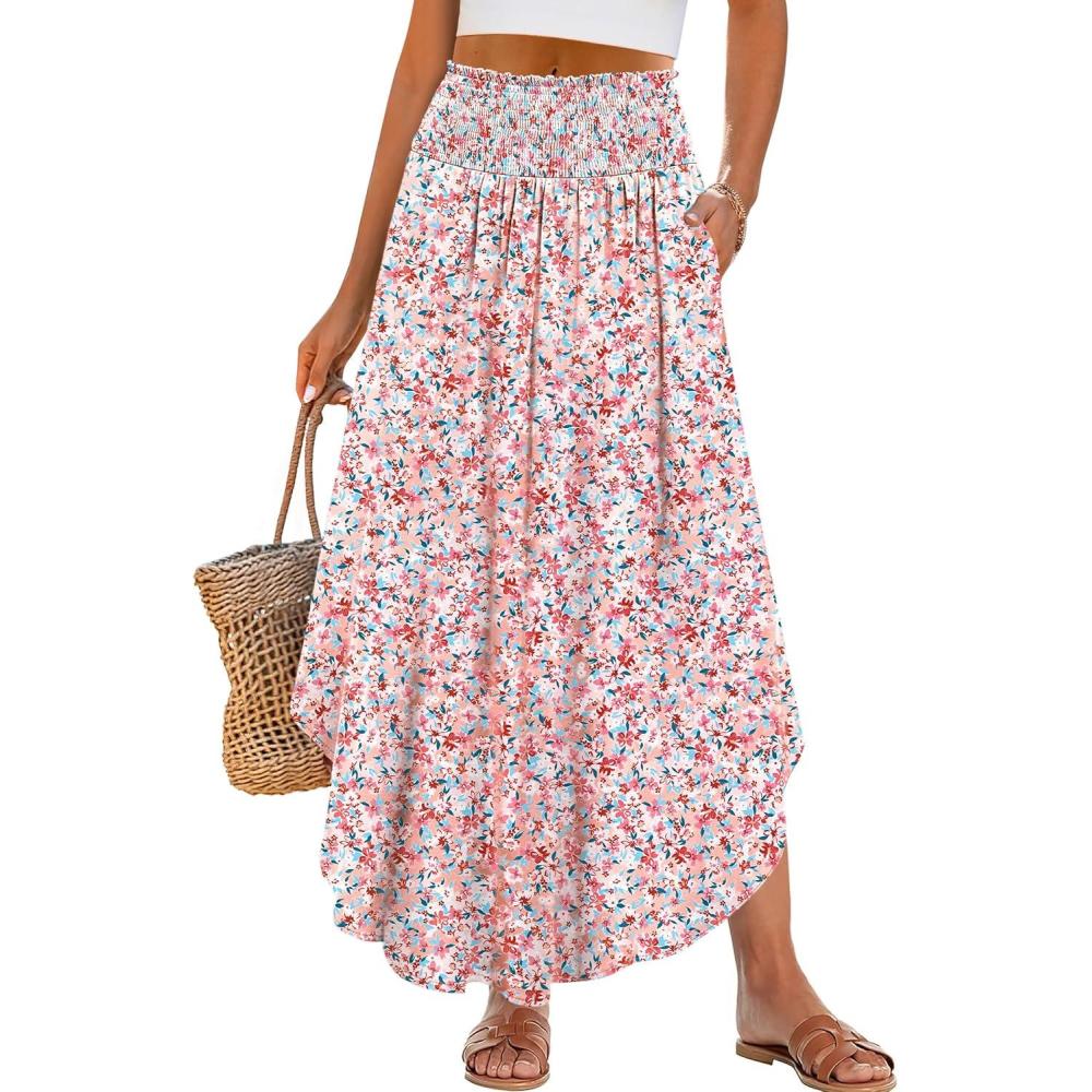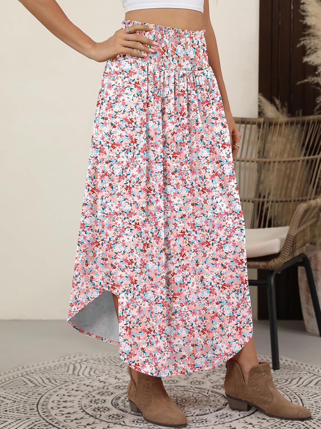 ANRABESS Women's Maxi Skirts Summer Boho Floral High Waisted Flowy Swing Pleated Beach Long Skirt with Pockets(Floral Pink)