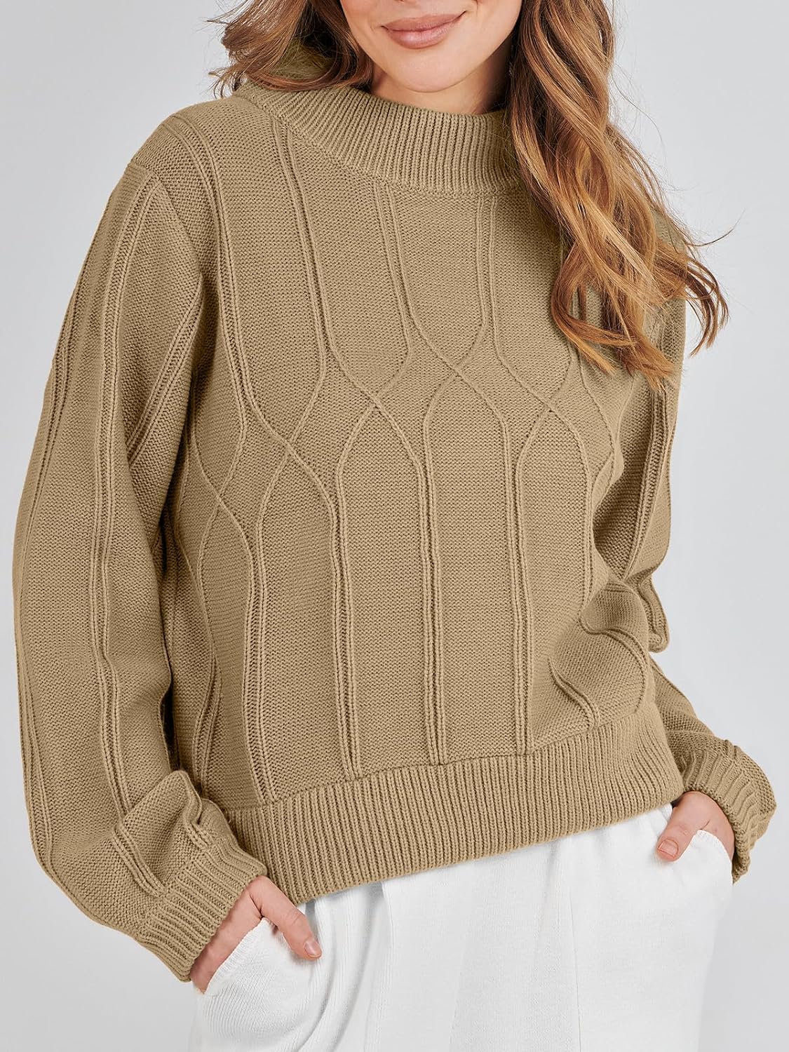 ANRABESS Women’s Mock Neck Long Sleeve Casual Loose Cable Knit Fall Cropped Pullover Sweater Jumper(Khaki)