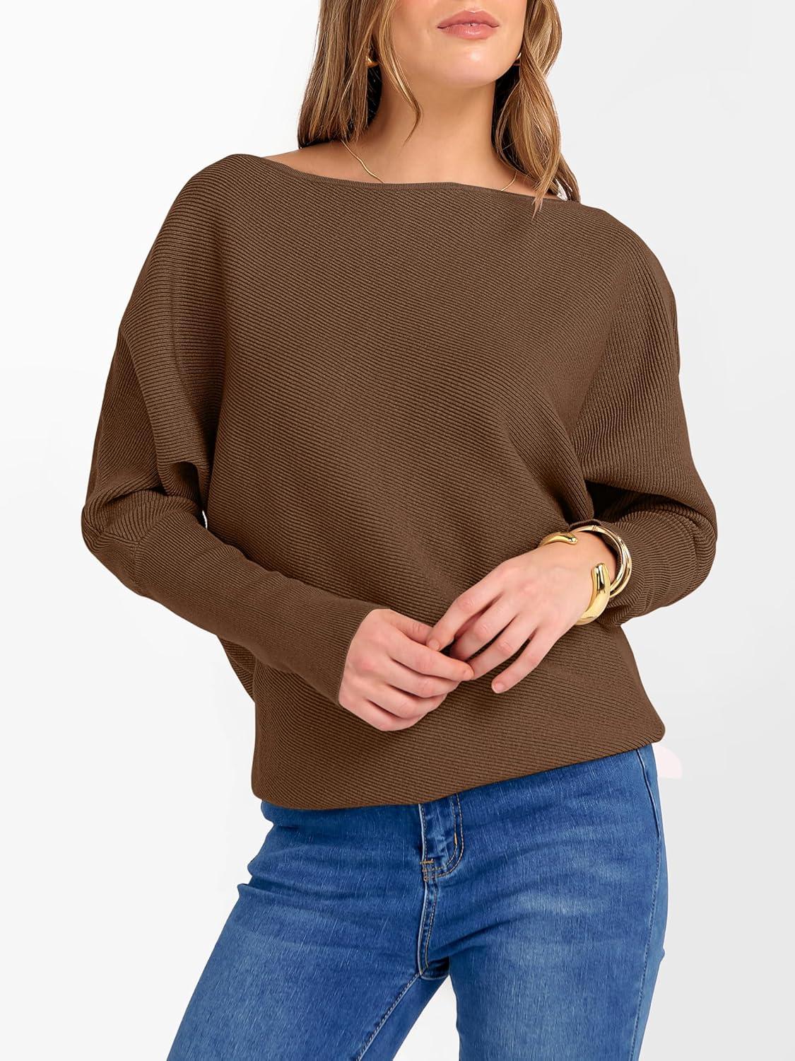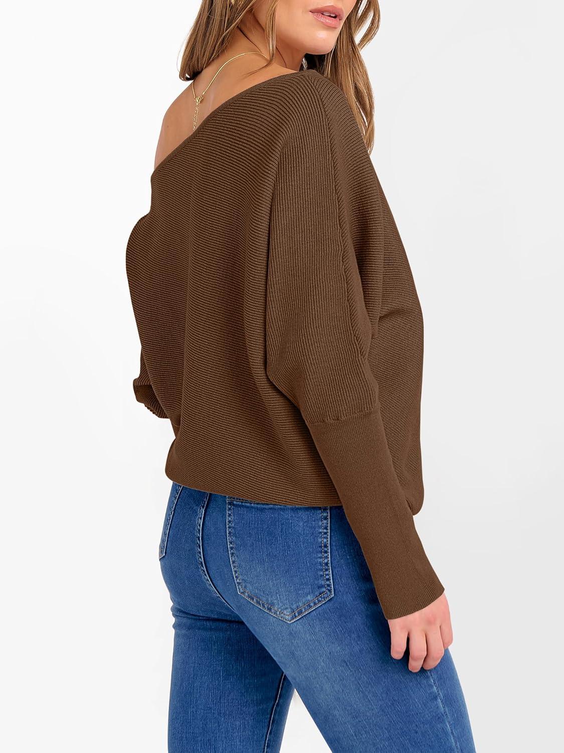 ANRABESS Womens Off Shoulder Sweaters 2025 Fall Long Batwing Sleeve Loose Fit Knit Tops Casual Pullovers Jumpers(Deep Caramel)