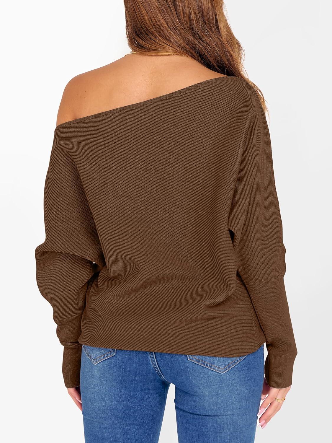 imageANRABESS Womens Off Shoulder Sweaters 2025 Fall Long Batwing Sleeve Loose Fit Knit Tops Casual Pullovers JumpersDeep Caramel