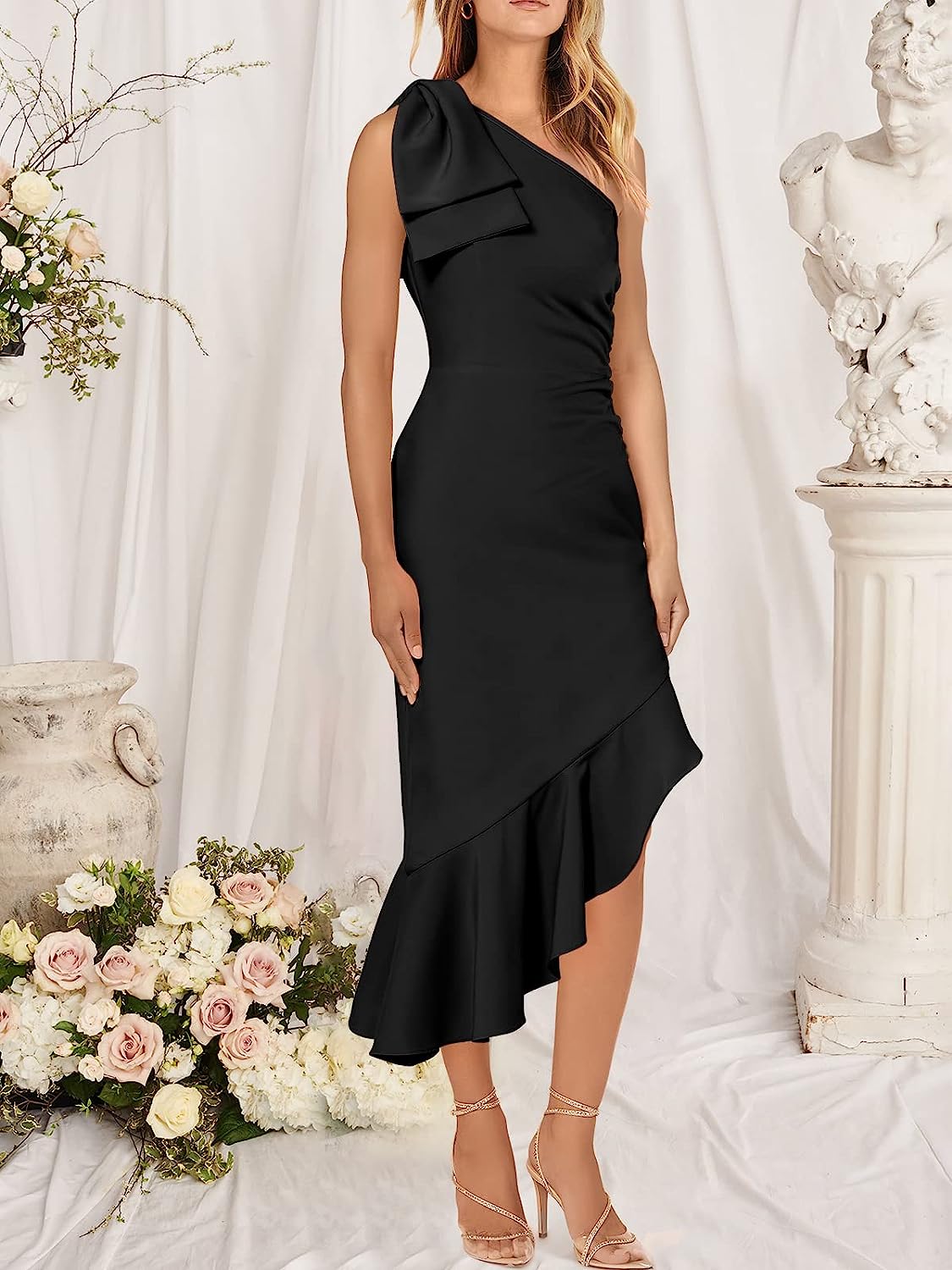 ANRABESS Women's One Shoulder Formal Midi Dresses Sleeveless Bodycon Mermaid Ruffle Cocktail Wedding Guest Dress(Black)