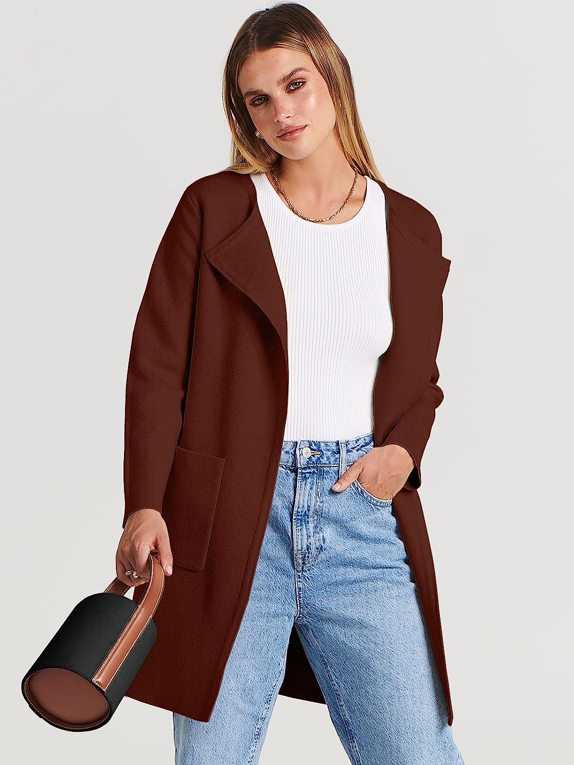 ANRABESS Women’s Open Front Knit Cardigan Long Sleeve Lapel Casual Solid Classy Sweater Jacket(Red Brown)
