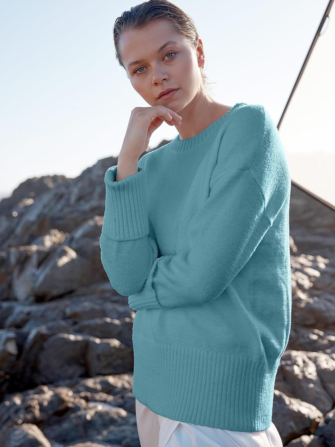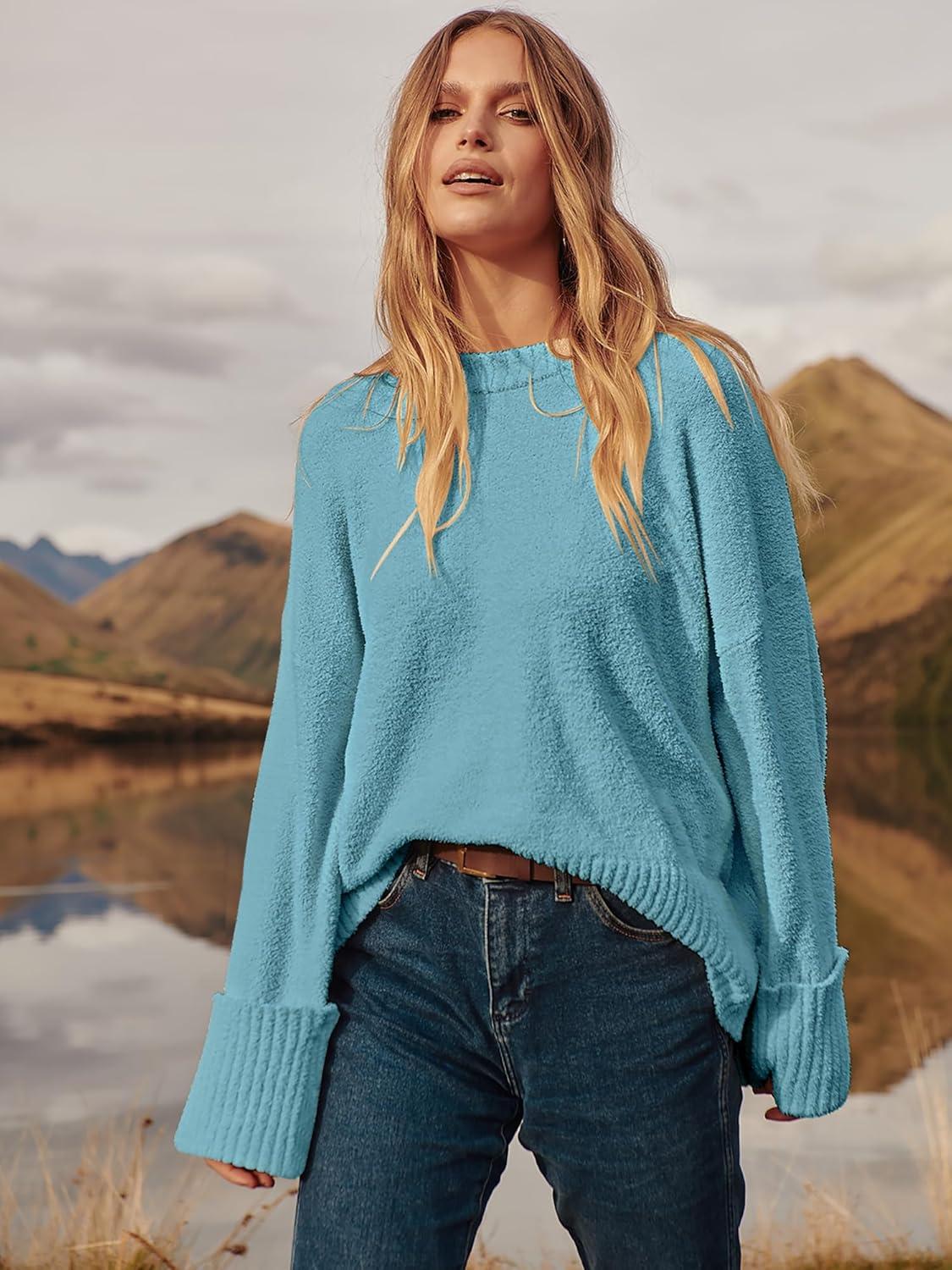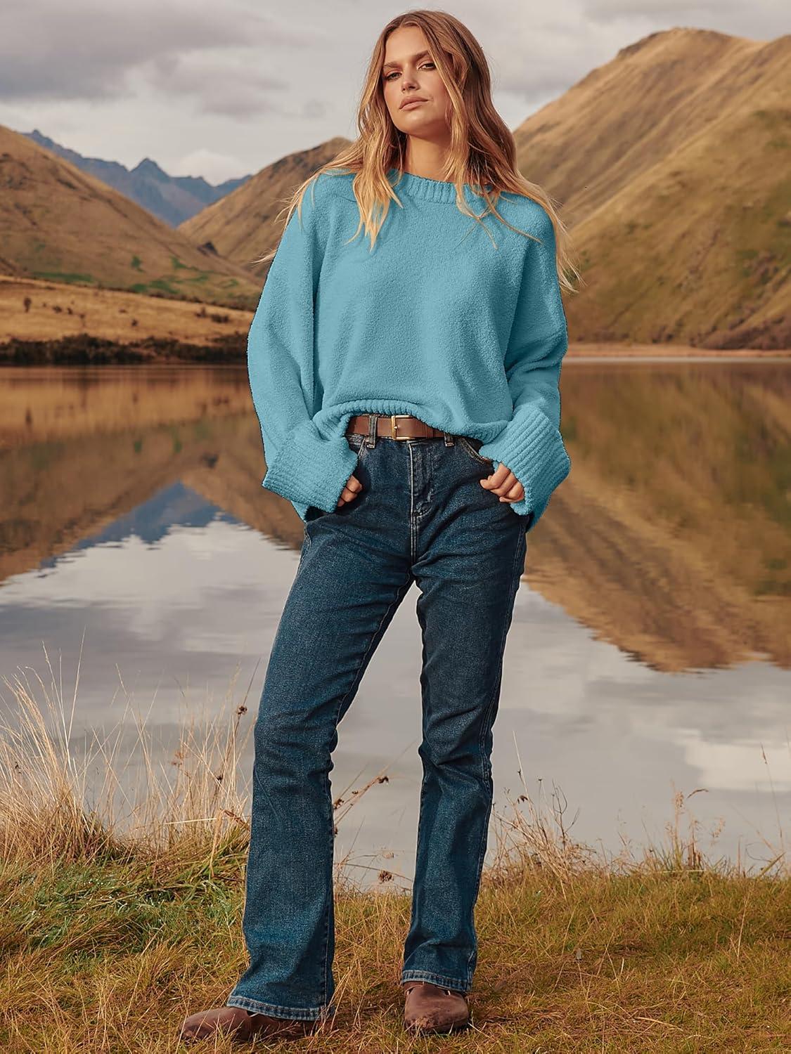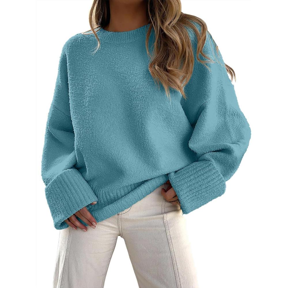 ANRABESS Women’s Oversized Crewneck Long Sleeve Fuzzy Knit Casual Chunky Warm 2025 Fall Pullover Sweaters Top Trendy Outfits(Lake)