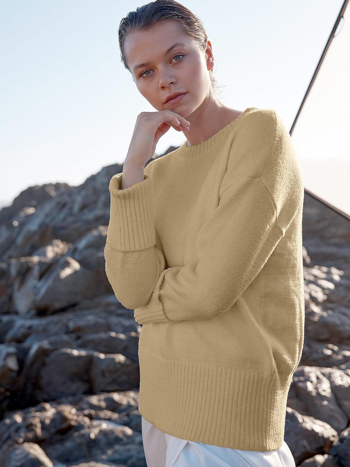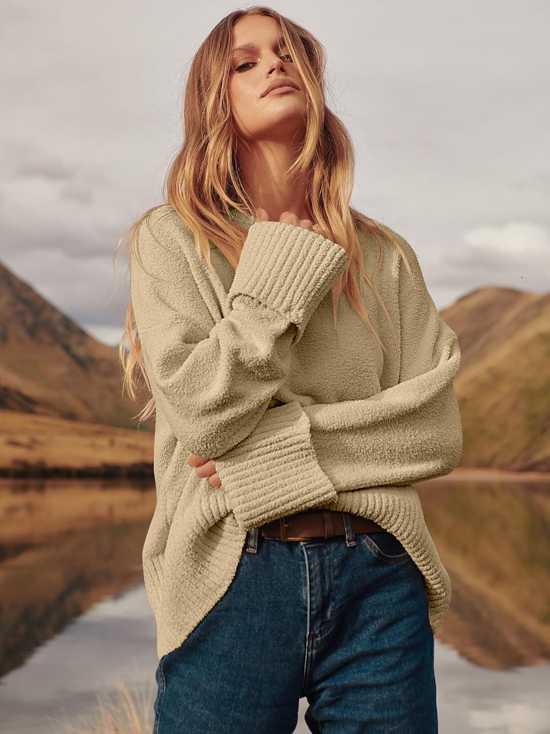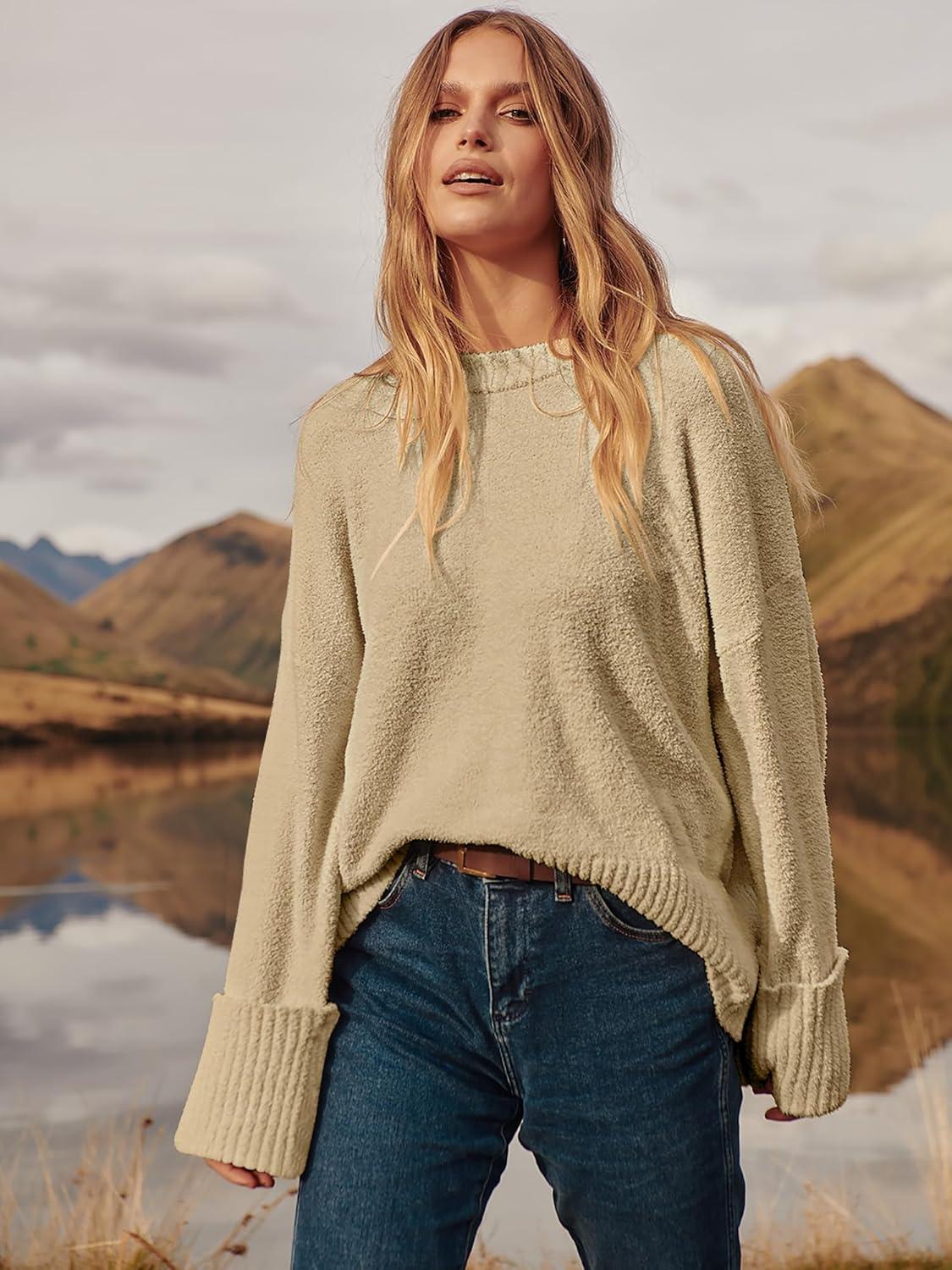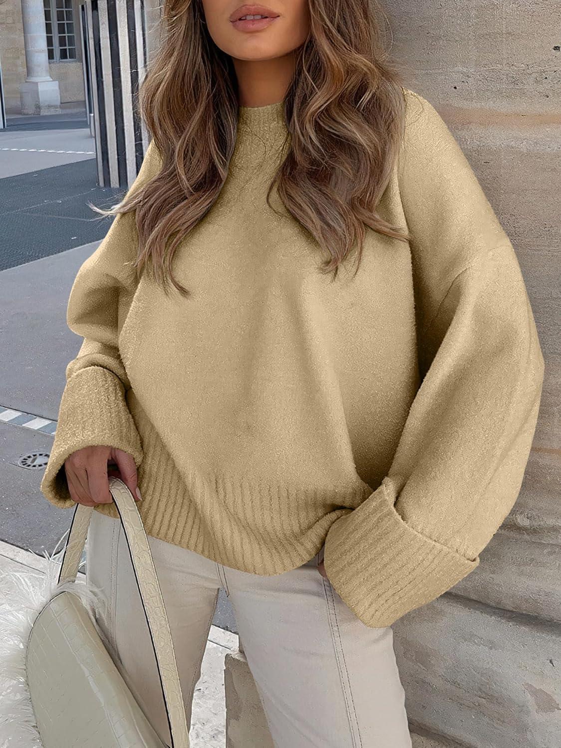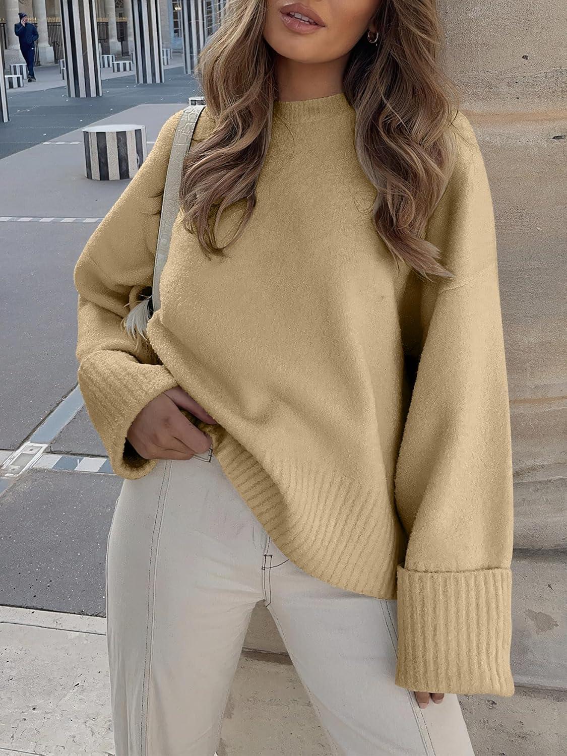 ANRABESS Women’s Oversized Crewneck Long Sleeve Fuzzy Knit Casual Chunky Warm 2025 Fall Pullover Sweaters Top Trendy Outfits(Light Khaki)