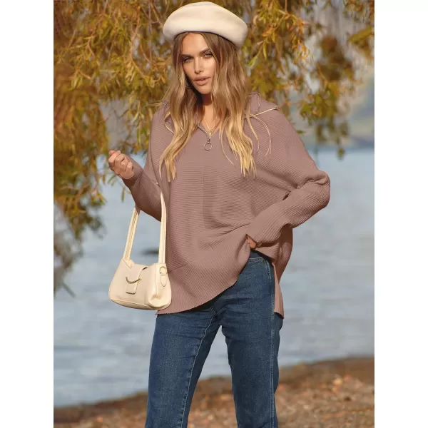 ANRABESS Womens Oversized Half Zip Sweater Casual Knit Pullover Tunic Sweater with Slit 2023 Trendy Fall Winter Clothes(Brown)