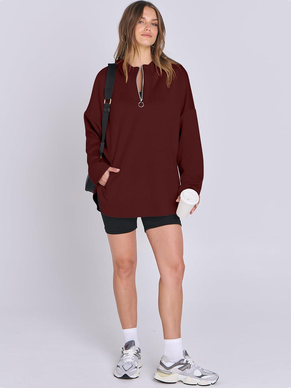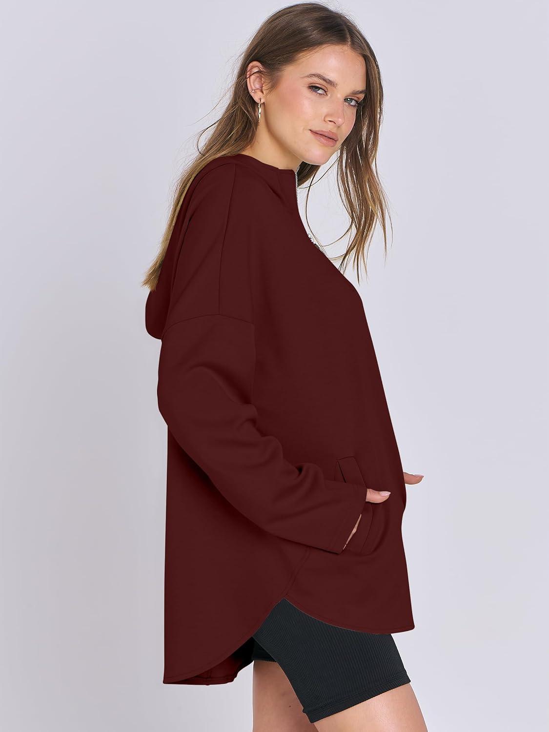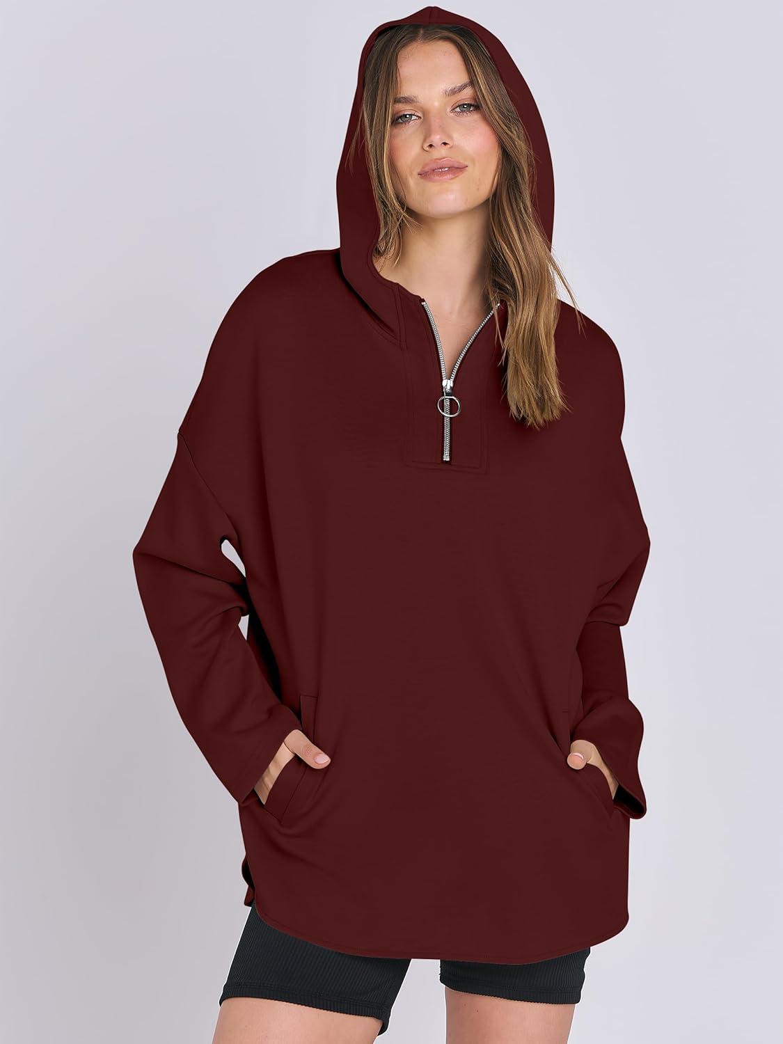ANRABESS Womens Oversized Hoodie Quarter Zip Sweatshirts 2025 Fall Winter Tunic Pullover Top Trendy Teen Girls Preppy Clothes(Burgundy)