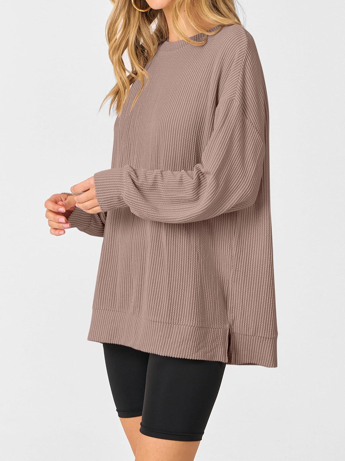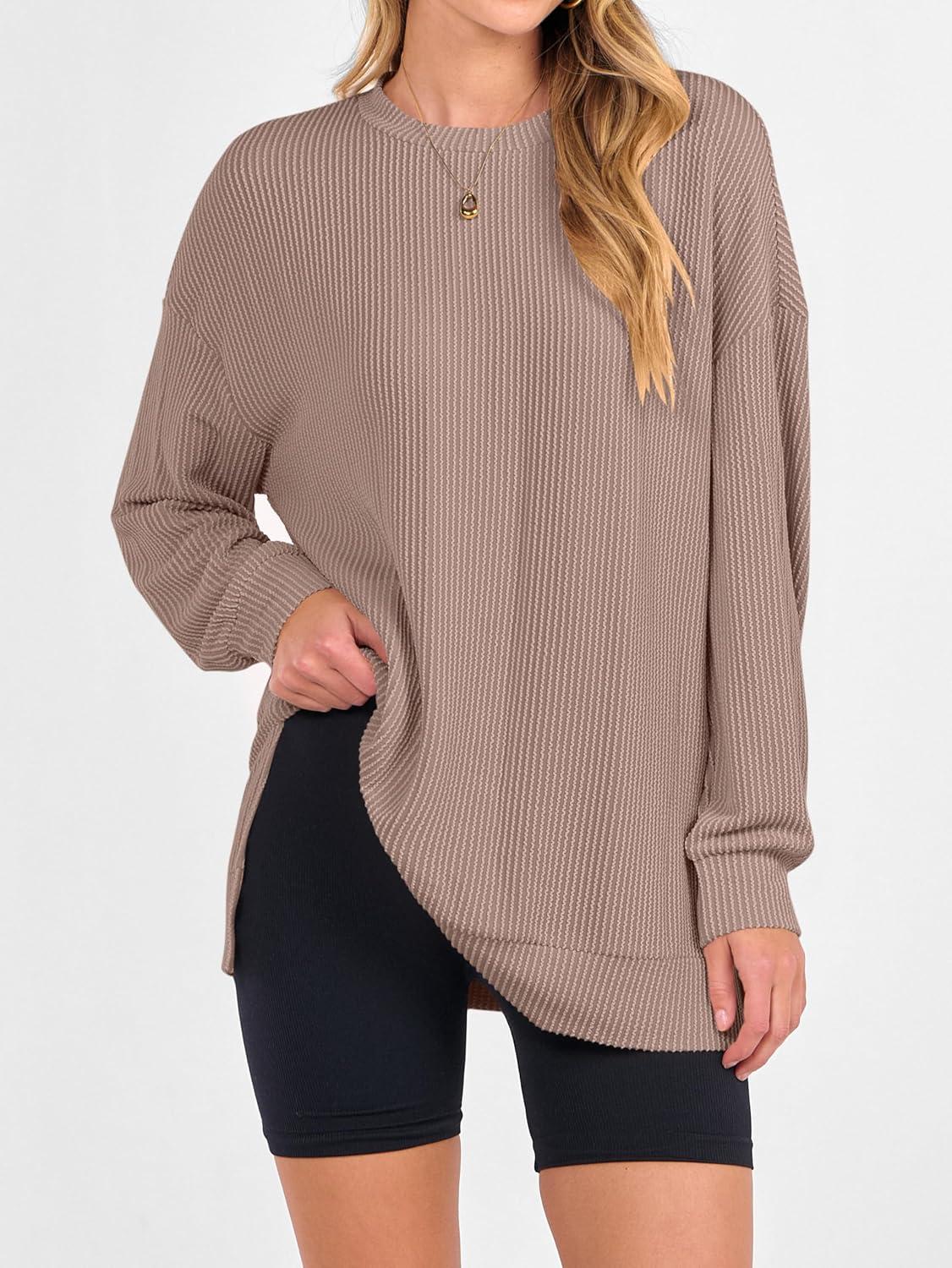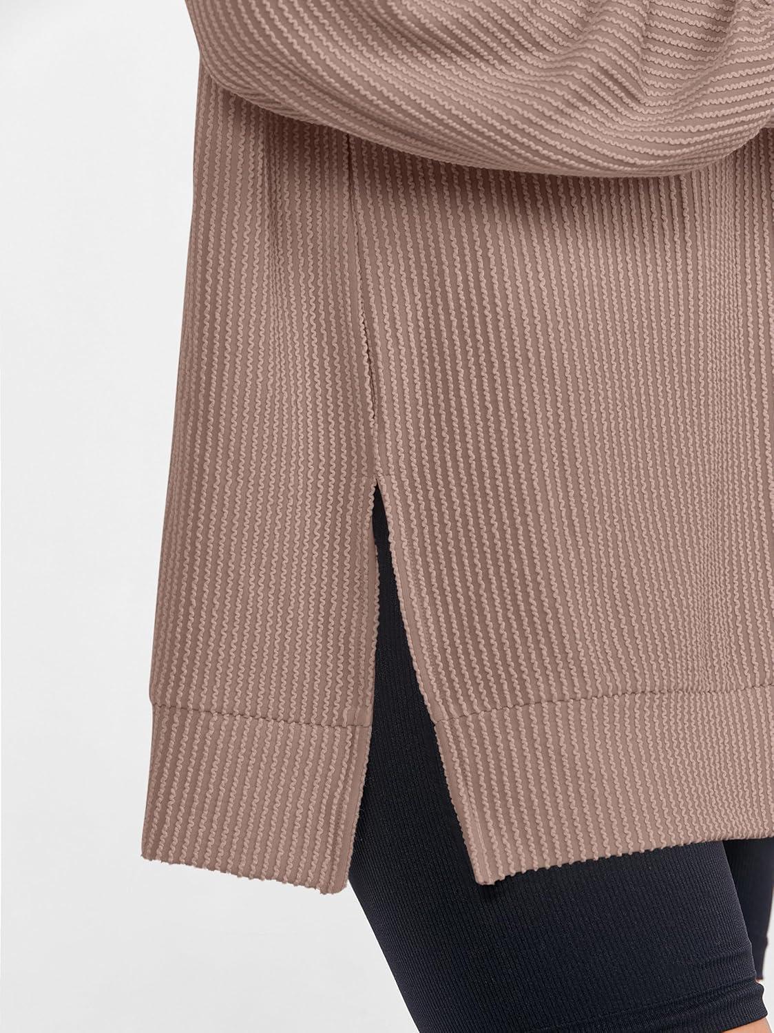 ANRABESS Womens Oversized Long Sleeve Shirts Ribbed Knit Tunic Tops Side Spilt Casual 2025 Fall Outfits(Khaki)