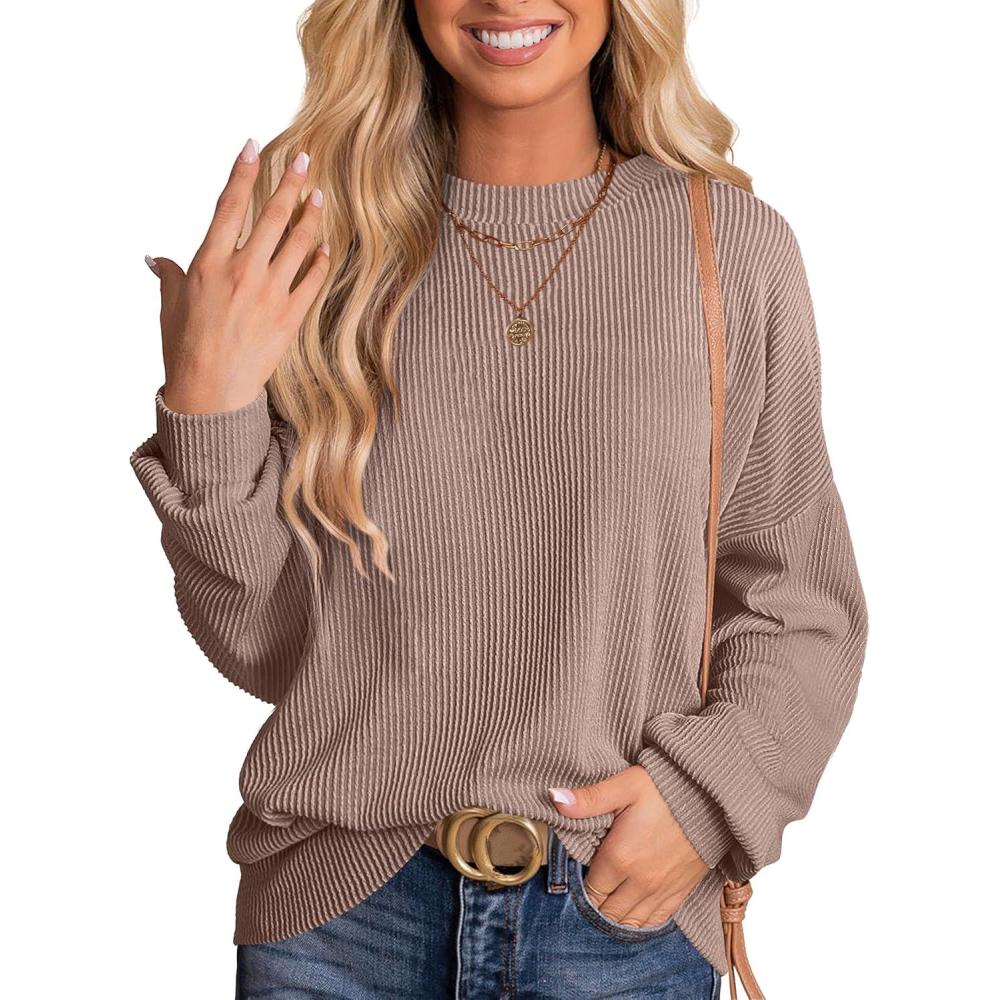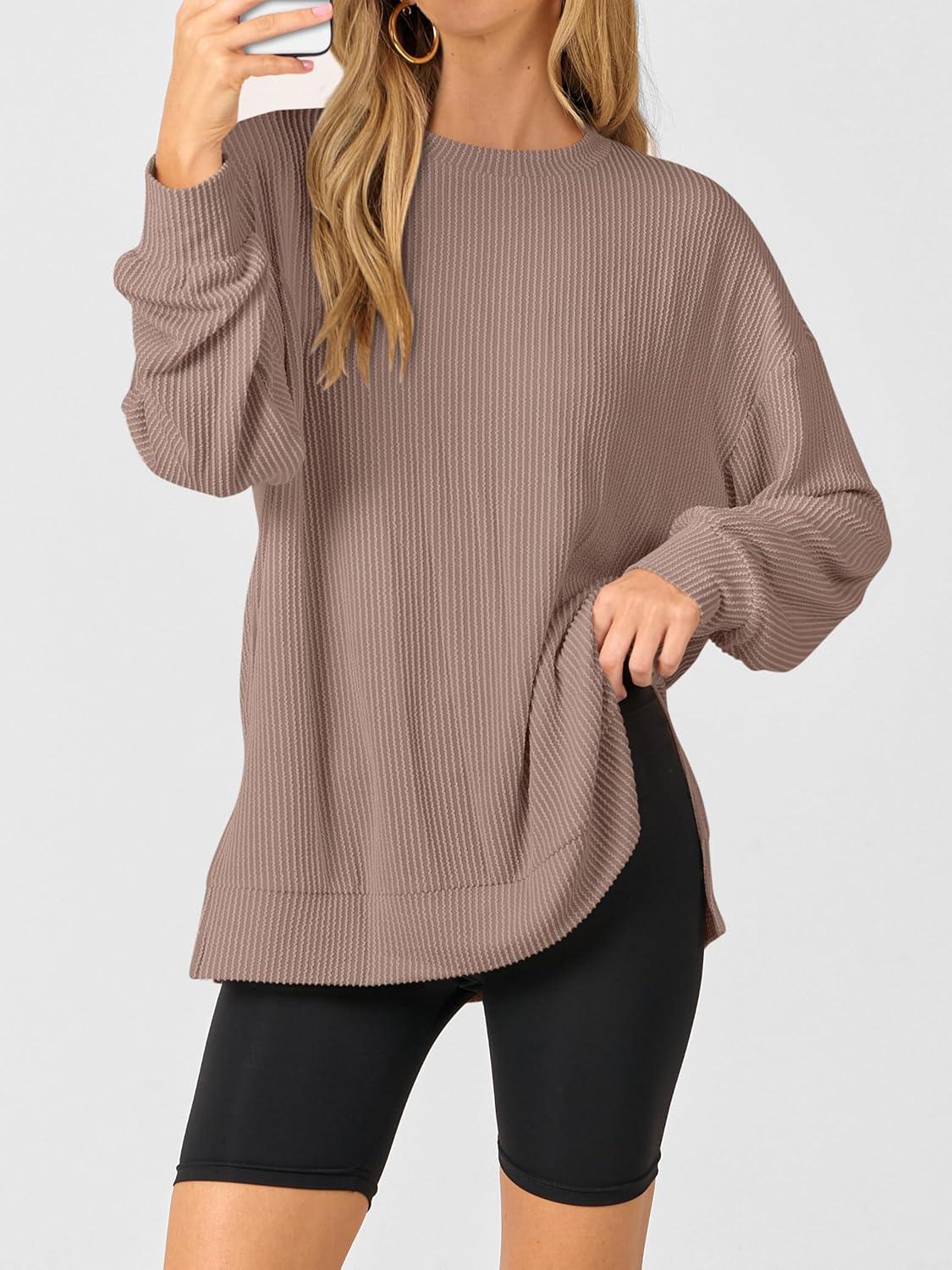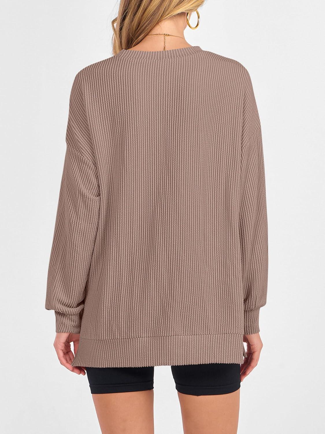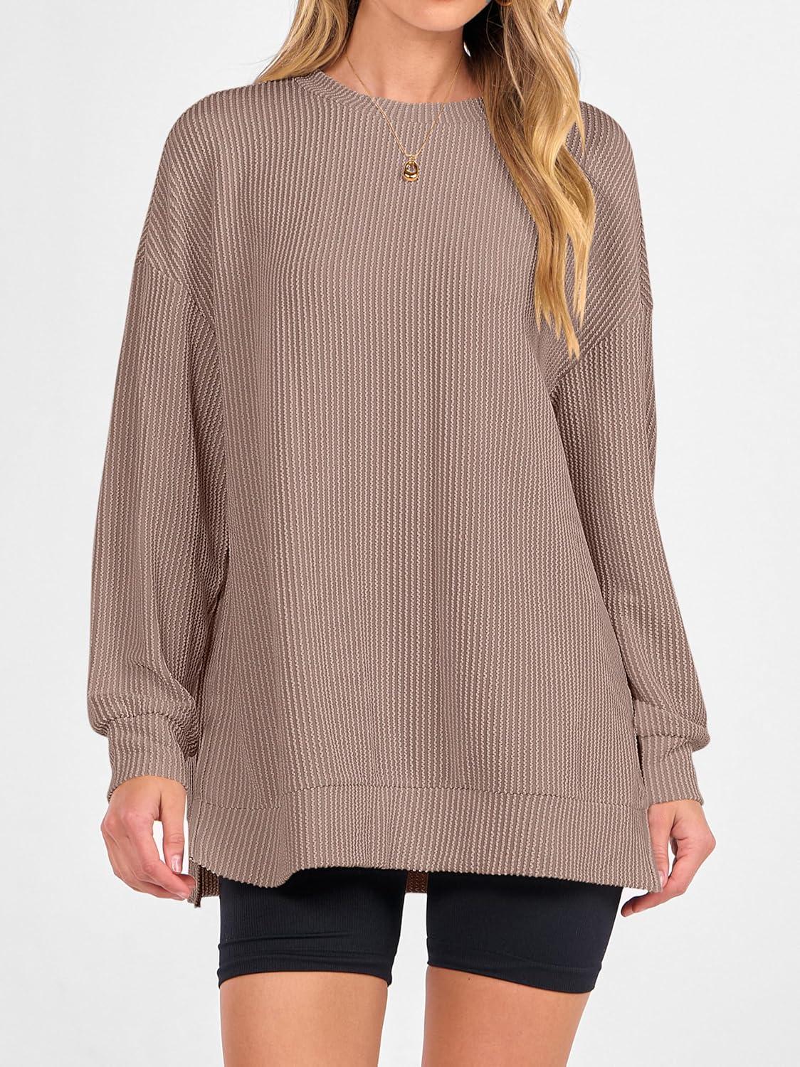 ANRABESS Womens Oversized Long Sleeve Shirts Ribbed Knit Tunic Tops Side Spilt Casual 2025 Fall Outfits(Khaki)