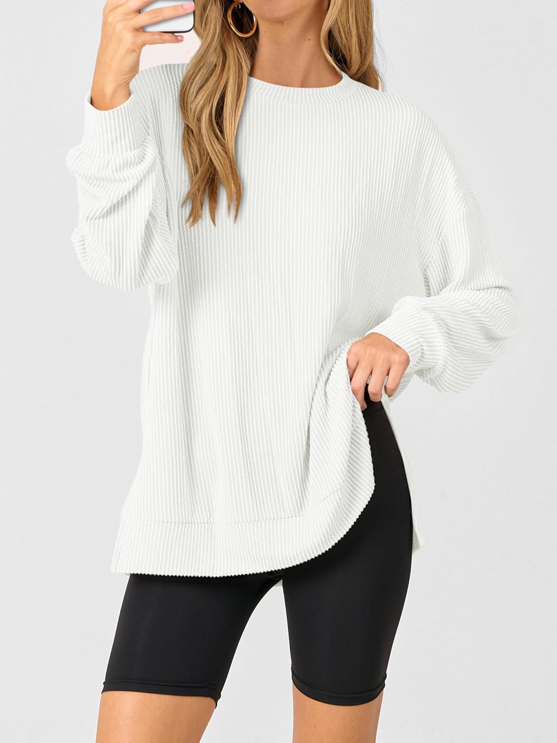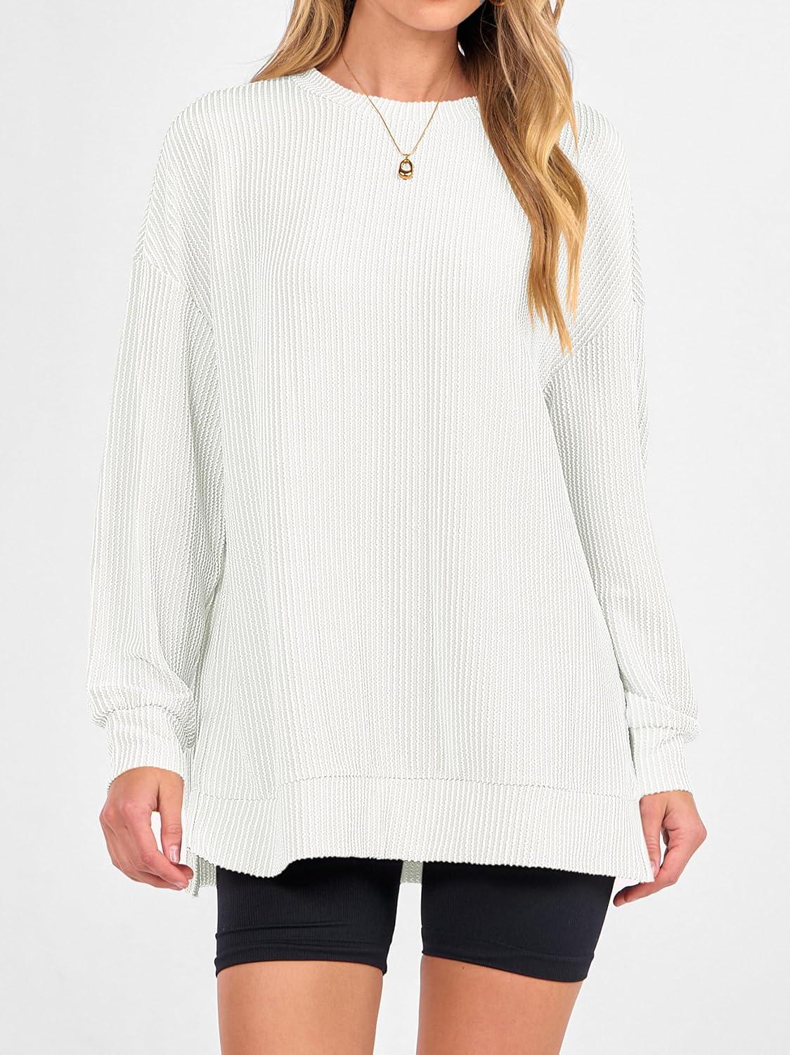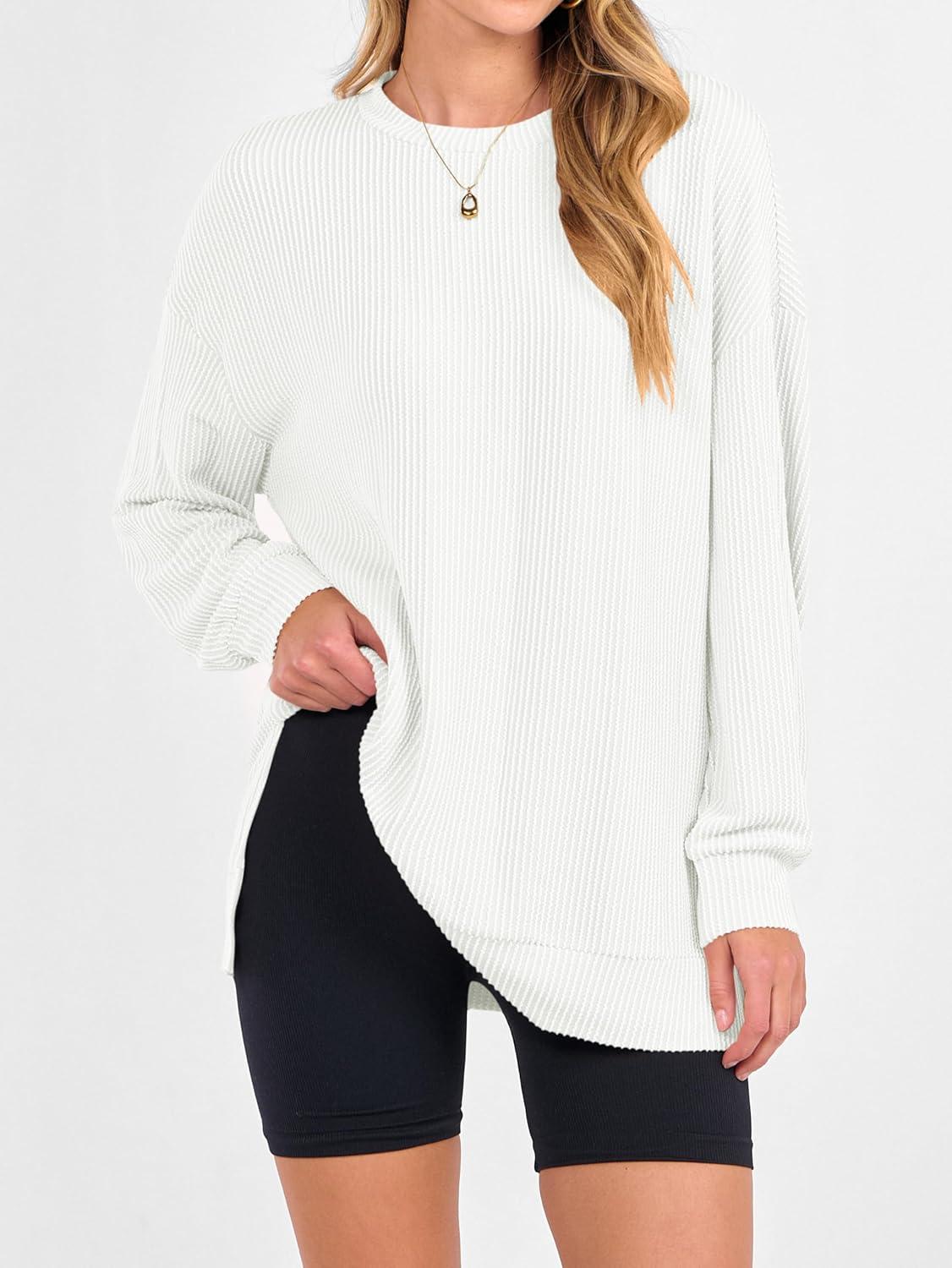ANRABESS Womens Oversized Long Sleeve Shirts Ribbed Knit Tunic Tops Side Spilt Casual 2025 Fall Outfits(White)