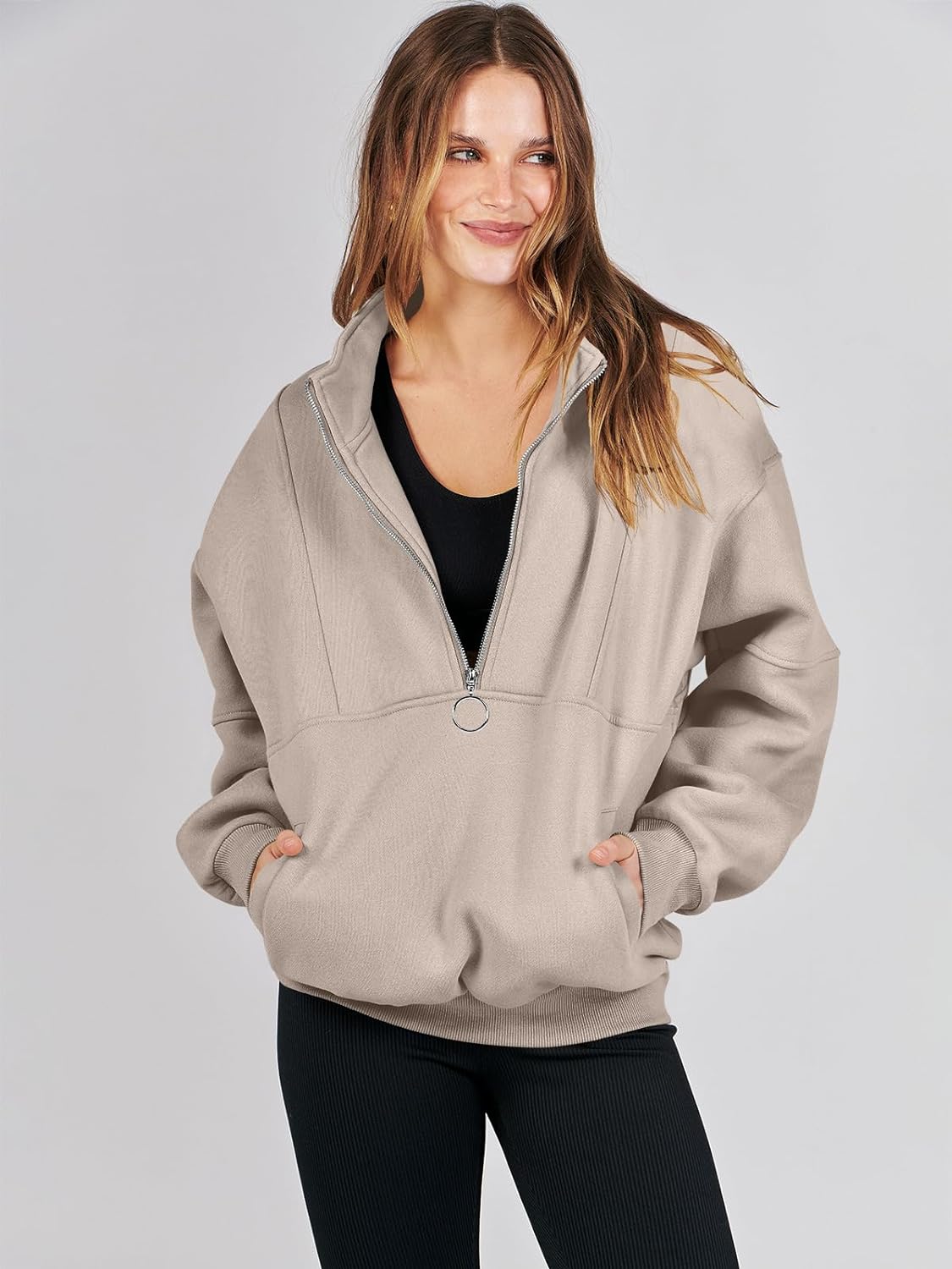 ANRABESS Women’s Oversized Quarter Zip Sweatshirt Long Sleeve Drop Shoulder Pullover Fleece Half Zip Hoodie Fall Clothes(Light Brown)
