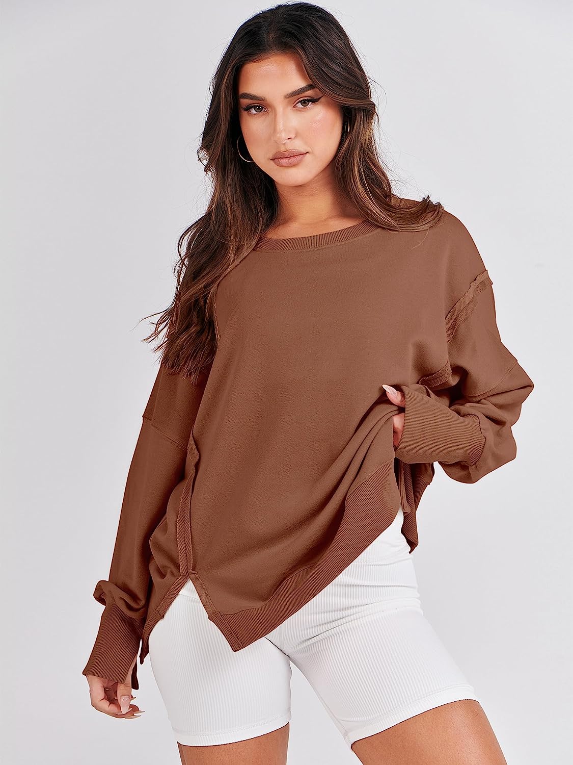 ANRABESS Women’s Oversized Sweatshirt Crew Neck Long Sleeve Casual Slit Sloucthy Pullover Top Fall Clothes(Caramel)