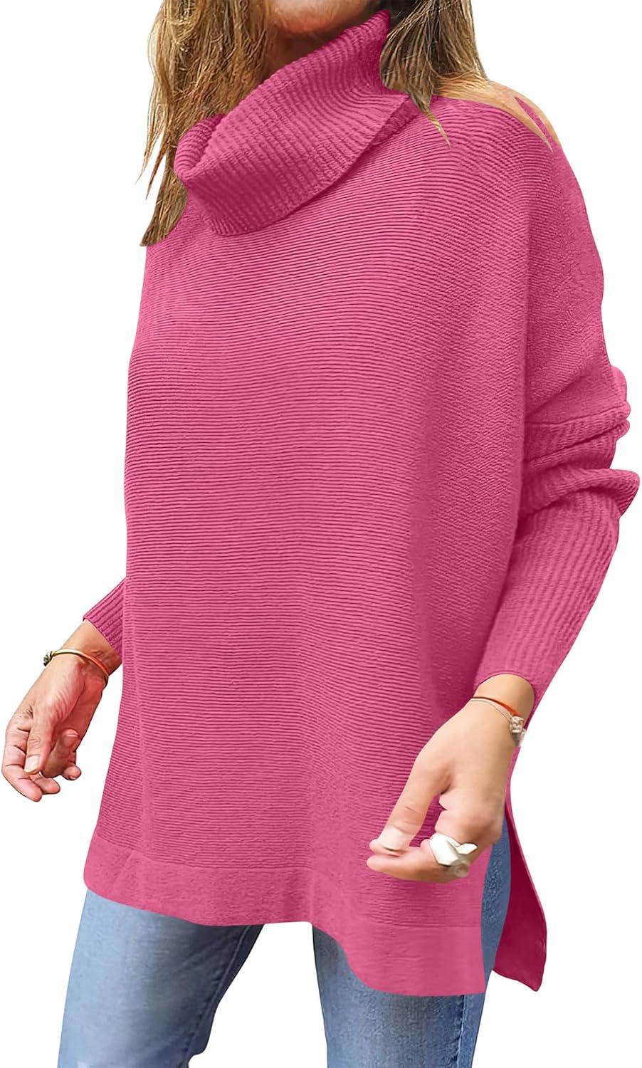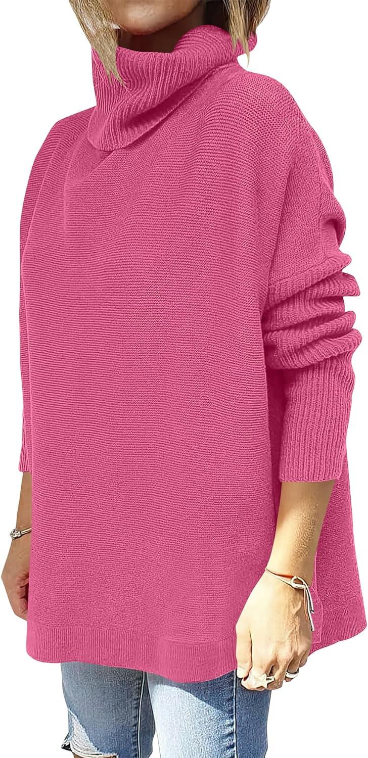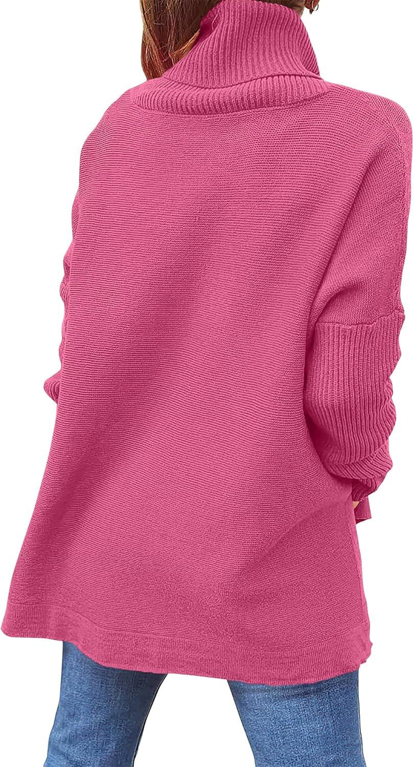 imageANRABESS Womens Oversized Turtleneck Batwing Sleeve Spilt Casual Loose Knit Tunic Pullover Sweater Tops 2025 Fall OutfitsHot Pink