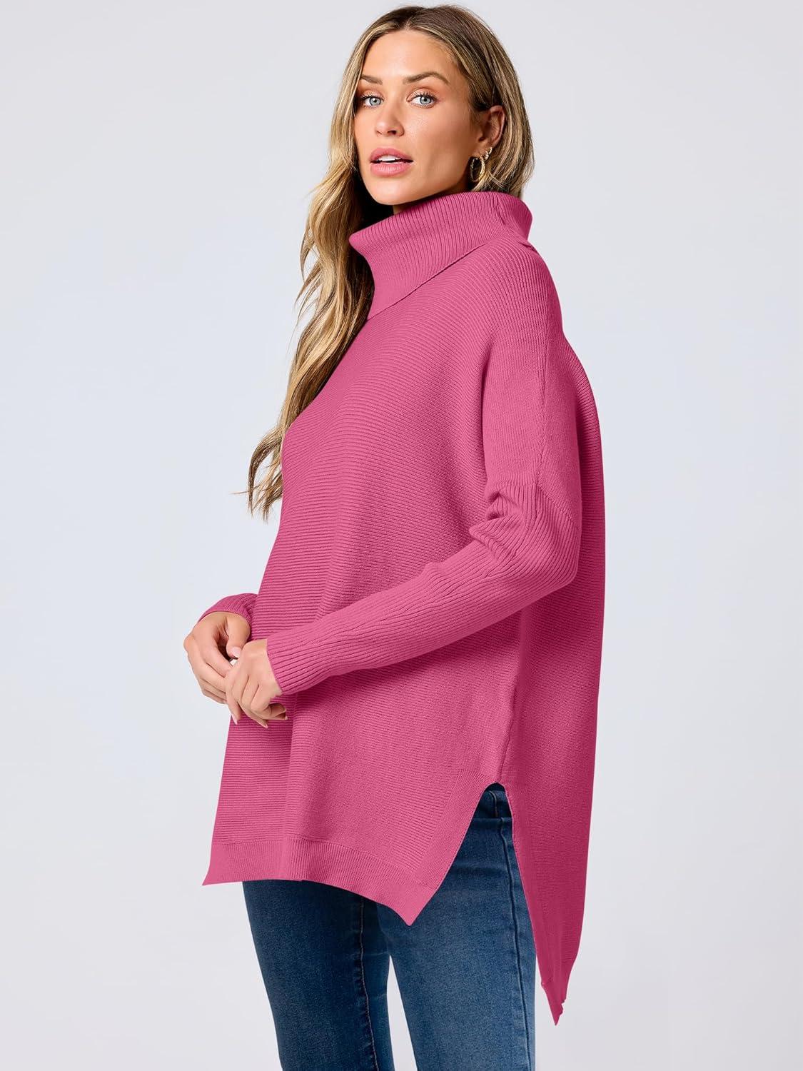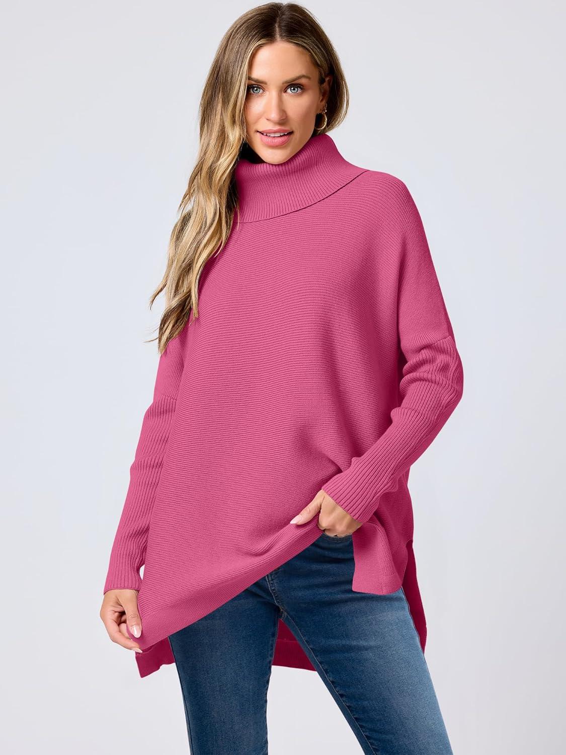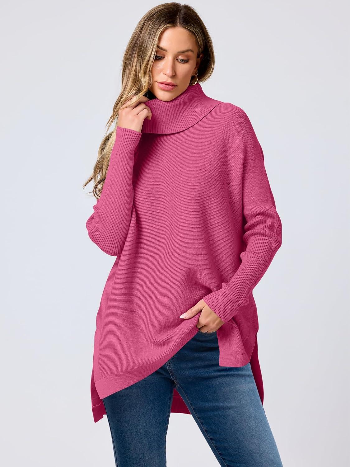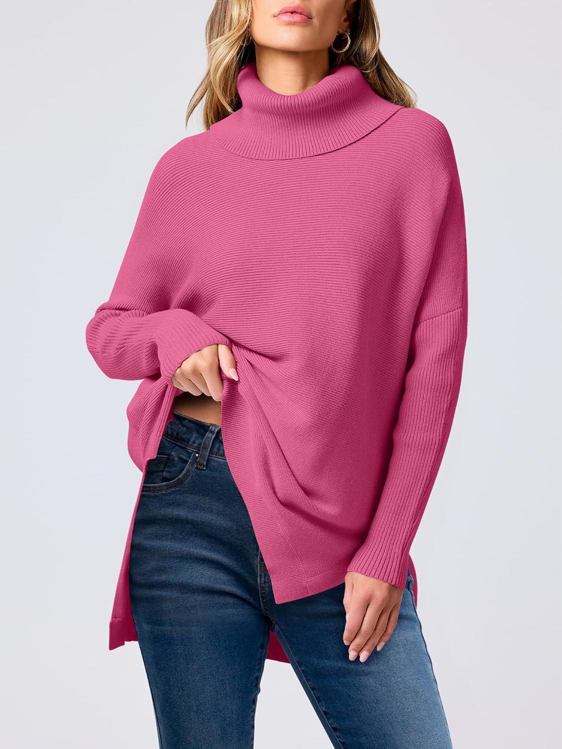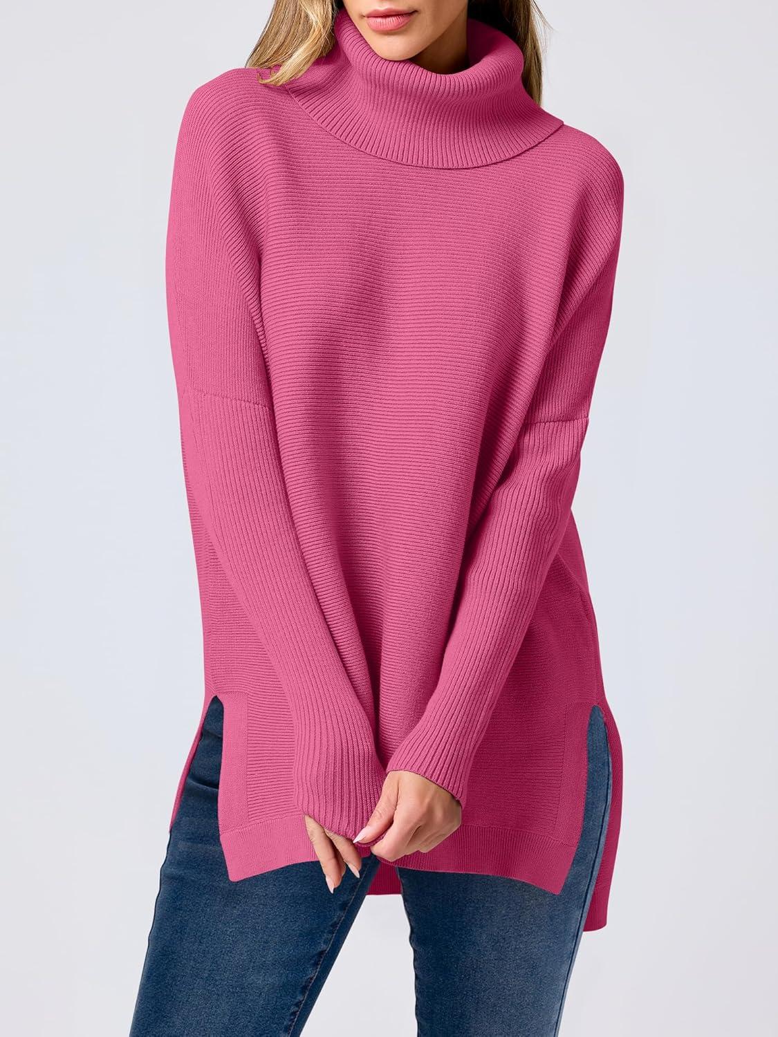 ANRABESS Women’s Oversized Turtleneck Batwing Sleeve Spilt Casual Loose Knit Tunic Pullover Sweater Tops 2025 Fall Outfits(Hot Pink)