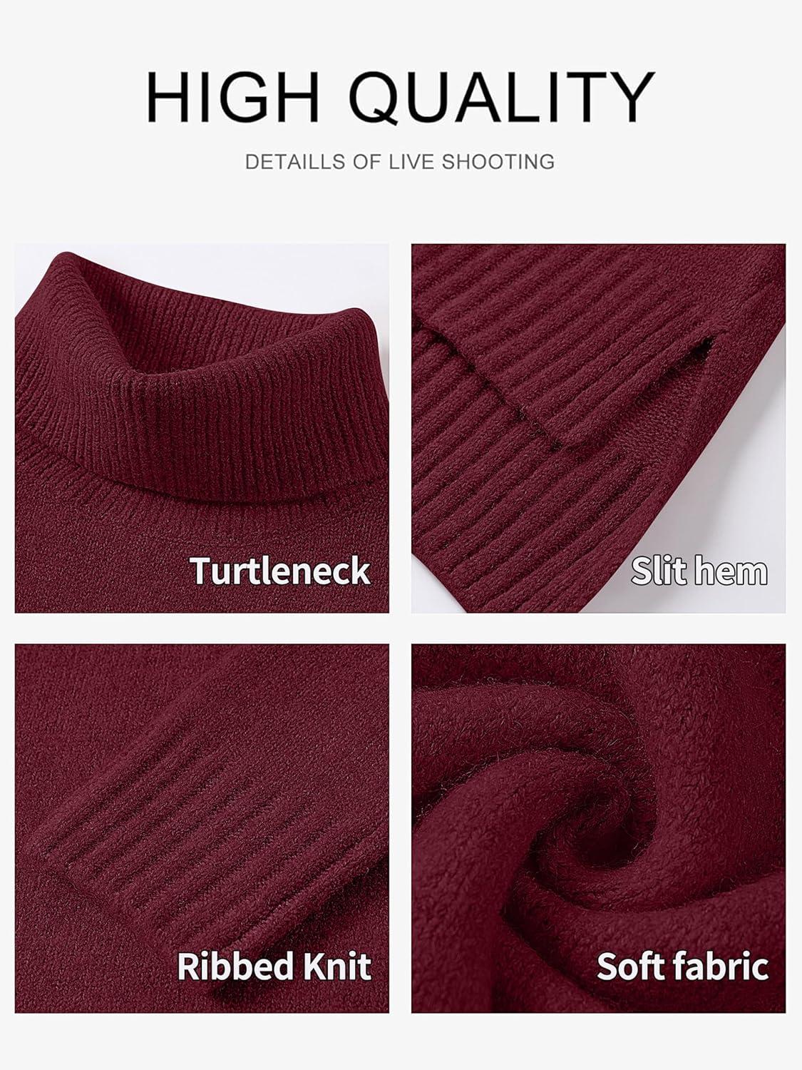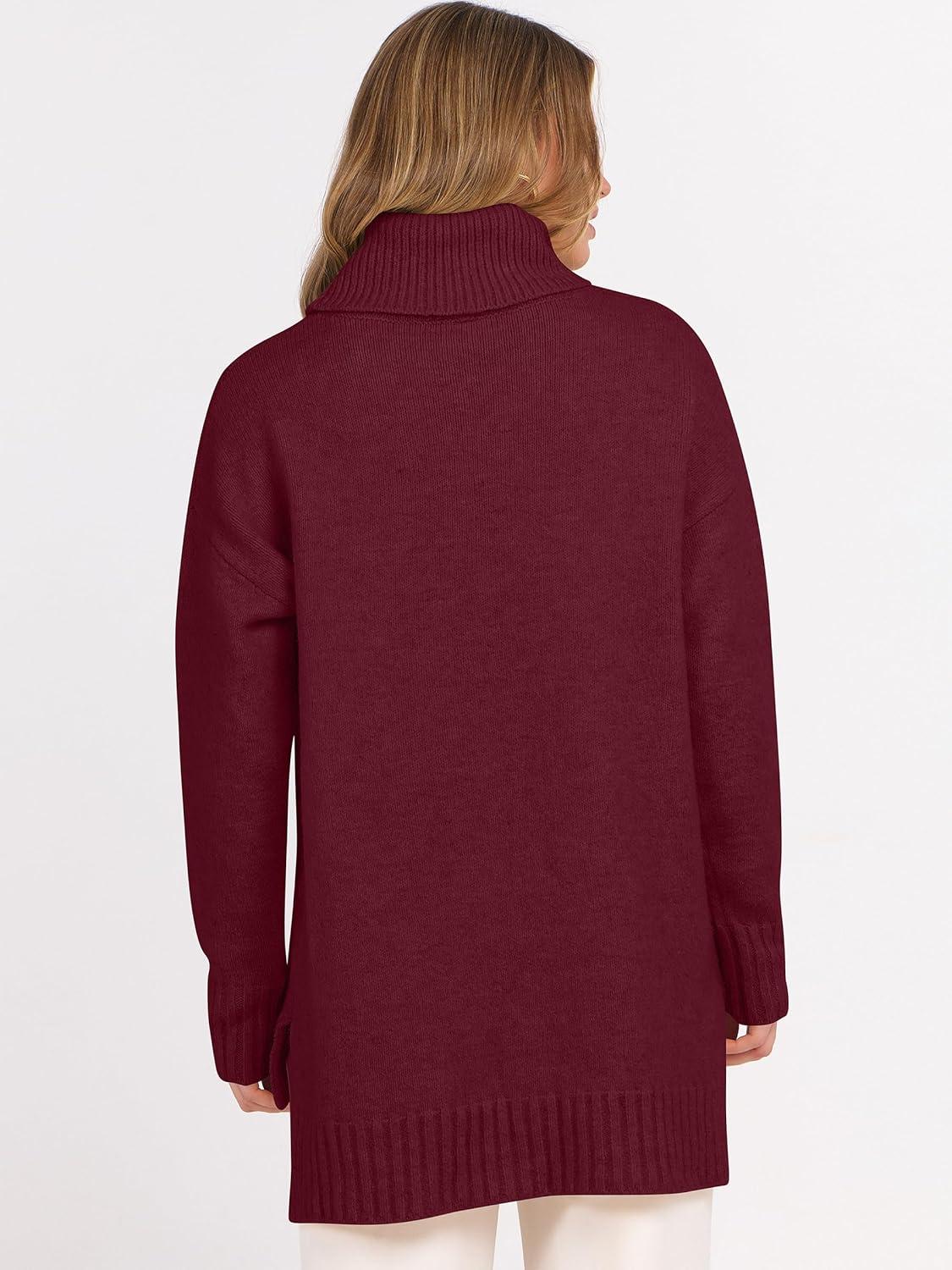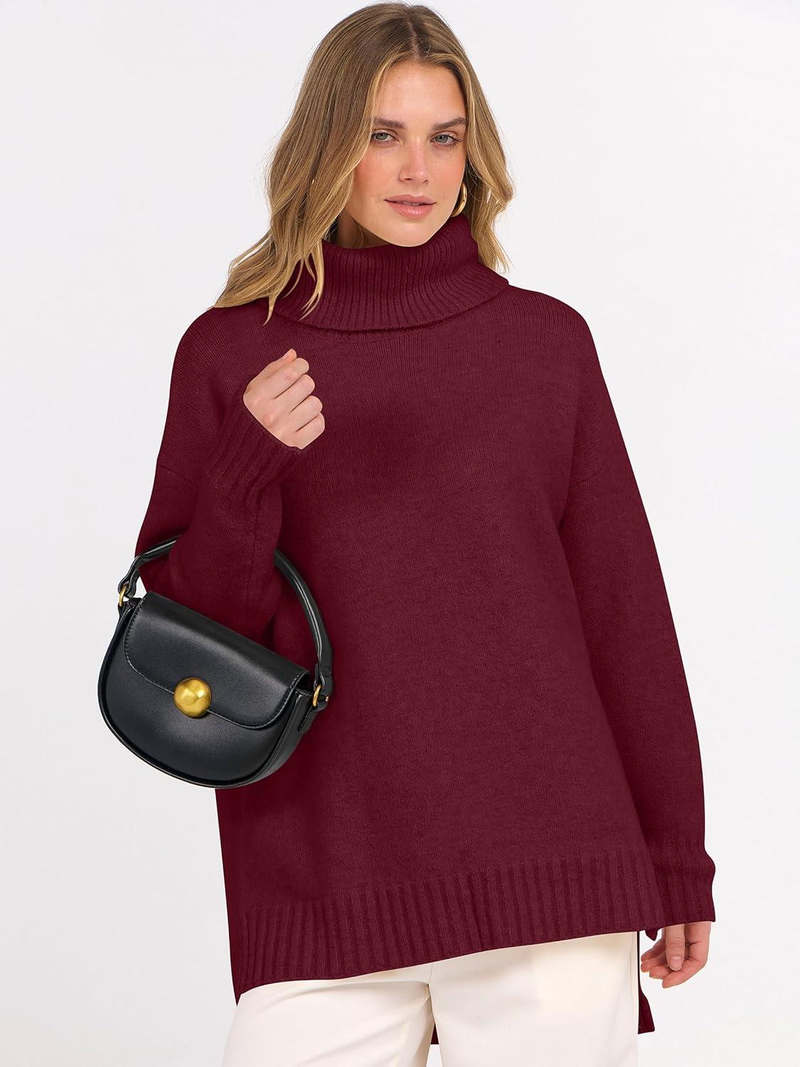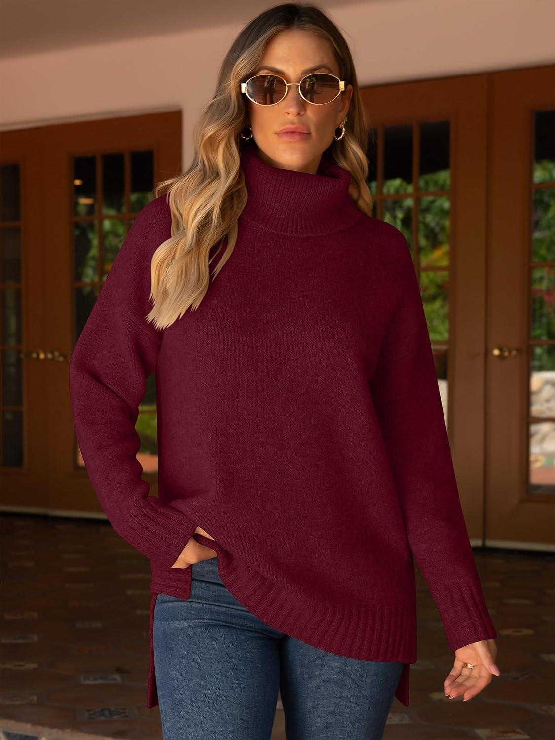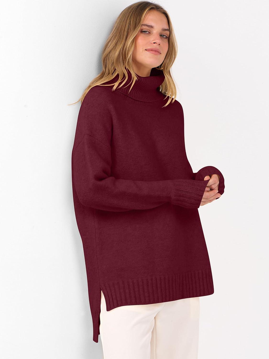 ANRABESS Womens Oversized Turtleneck Sweaters Casual Fall Long Sleeve Knit Spilt Hem Tunic Pullover Tops 2025 Winter Outfits(Berry Red)