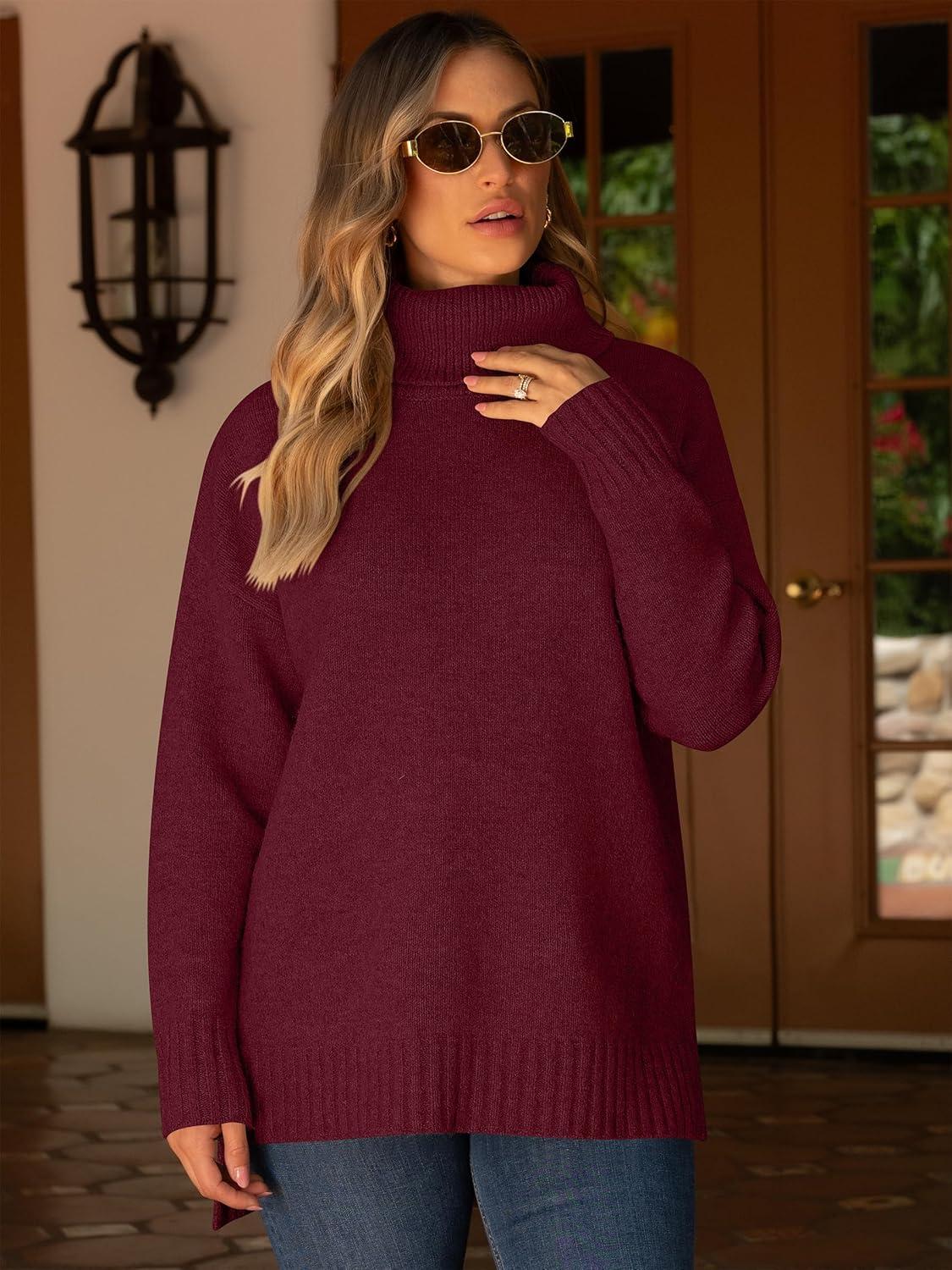 imageANRABESS Womens Oversized Turtleneck Sweaters Casual Fall Long Sleeve Knit Spilt Hem Tunic Pullover Tops 2025 Winter OutfitsBerry Red