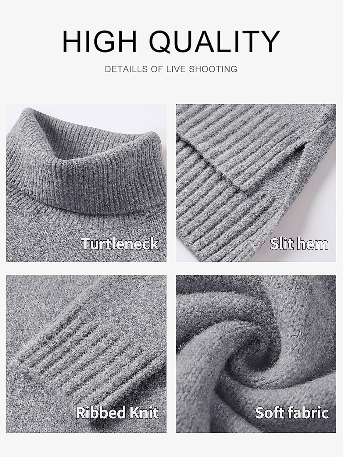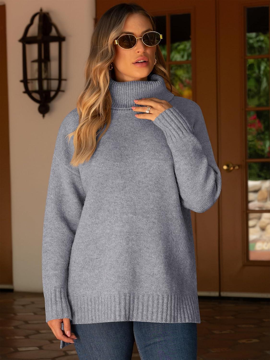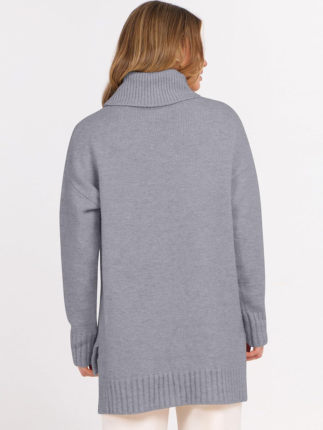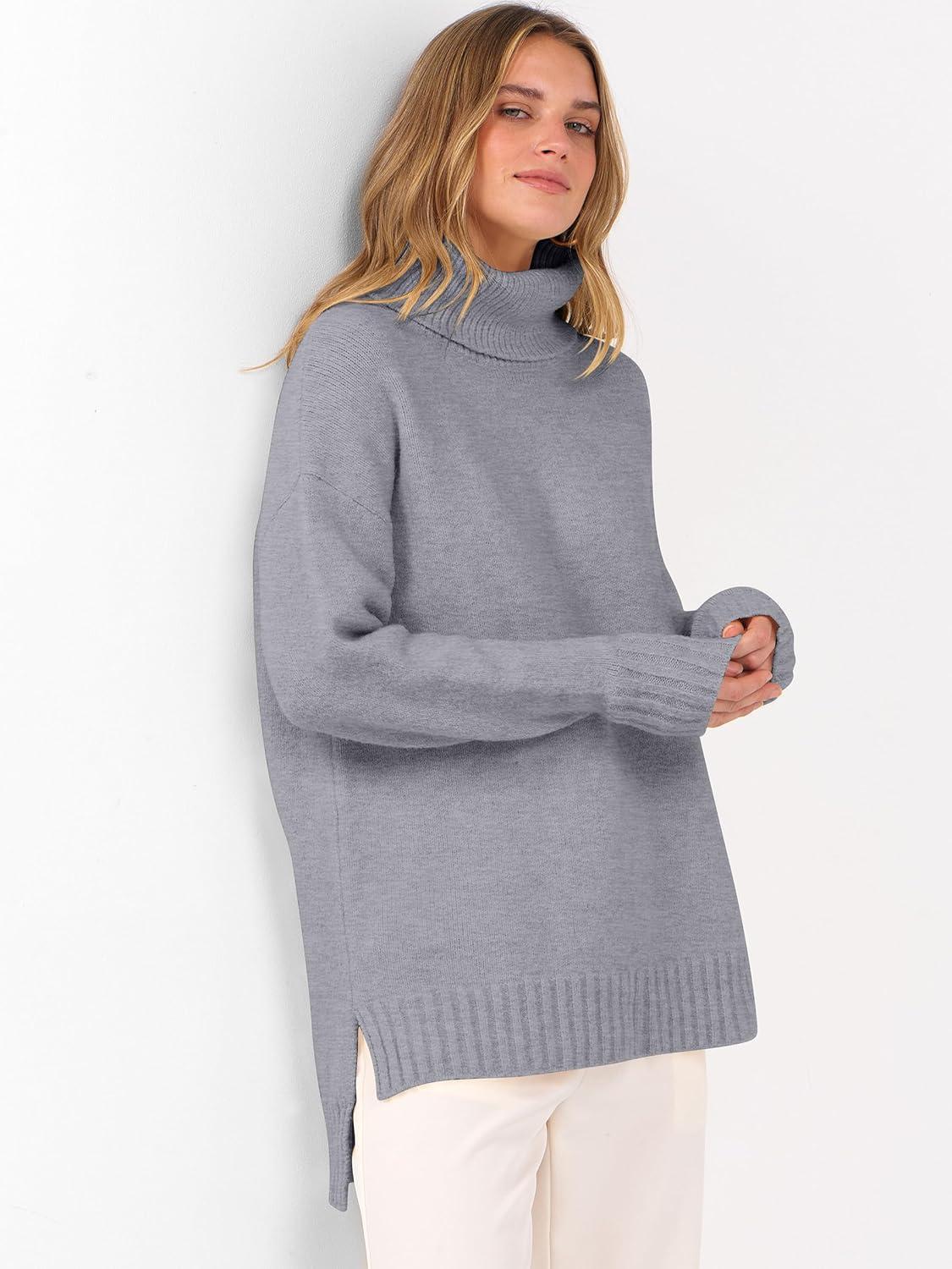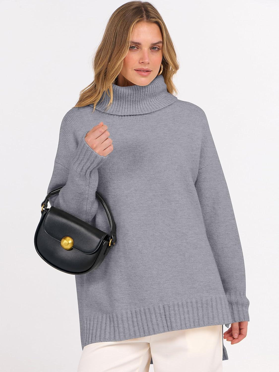 ANRABESS Womens Oversized Turtleneck Sweaters Casual Fall Long Sleeve Knit Spilt Hem Tunic Pullover Tops 2025 Winter Outfits(Grey)