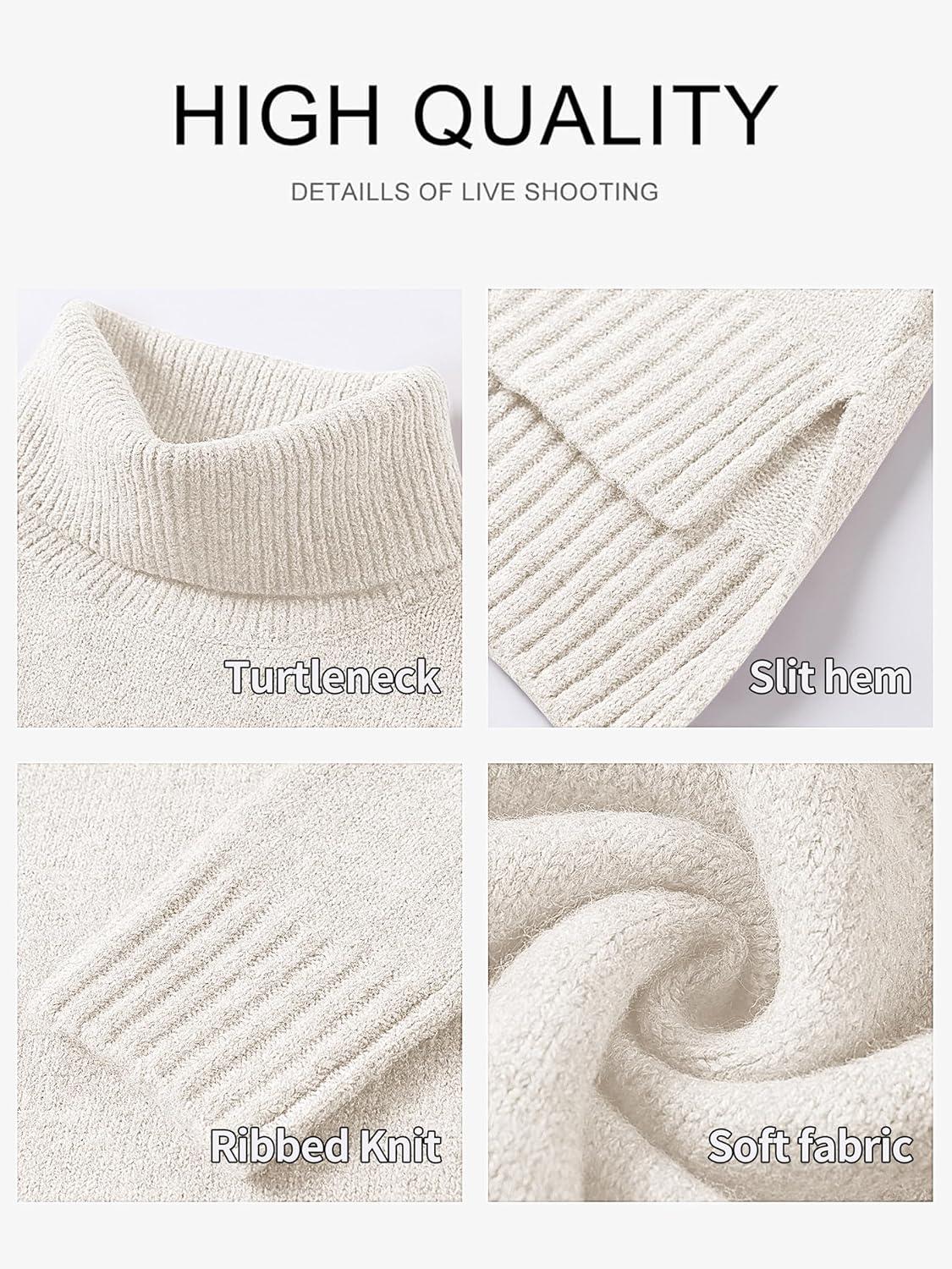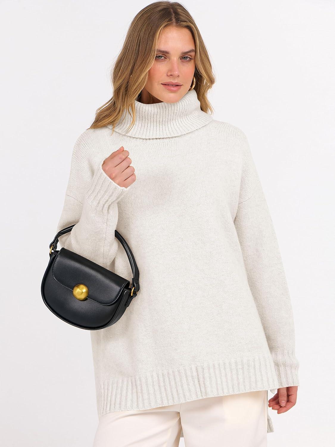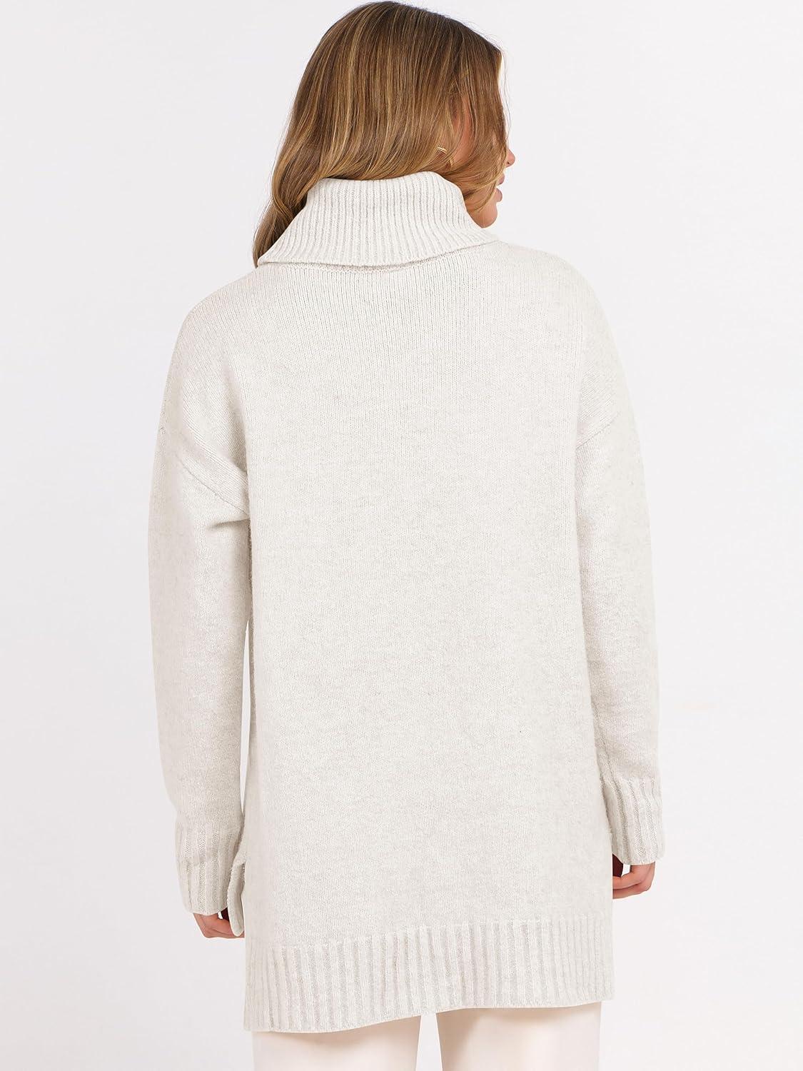 ANRABESS Womens Oversized Turtleneck Sweaters Casual Fall Long Sleeve Knit Spilt Hem Tunic Pullover Tops 2025 Winter Outfits(White)