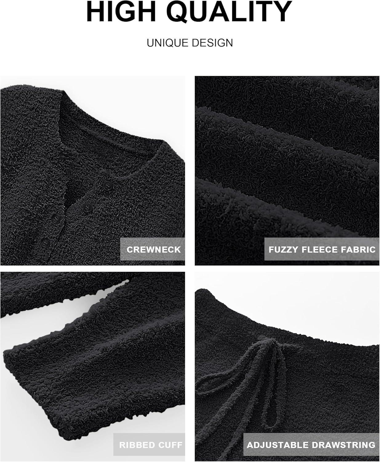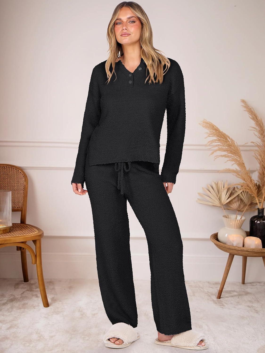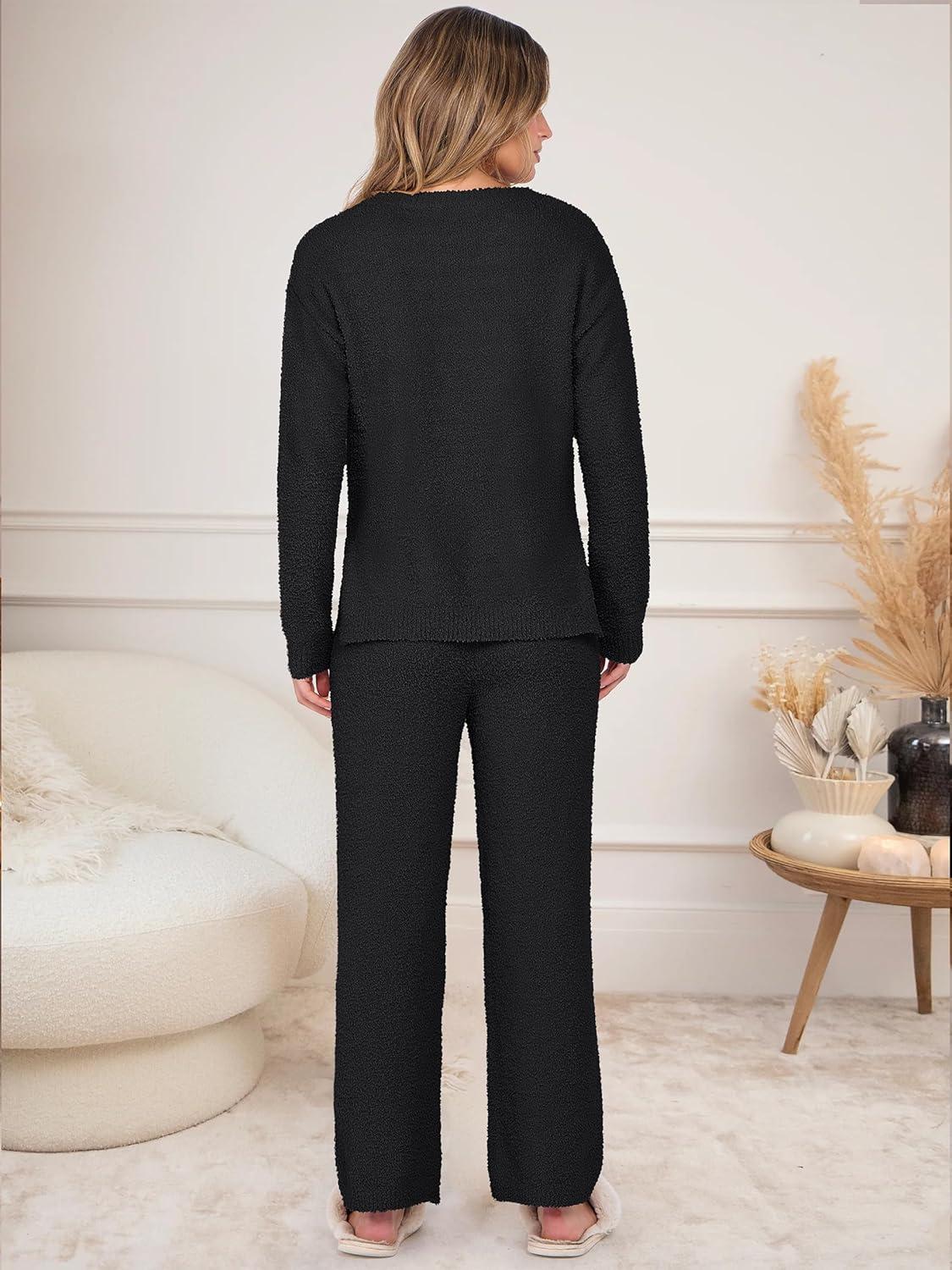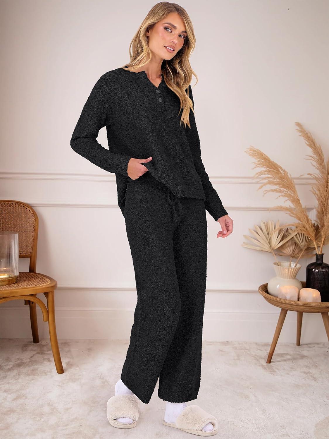 ANRABESS Womens Pajama Fuzzy Fleece 2 Piece Long Sleeve Top Wide Leg Pants Lounge Matching Pj Sets 2025 Fall Winter Outfits(Black)