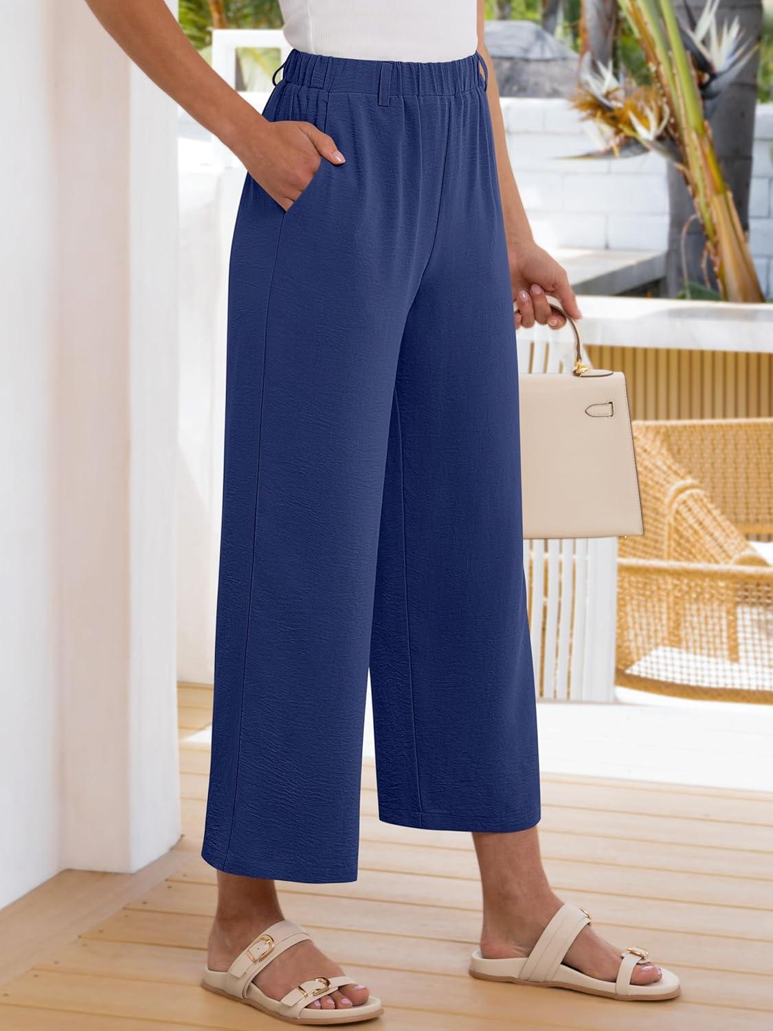 ANRABESS Women's Pants Wide Leg Elastic Waist Casual Cropped Palazzo Pants 2025 Beach Vacation Summer Trousers with Pocket(Navy Blue)