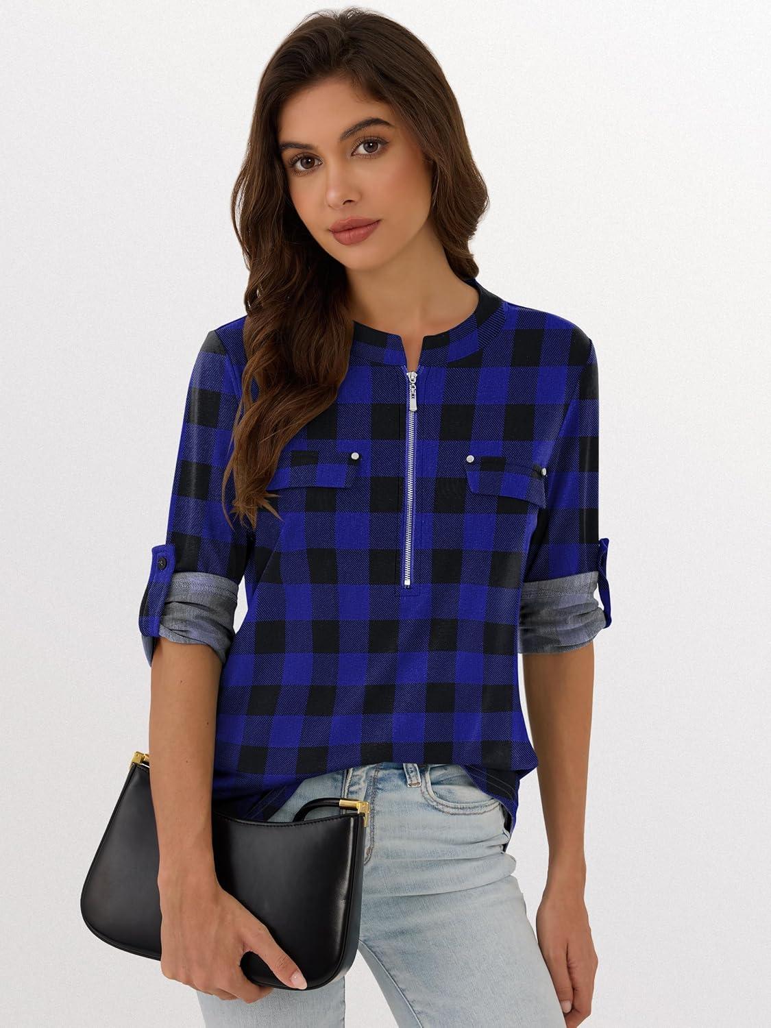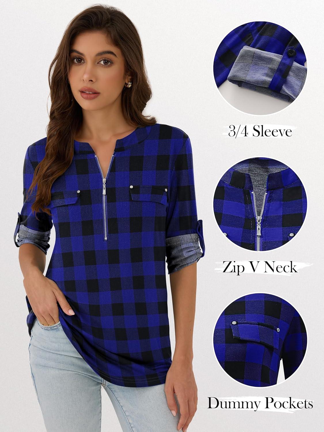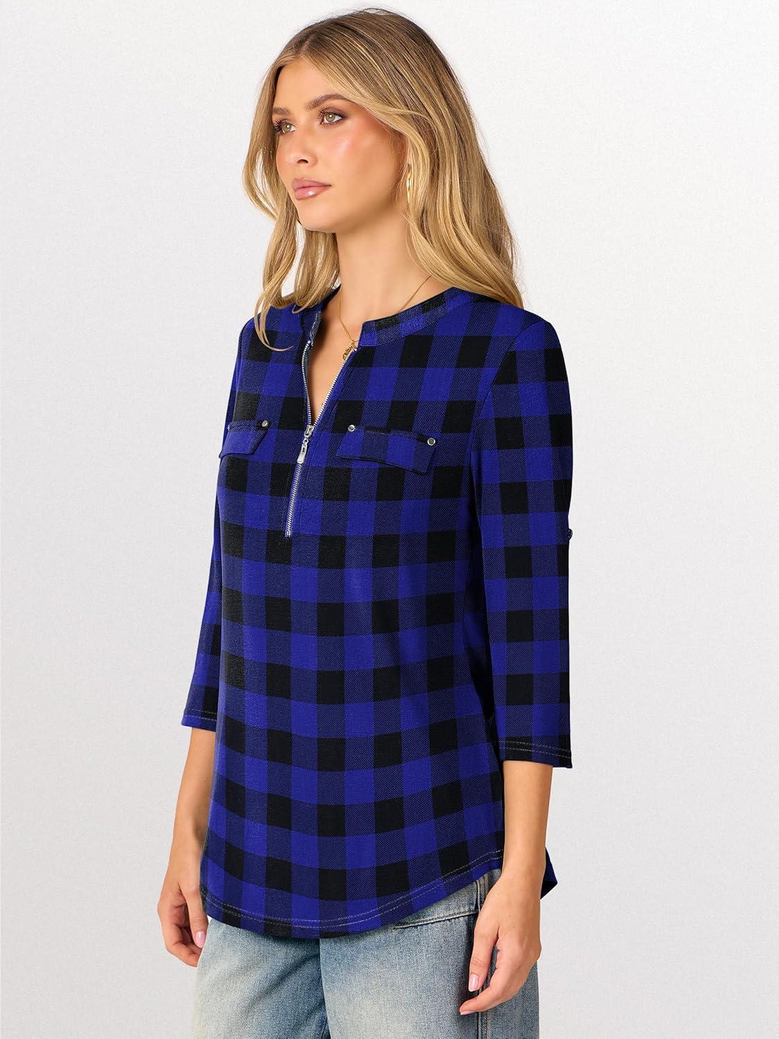 ANRABESS Womens Plaid Shirts 3/4 Length Sleeve Half Zip Business Casual Tops Office Work Blouses 2025 Fall Outfits