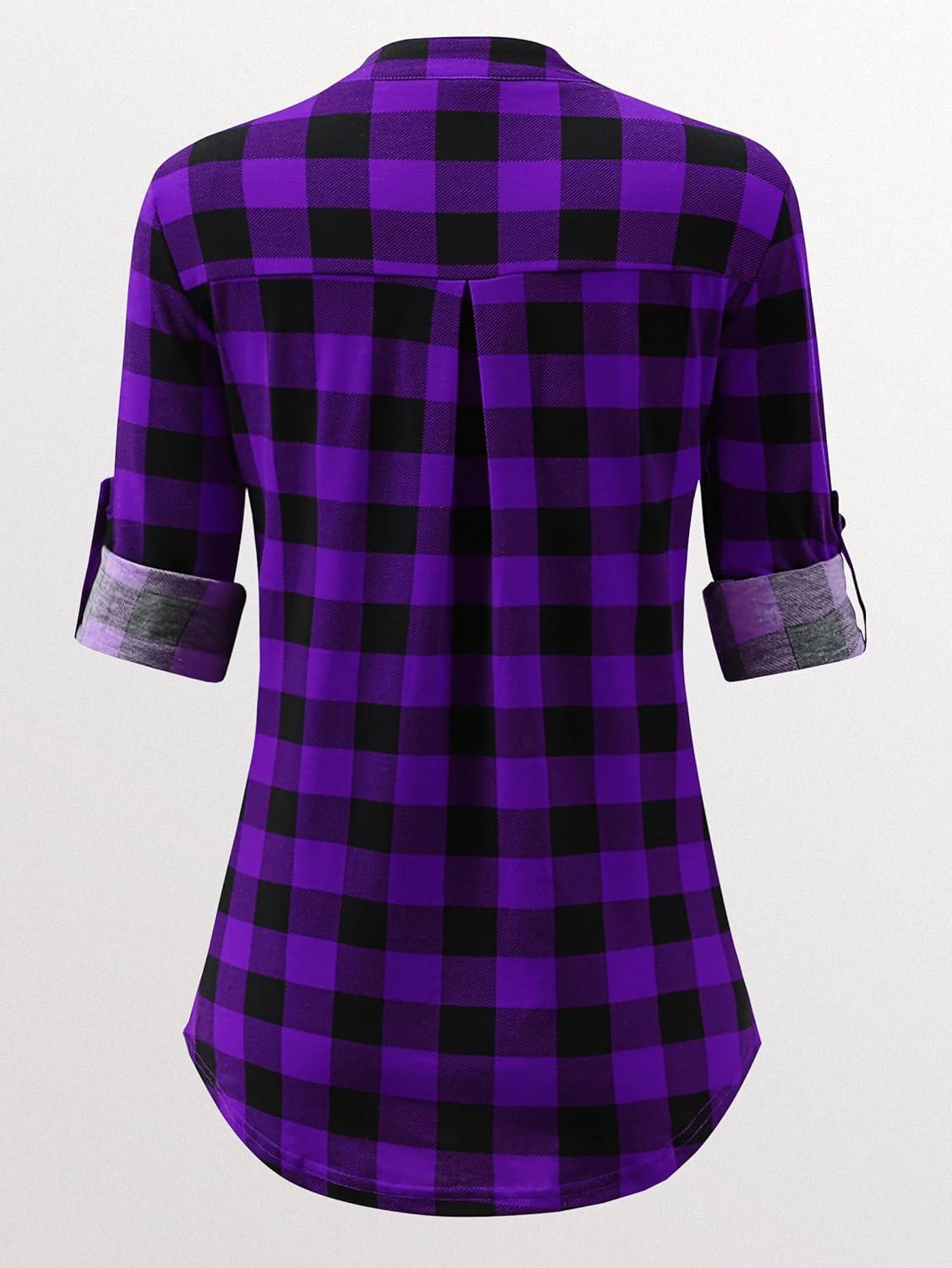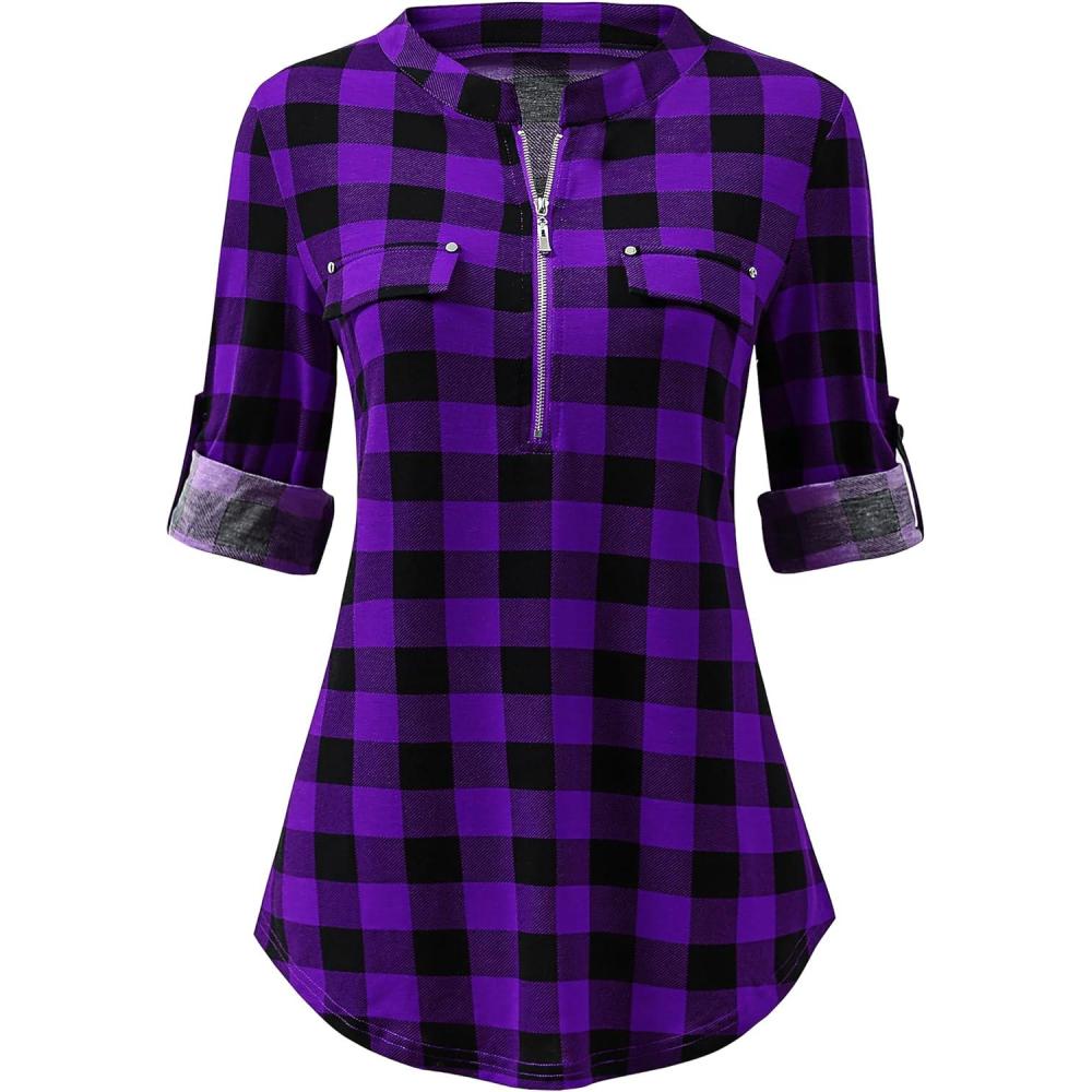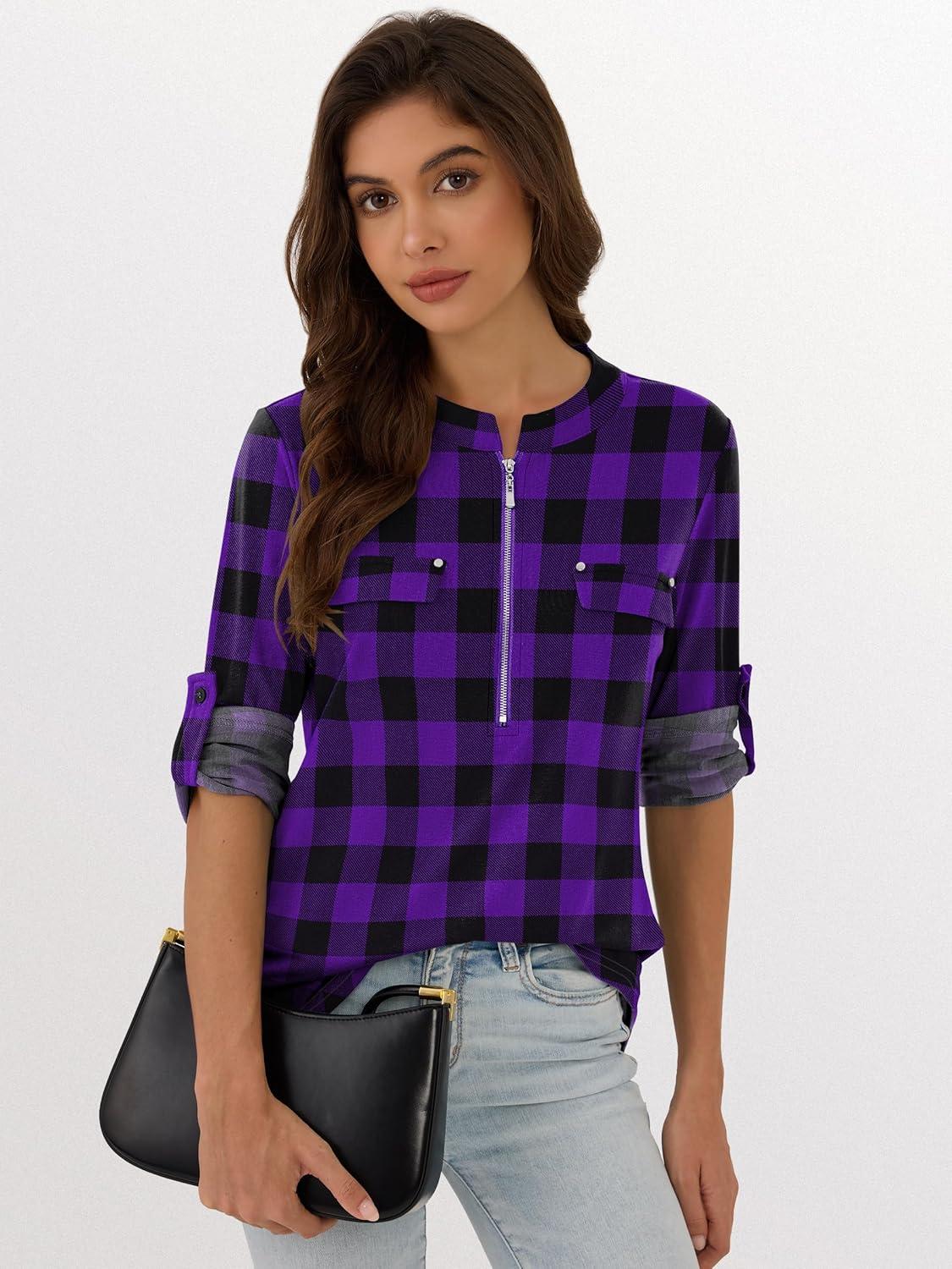 imageANRABESS Womens Plaid Shirts 34 Length Sleeve Half Zip Business Casual Tops Office Work Blouses 2025 Fall OutfitsPurple Plaid