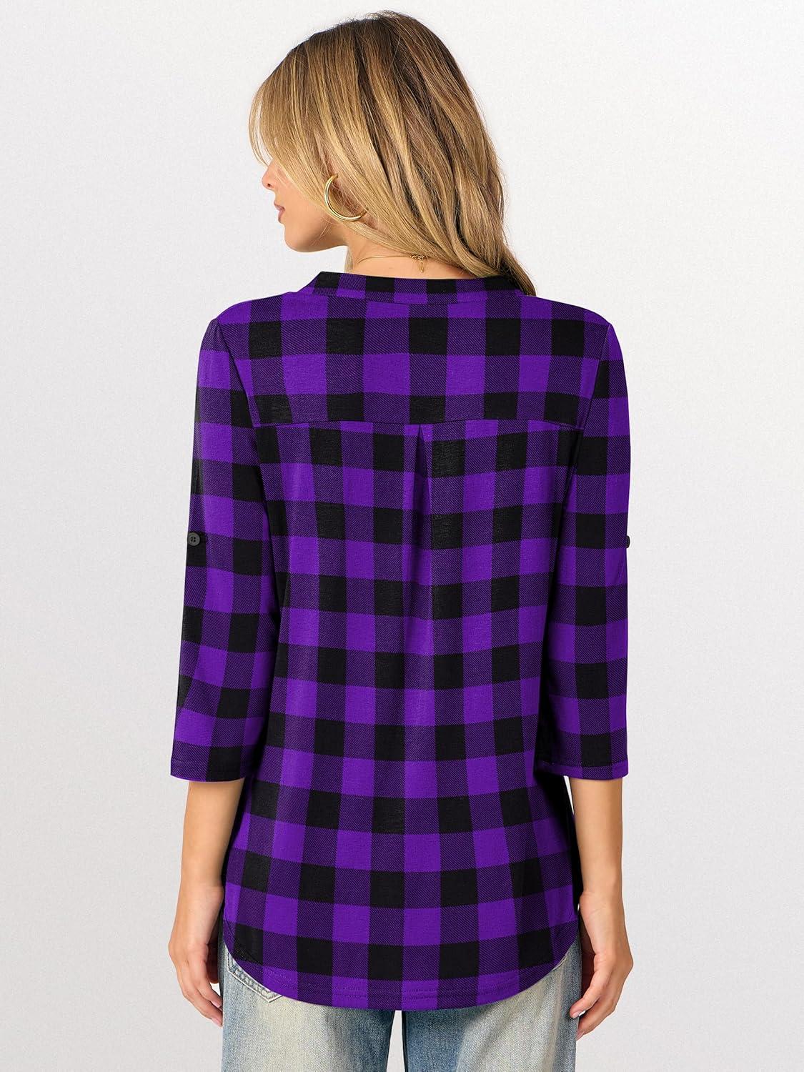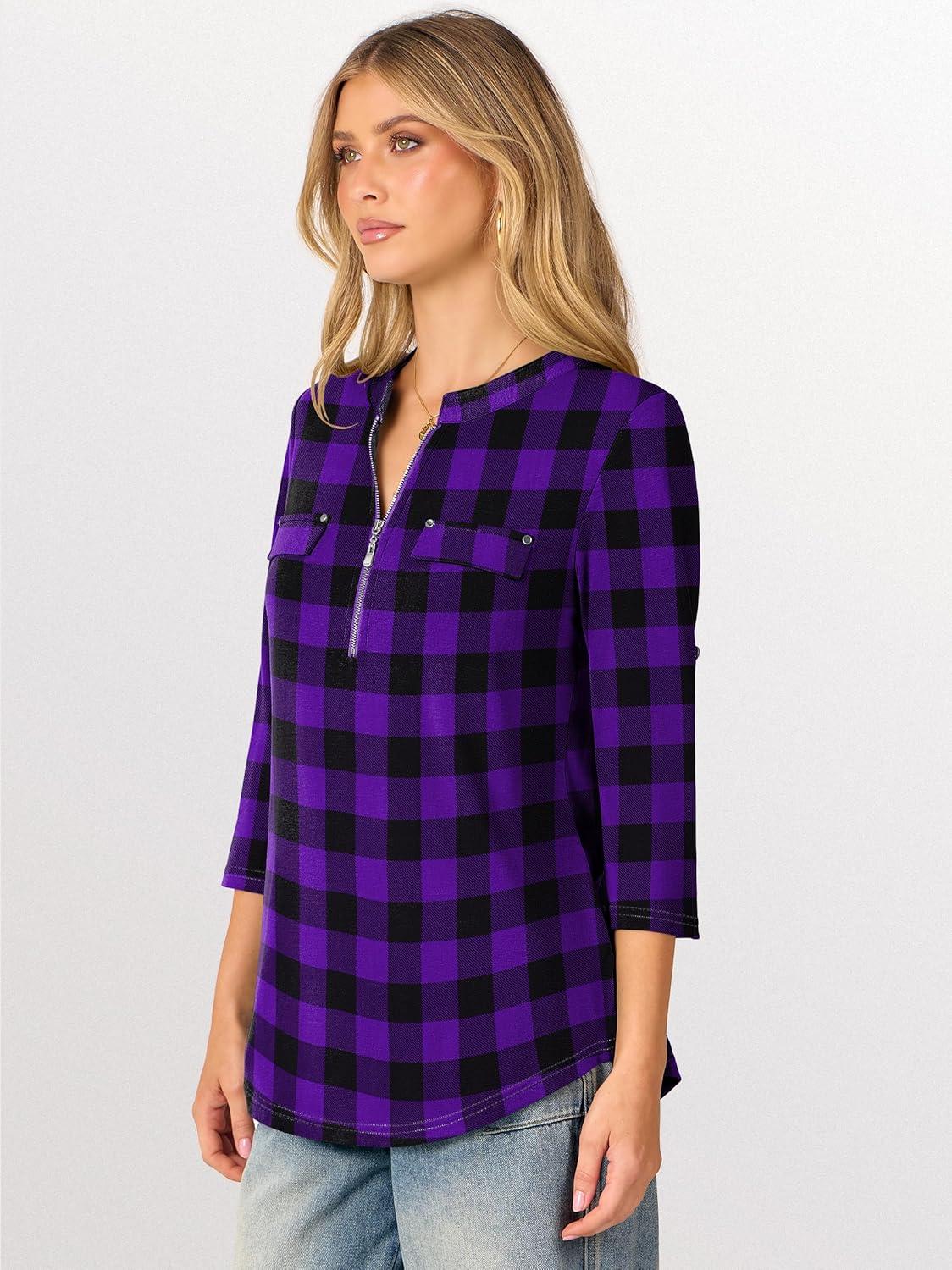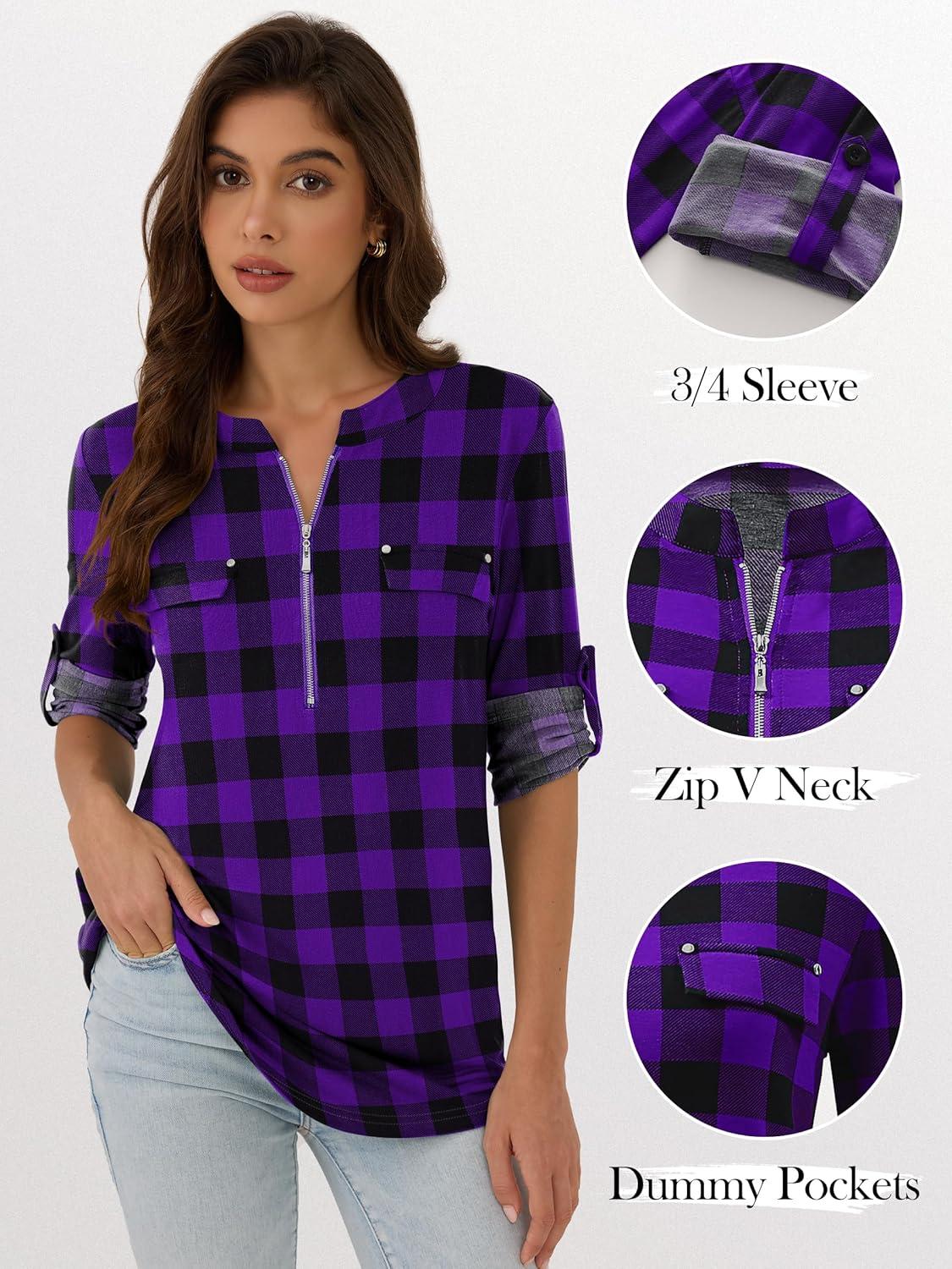 ANRABESS Womens Plaid Shirts 3/4 Length Sleeve Half Zip Business Casual Tops Office Work Blouses 2025 Fall Outfits(Purple Plaid)