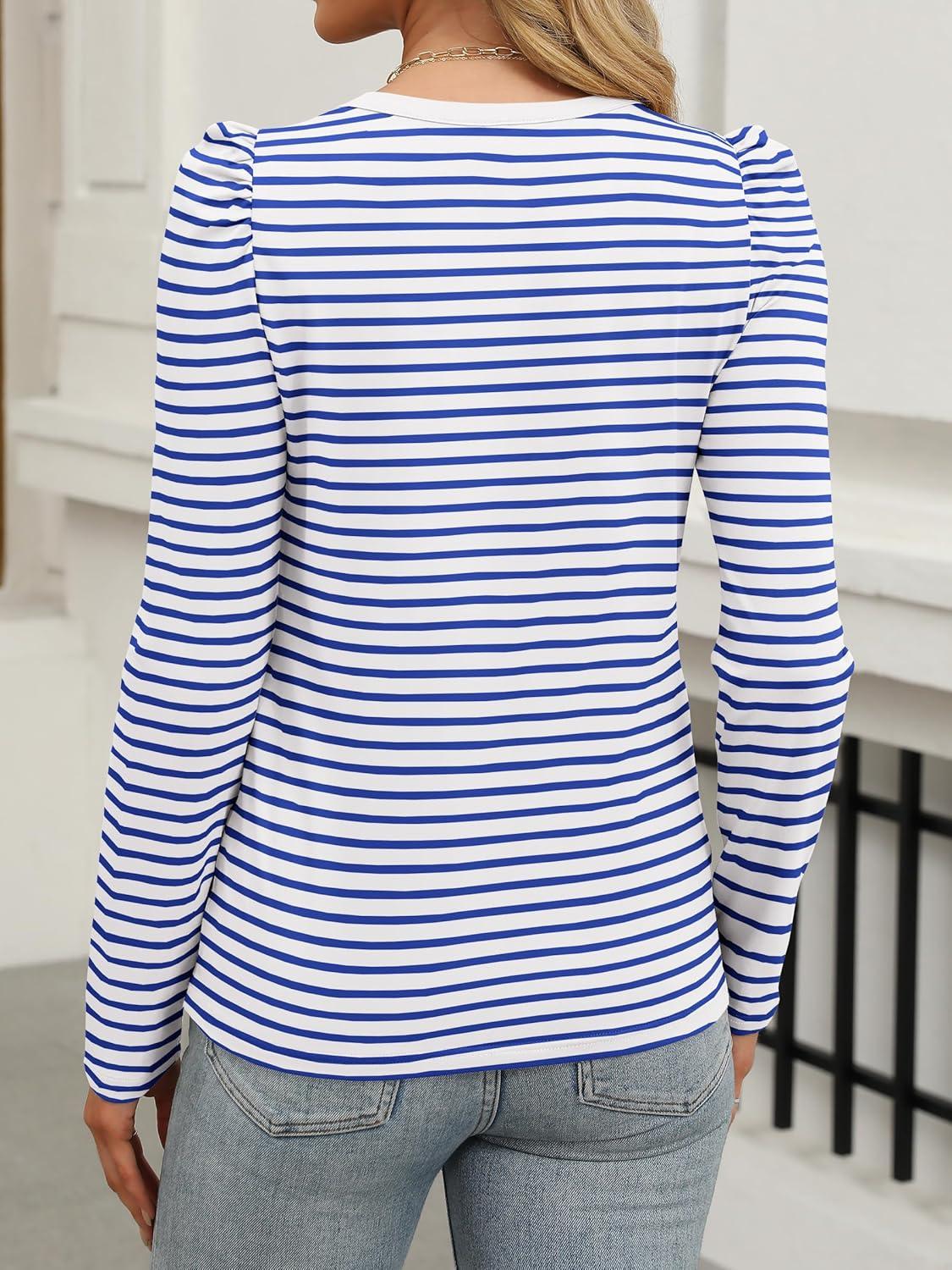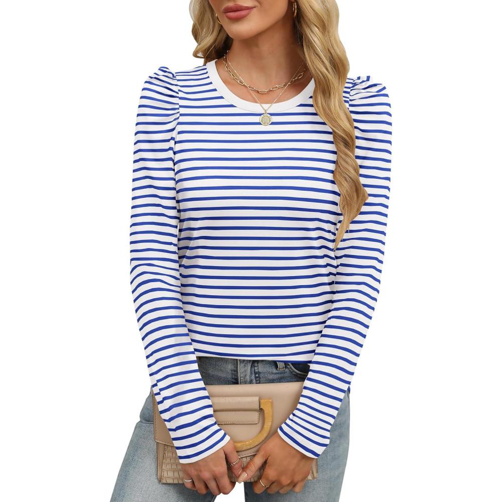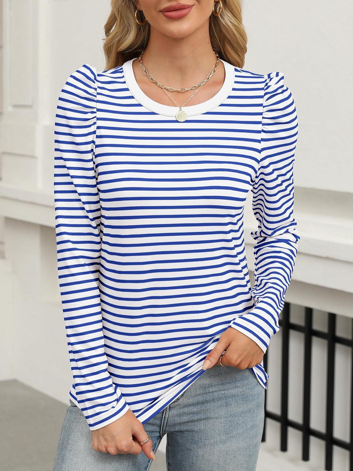 ANRABESS Womens Puff Long Sleeve Shirts Crewneck Fall Tops Basic Dressy Casual Blouses 2025 Trendy Outfits(Stripe Blue)