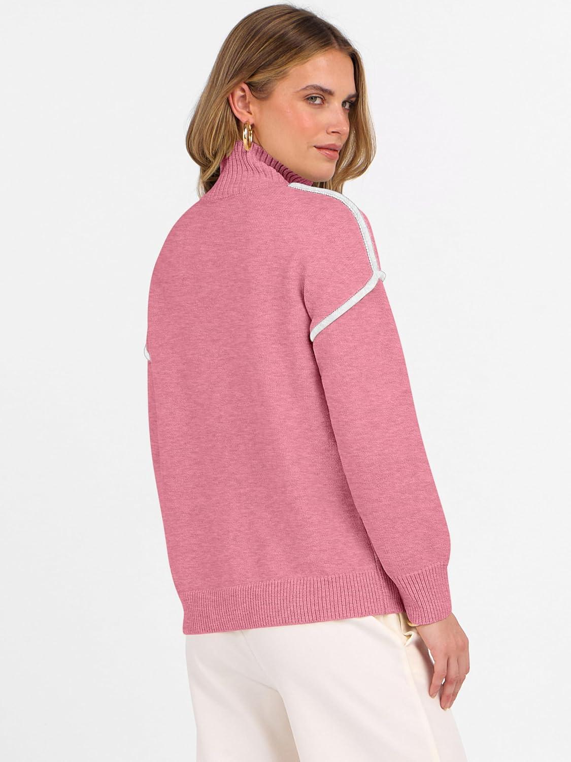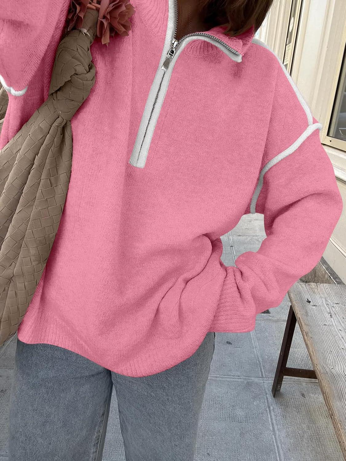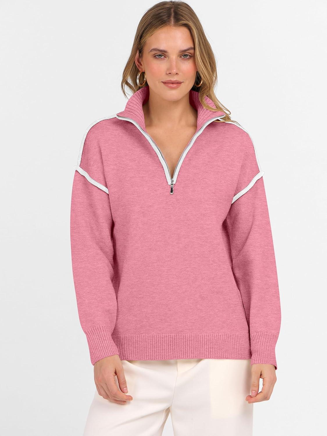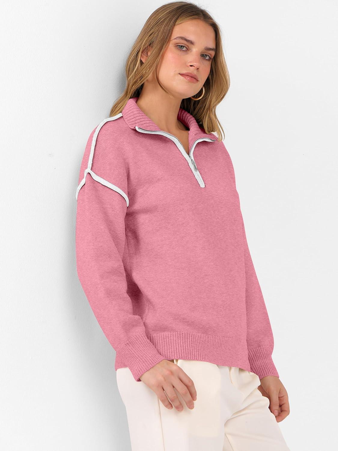 ANRABESS Womens Quarter Zip Sweaters Fall Long Sleeve V Neck Shirts Collared Business Casual Tops Knit Pullover Sweatshirts(Coral Pink)