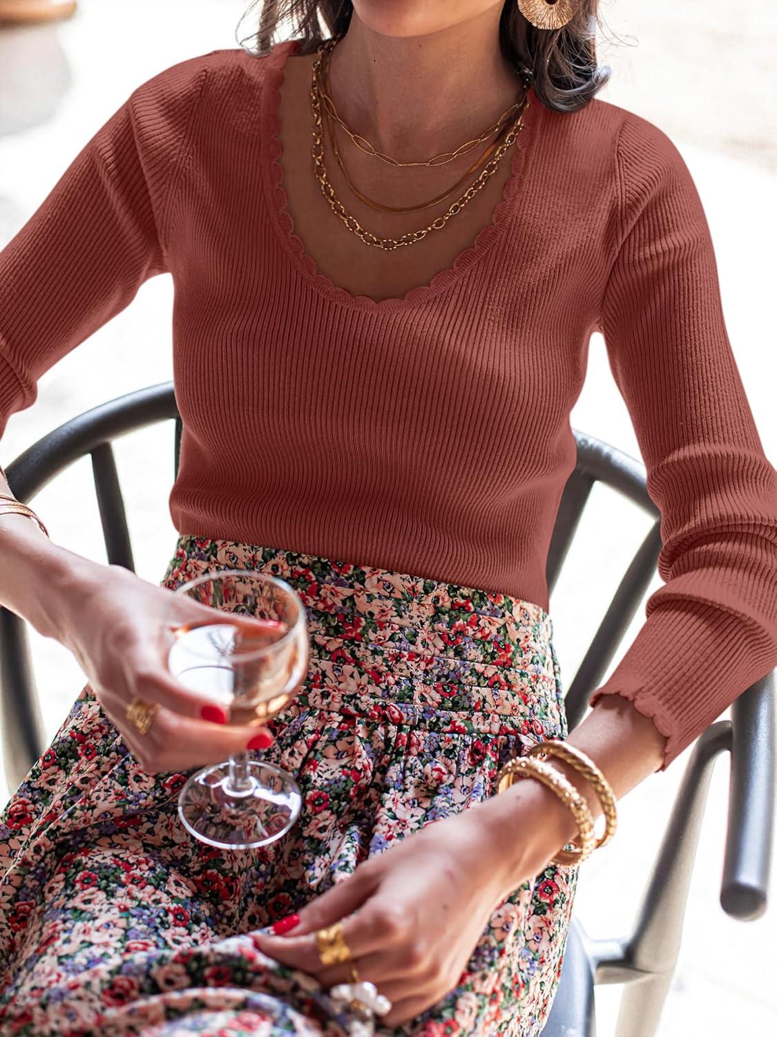 ANRABESS Womens Ribbed Fitted Sweater Long Sleeve Shirts Scoop Neck Lightweight Casual Knit Slim Tops 2025 Fall Outfits(Rust)