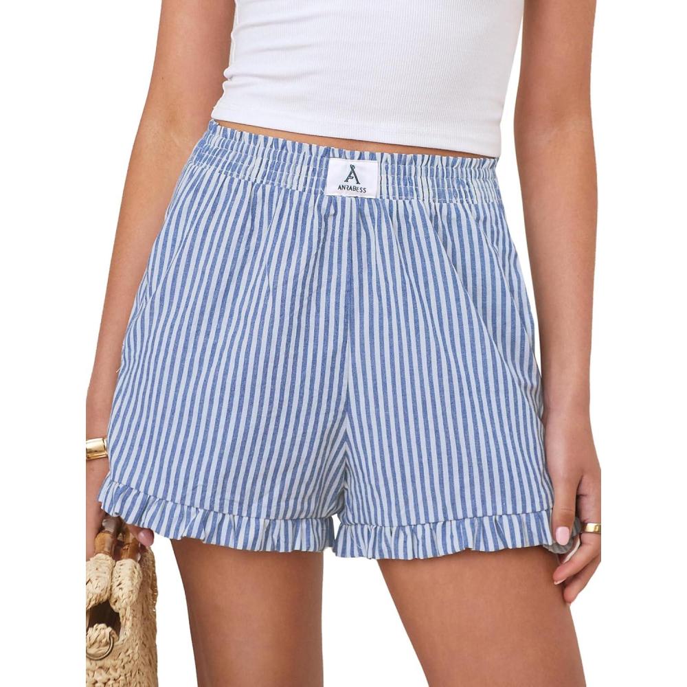 ANRABESS Womens Ruffle Boxer Shorts Pajama Gingham Shorts Summer Casual Lounge Sleep Plaid Beach Bottoms Pockets 2026 Trendy(Blue White Stripe)
