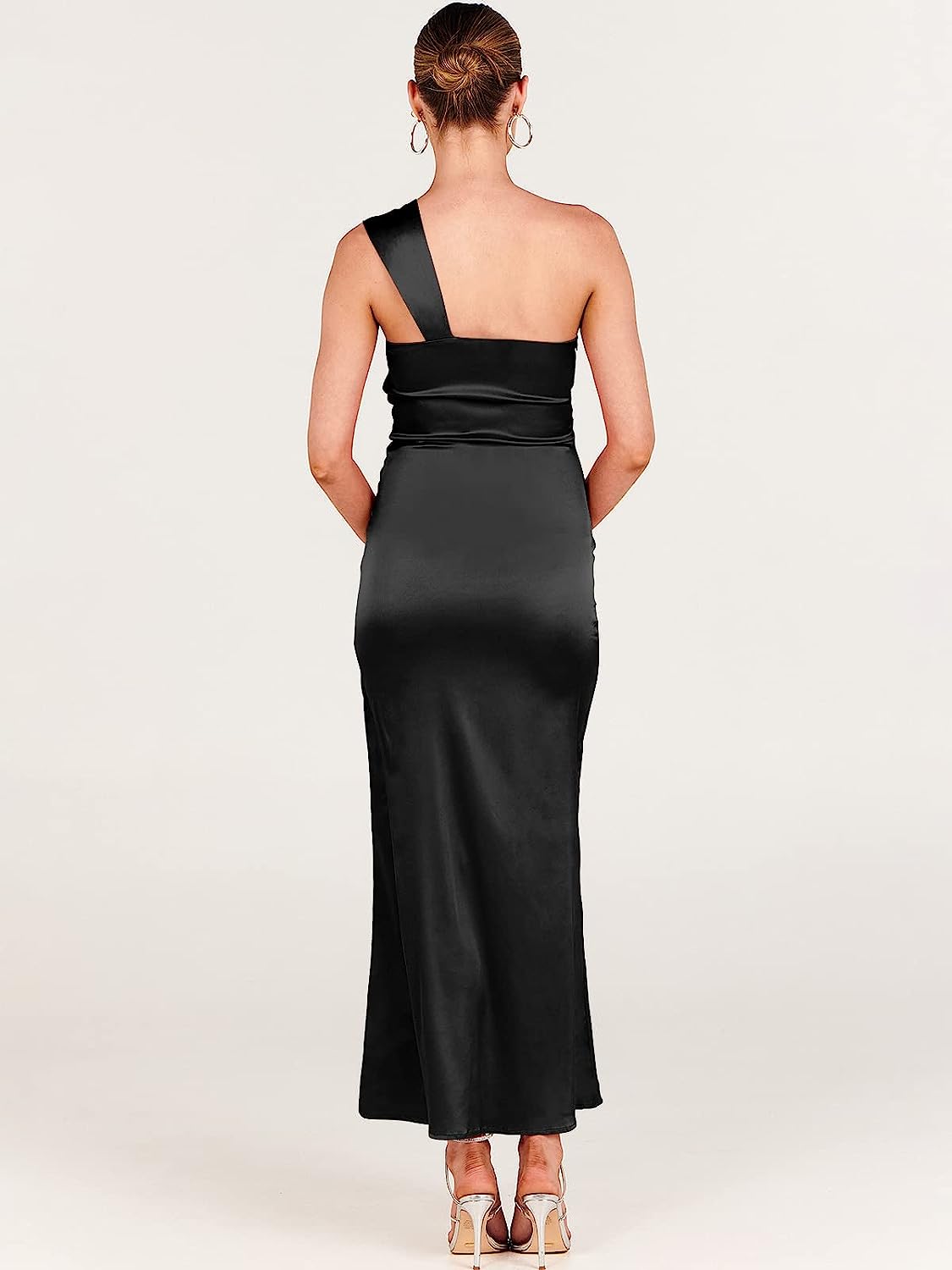 ANRABESS Women’s Satin One Shoulder Wedding Guest Bodycon Dress Cocktail Evening Party Maxi Dresses(Black)