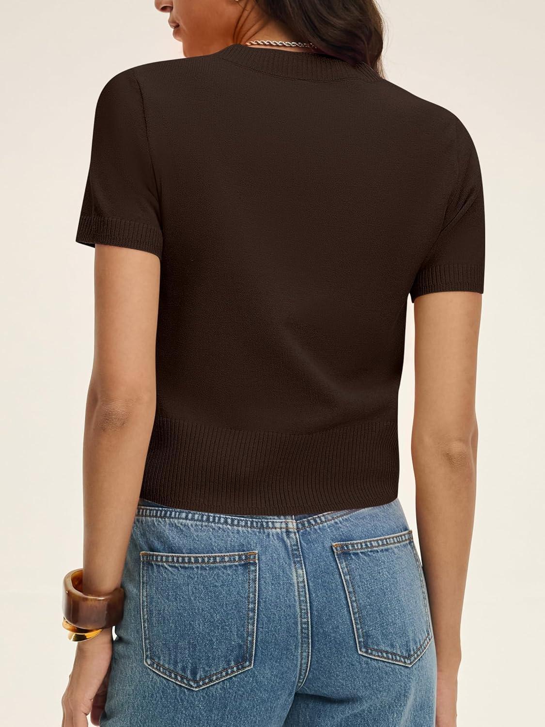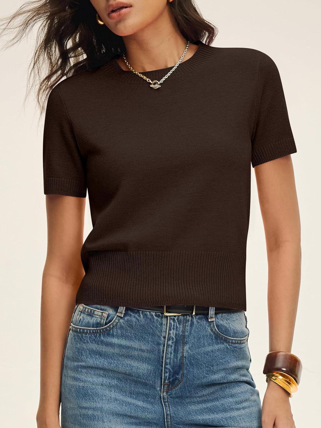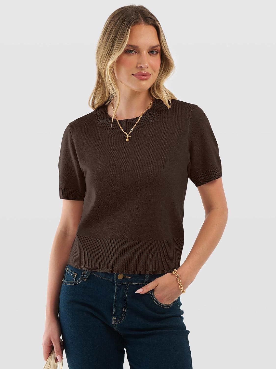 image:imageANRABESS Womens Short Sleeve Sweaters Cropped Crew Neck Business Casual Lightweight Sweater Tops 2026 Spring Summer OutfitsCoffee