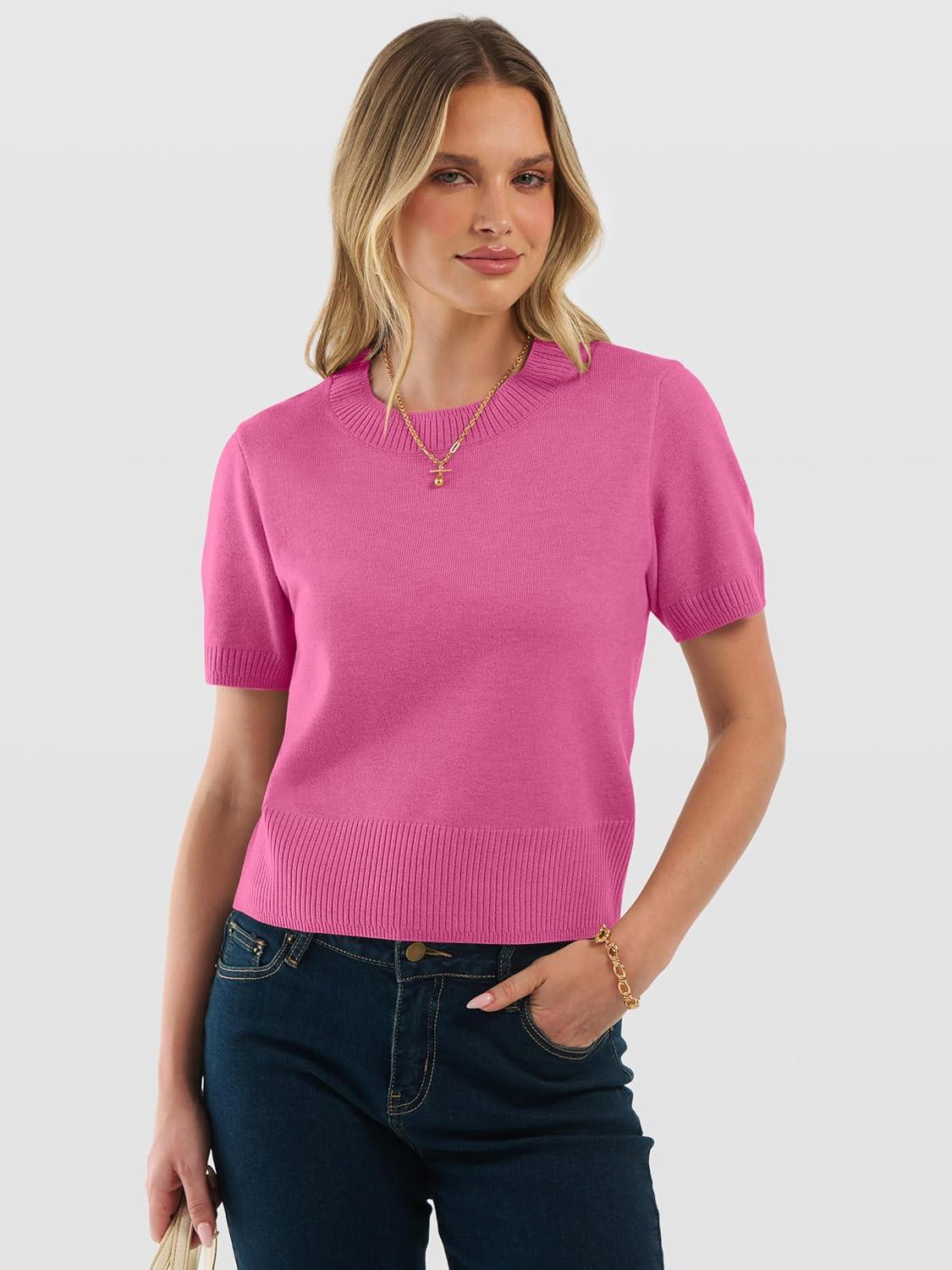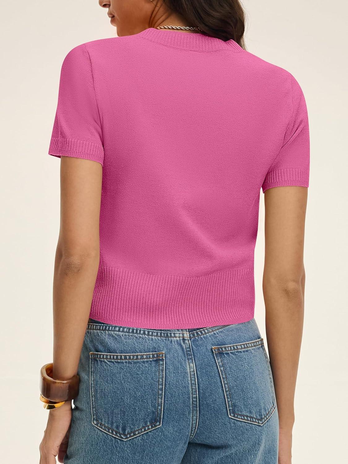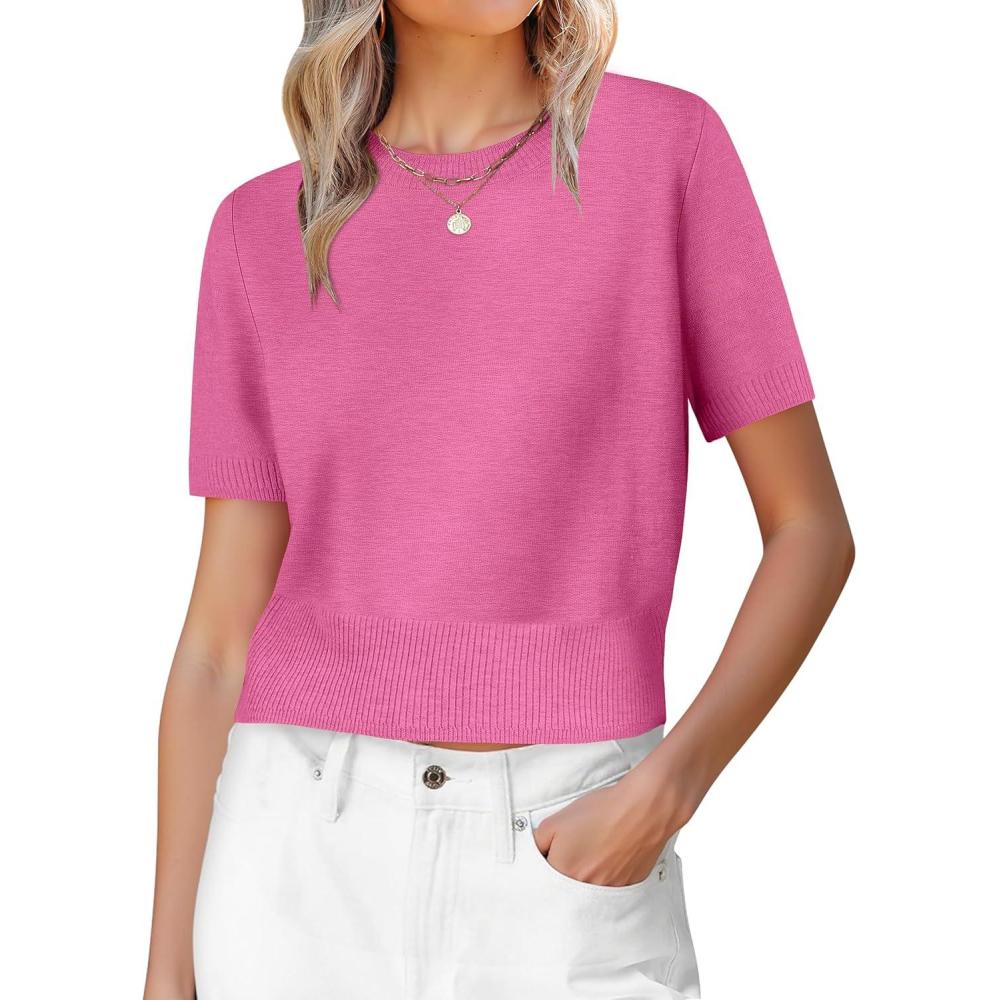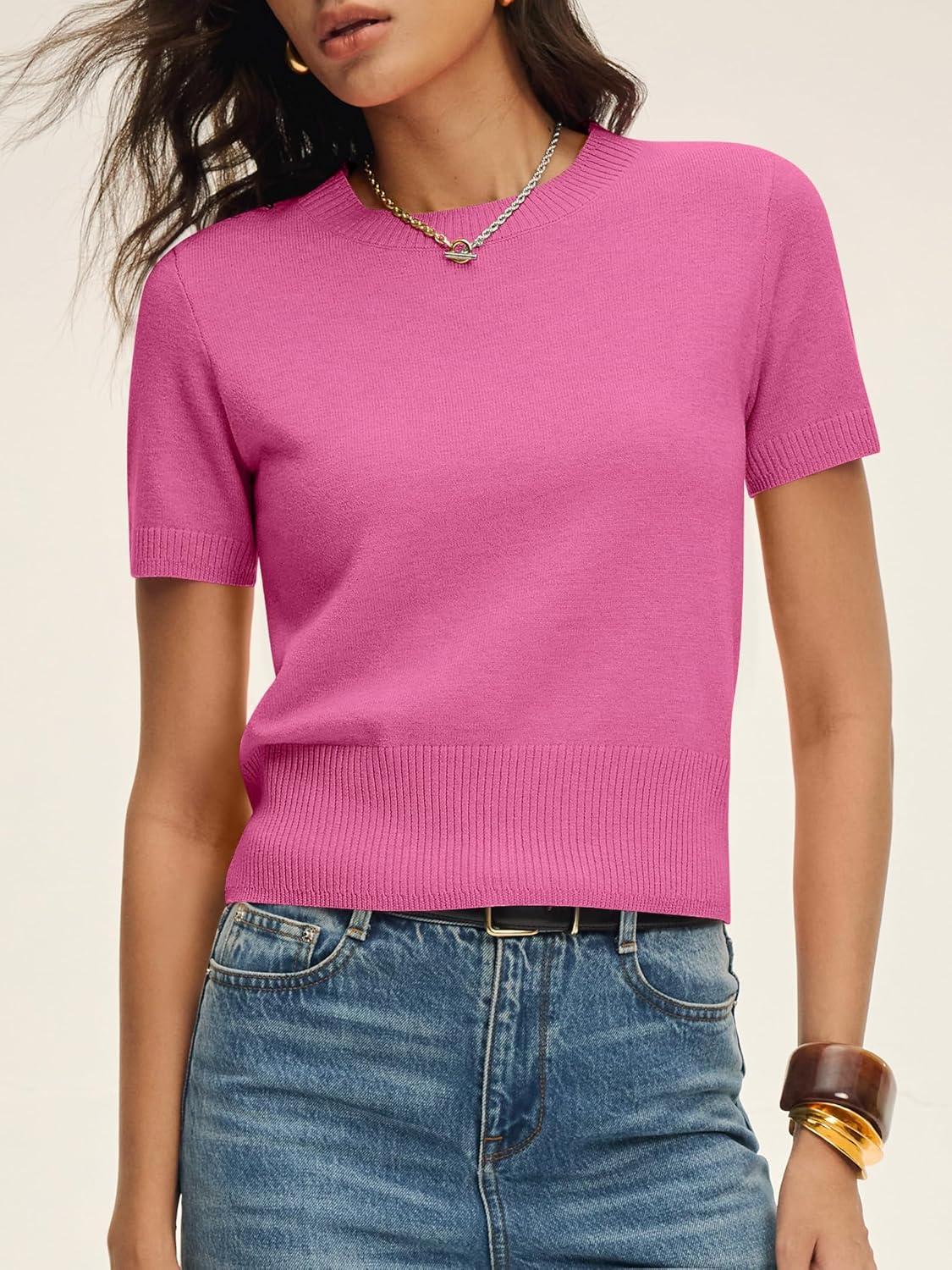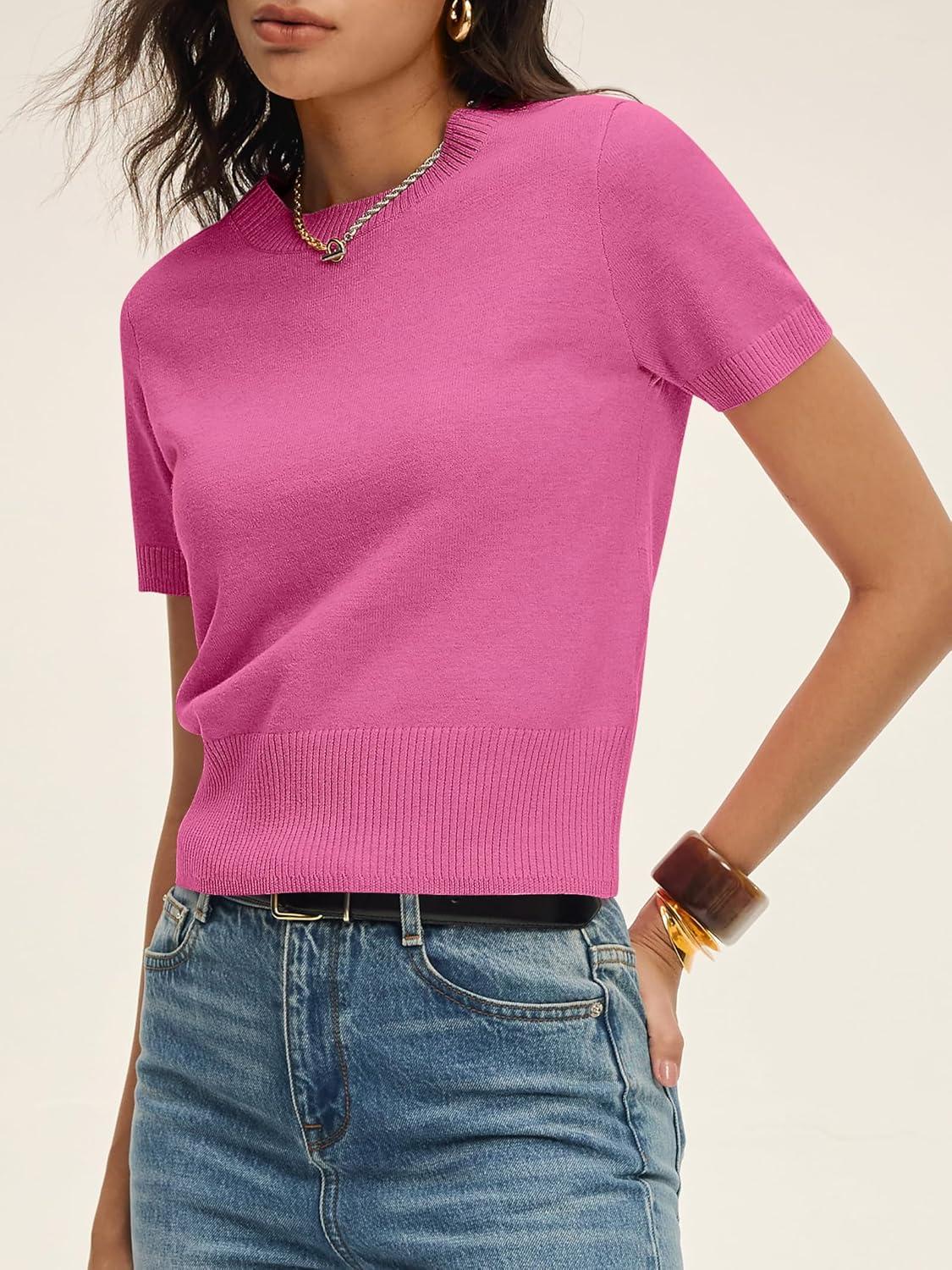 ANRABESS Womens Short Sleeve Sweaters Cropped Crew Neck Business Casual Lightweight Sweater Tops 2026 Spring Summer Outfits(Hot Pink)