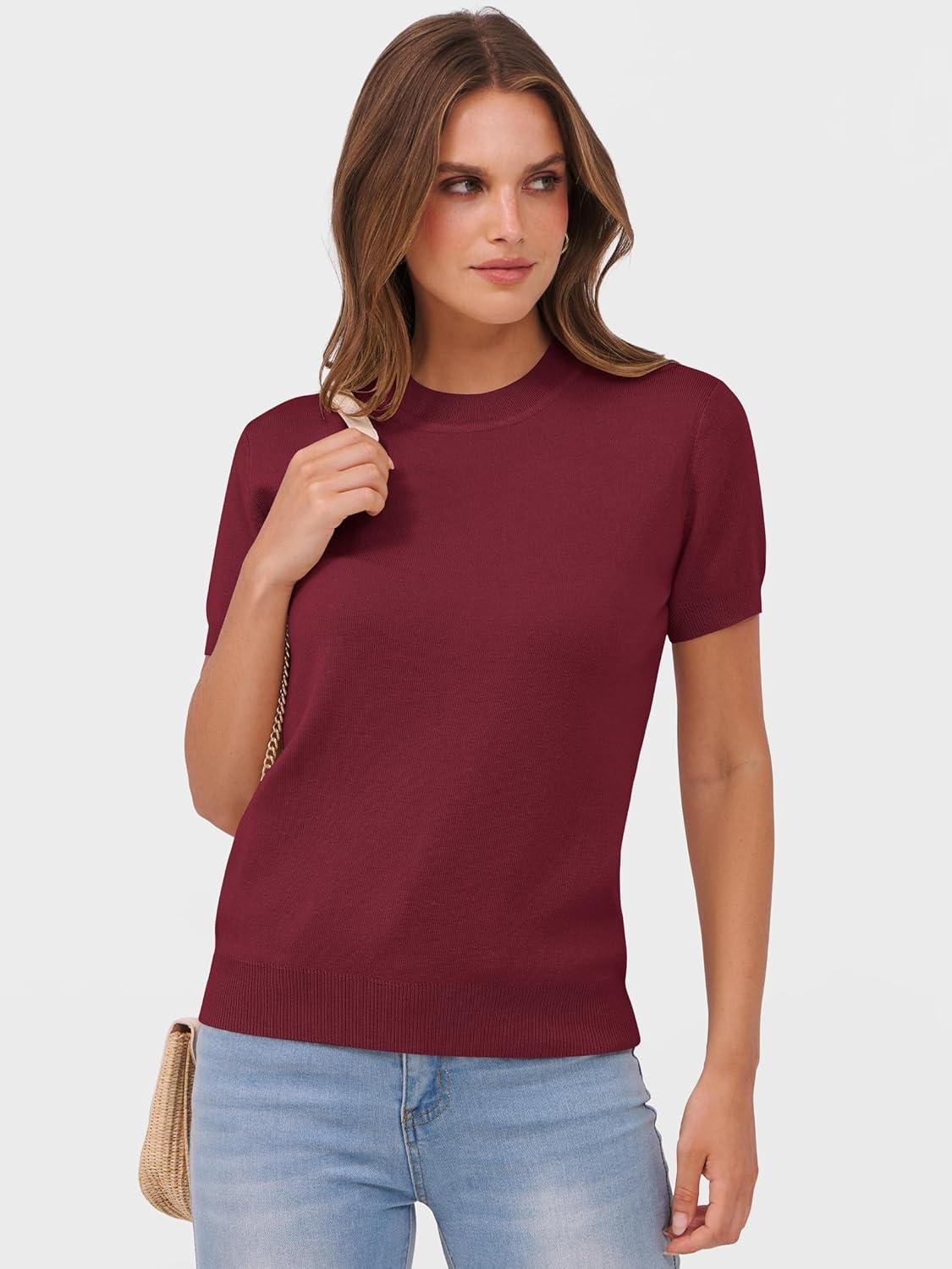 ANRABESS Womens Short Sleeve Sweaters Wool Blend Crew Neck Sweater Shirts Business Casual Work Tops 2025 Summer Outfits(Wine Red)