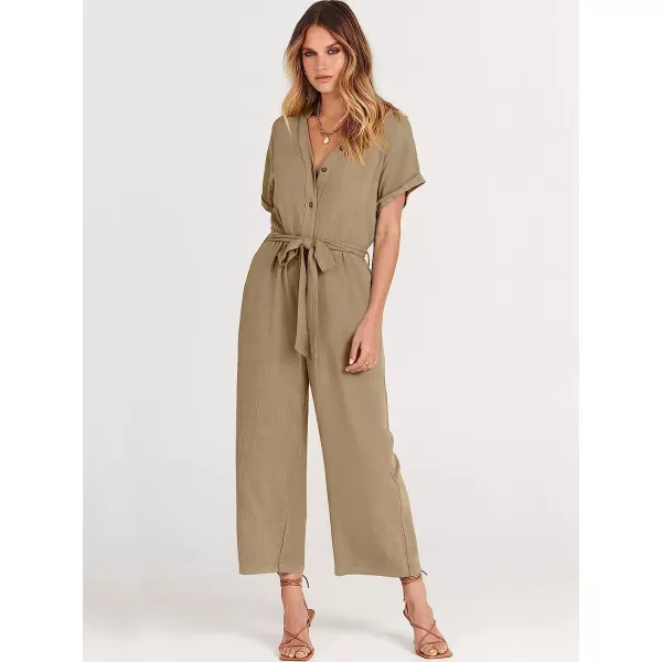 imageANRABESS Womens Short Sleeve V Neck Buttons Waist Belt Straight Wide Leg Cropped Jumpsuits Rompers with PocketsKhaki