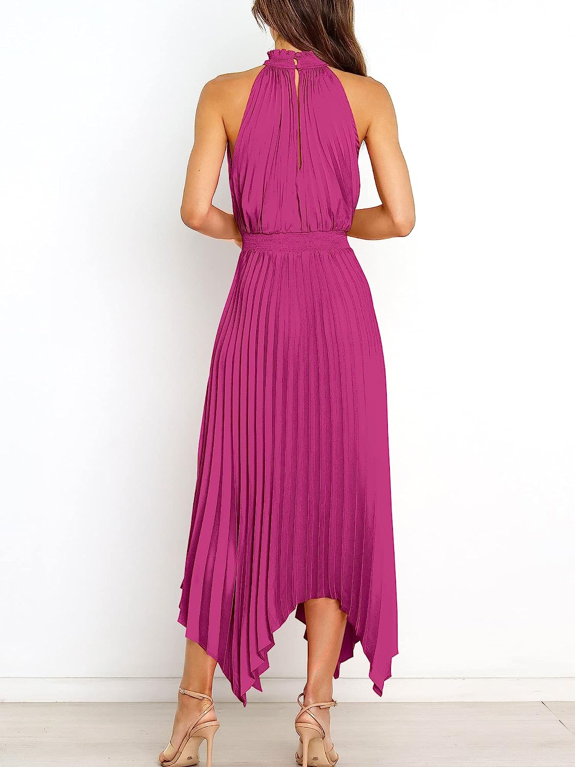 imageANRABESS Womens Sleeveless Cutout Halter Neck Satin Formal Dress Smocked Pleated Asymmetric Party Cocktail Maxi DressRose