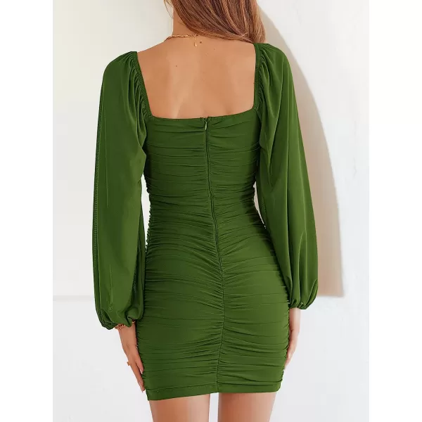 ANRABESS Women's Square Neck Mesh Long Sleeve Ruched Bodycon Mini Dress Party Club Cocktail Short Dresses(Deep Green)