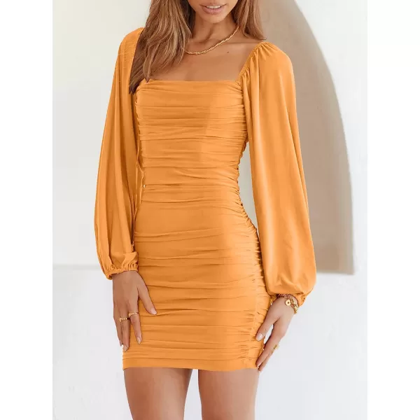 ANRABESS Women's Square Neck Mesh Long Sleeve Ruched Bodycon Mini Dress Party Club Cocktail Short Dresses(Yellow)