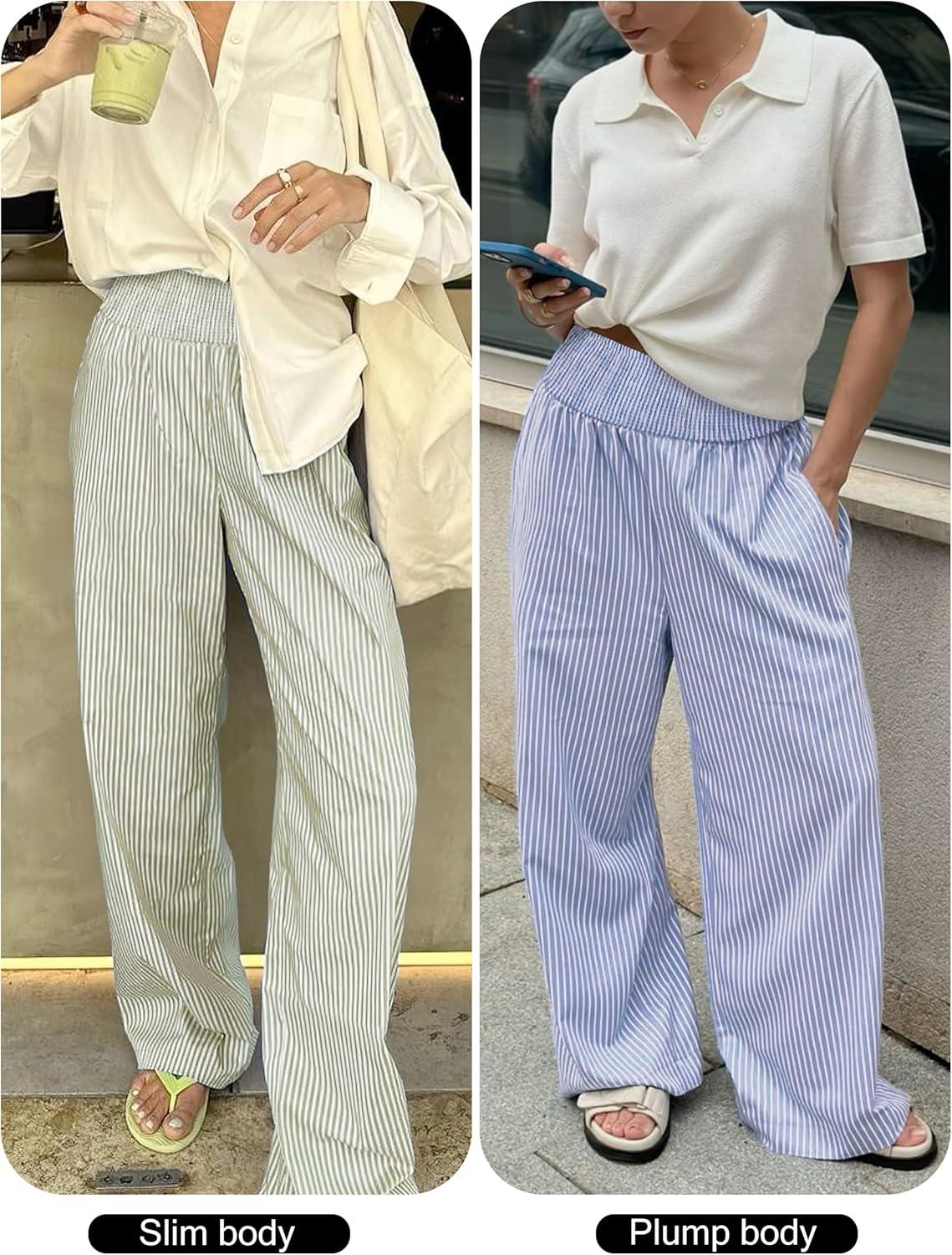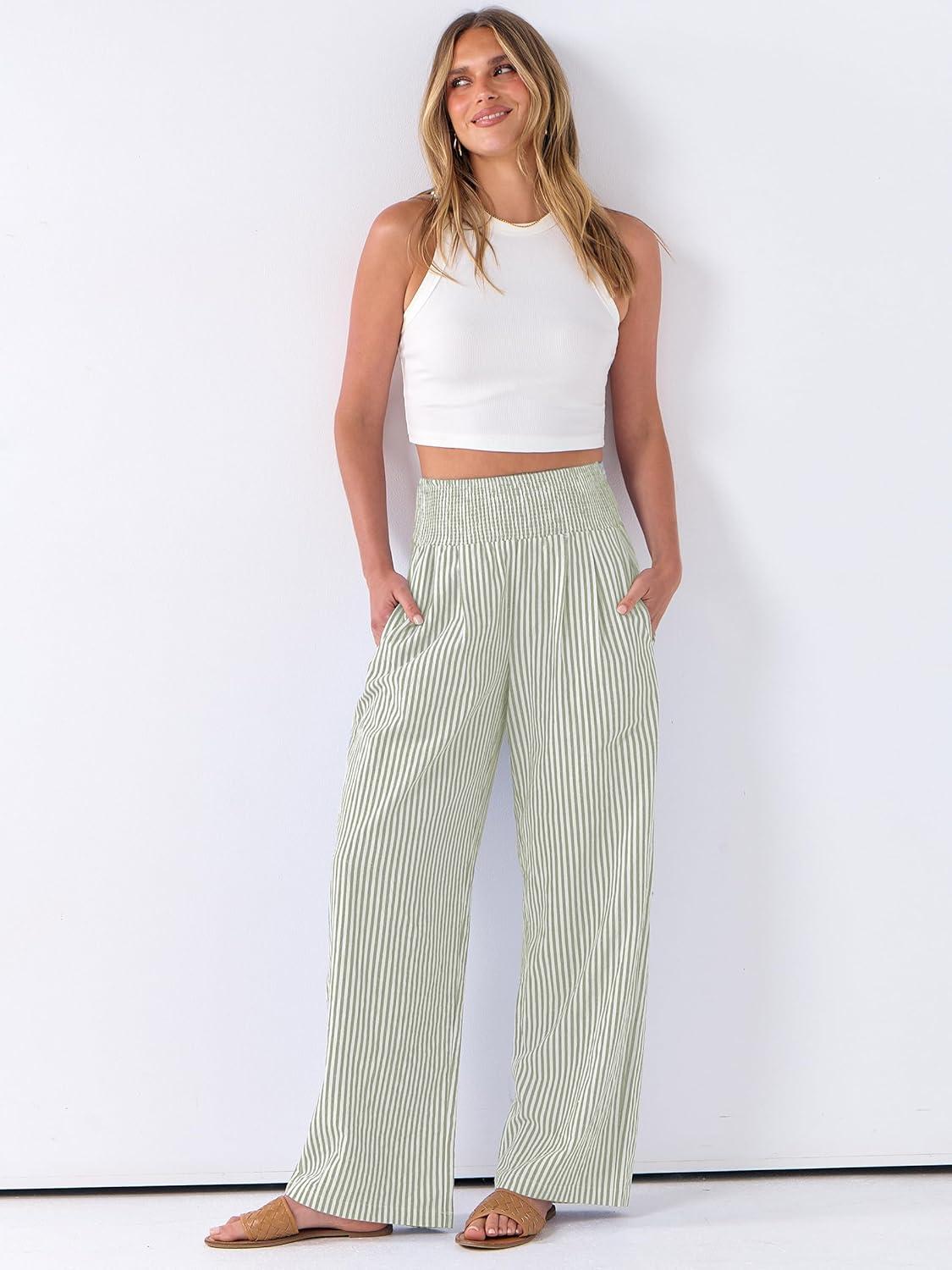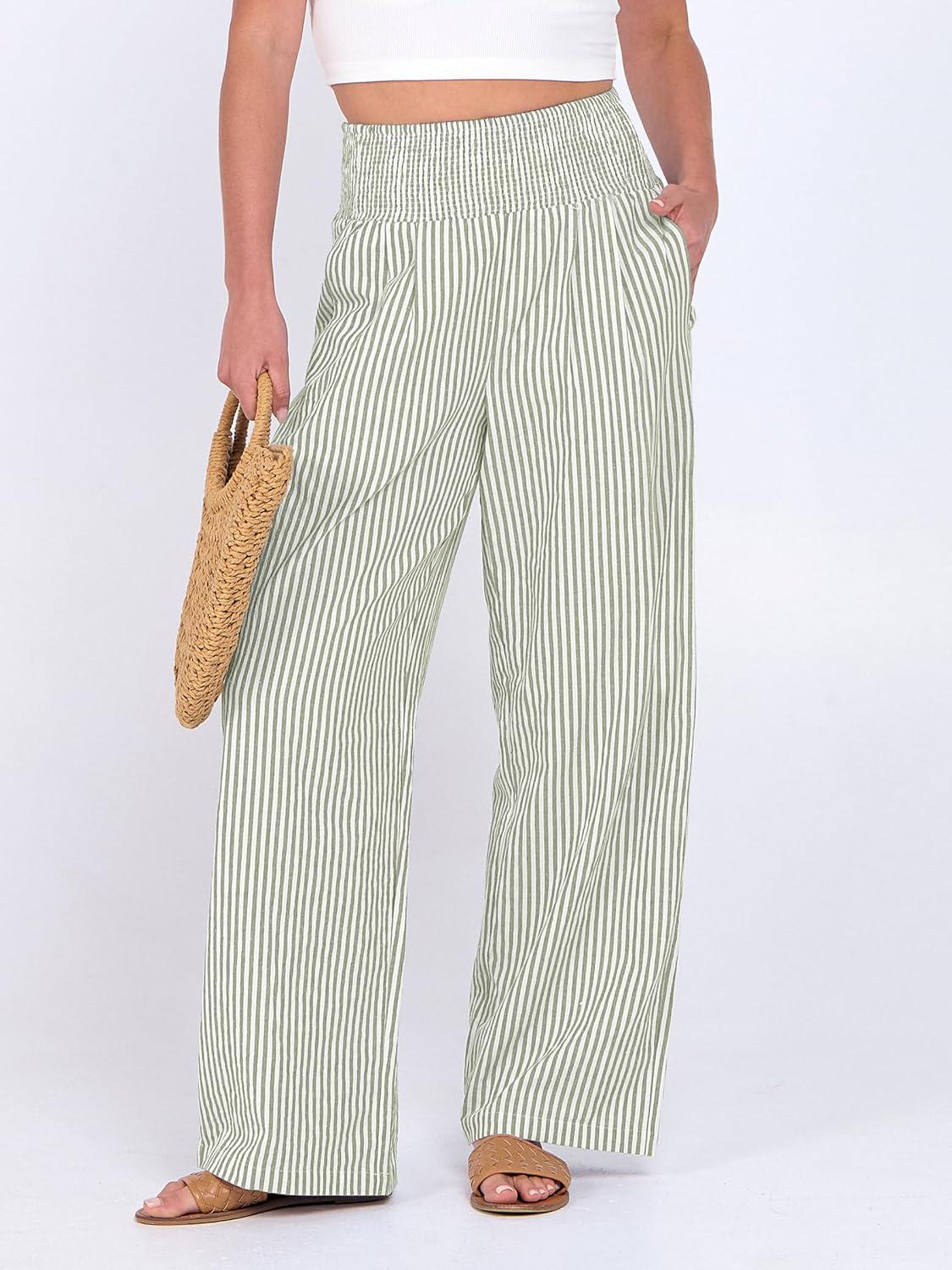 ANRABESS Womens Striped Gingham Palazzo Pants Wide Leg High Waisted Lounge Pajama Pants Cute Casual Trousers with Pockets(Army Green White Stripe)