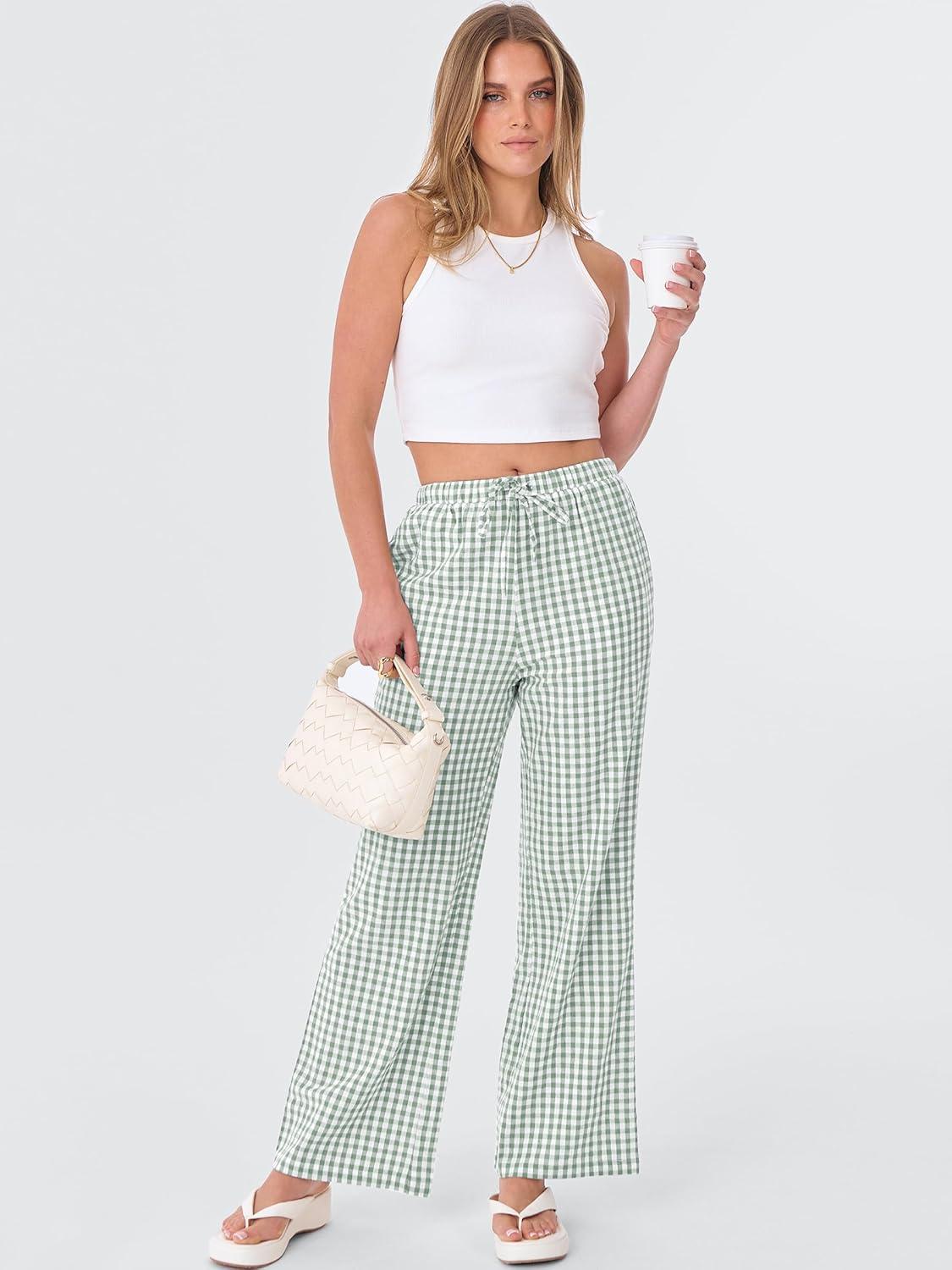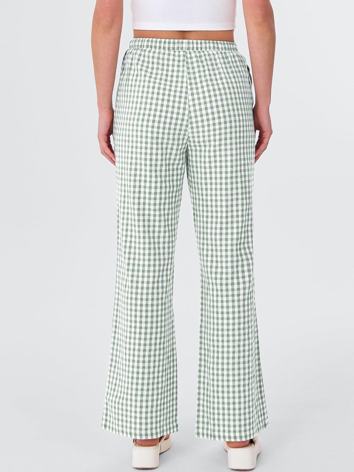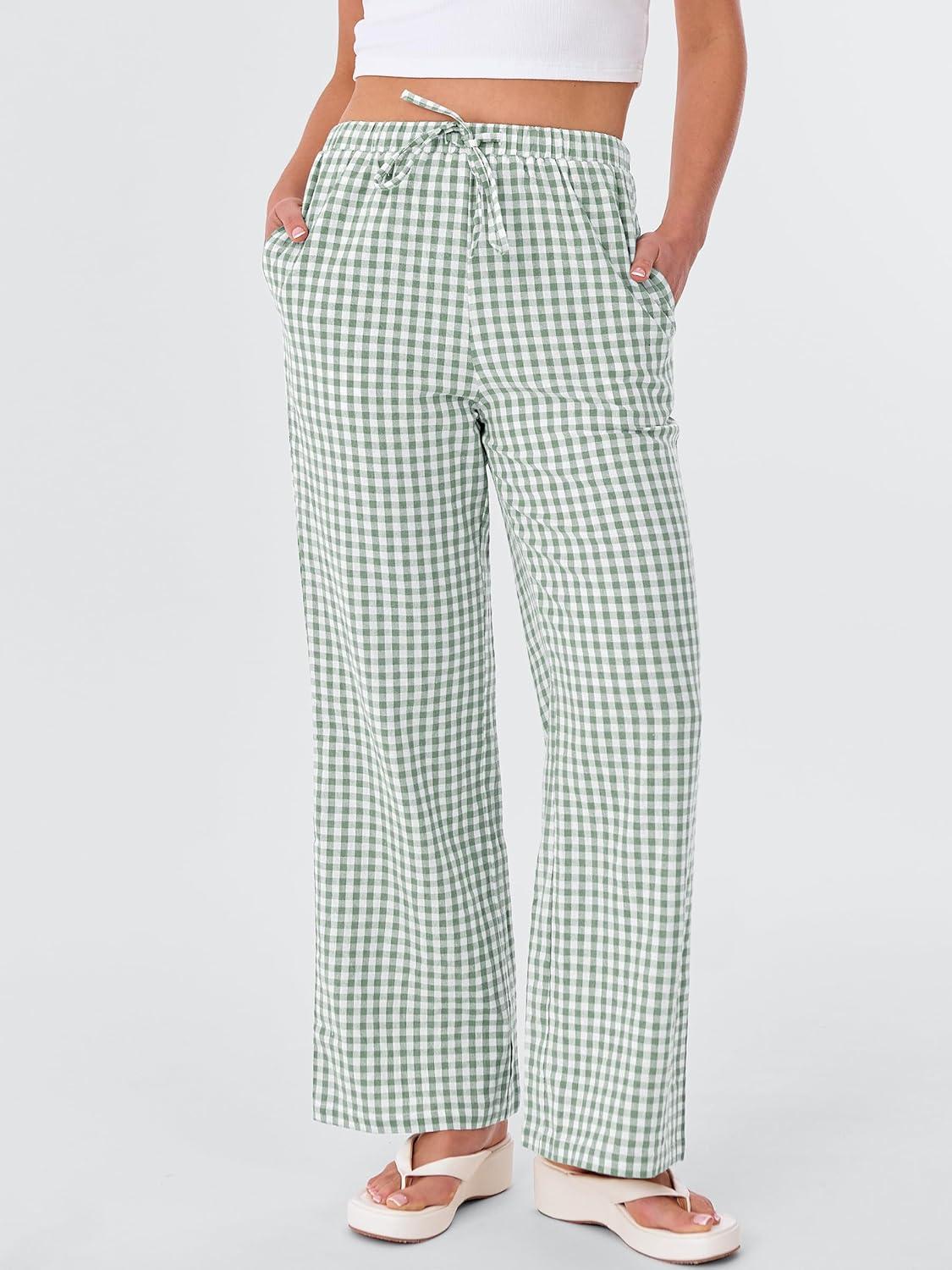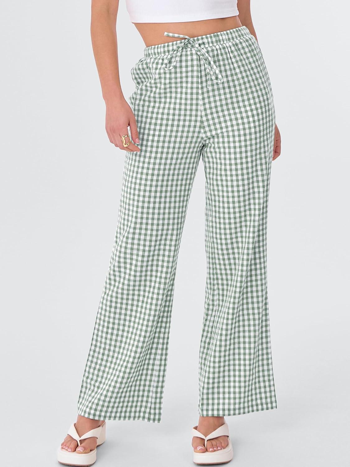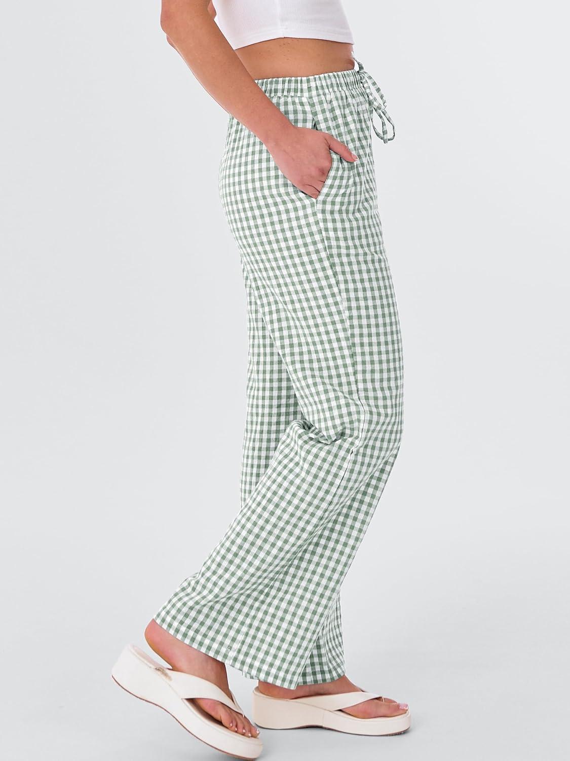 ANRABESS Women’s Striped Gingham Pants 2025 Fall Pajama Lounge Boxer Pants Casual Wide Leg Drawstring PJ Bottoms Trousers(Green White Plaid)