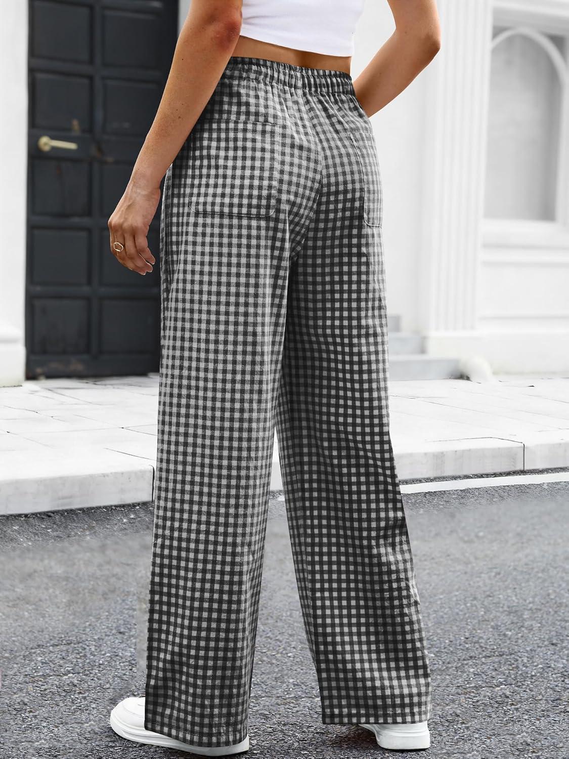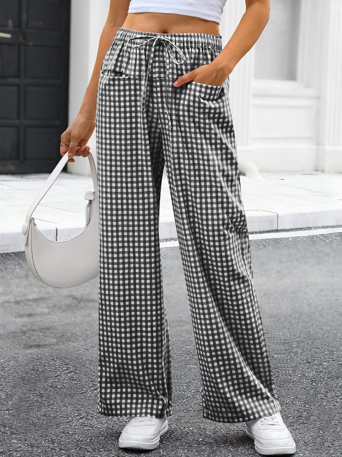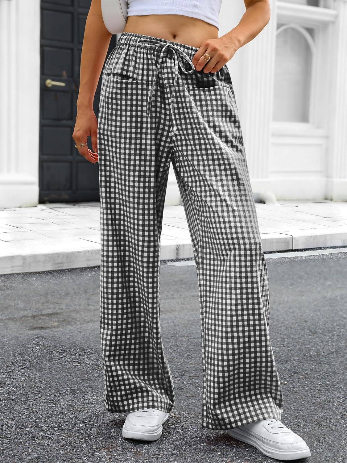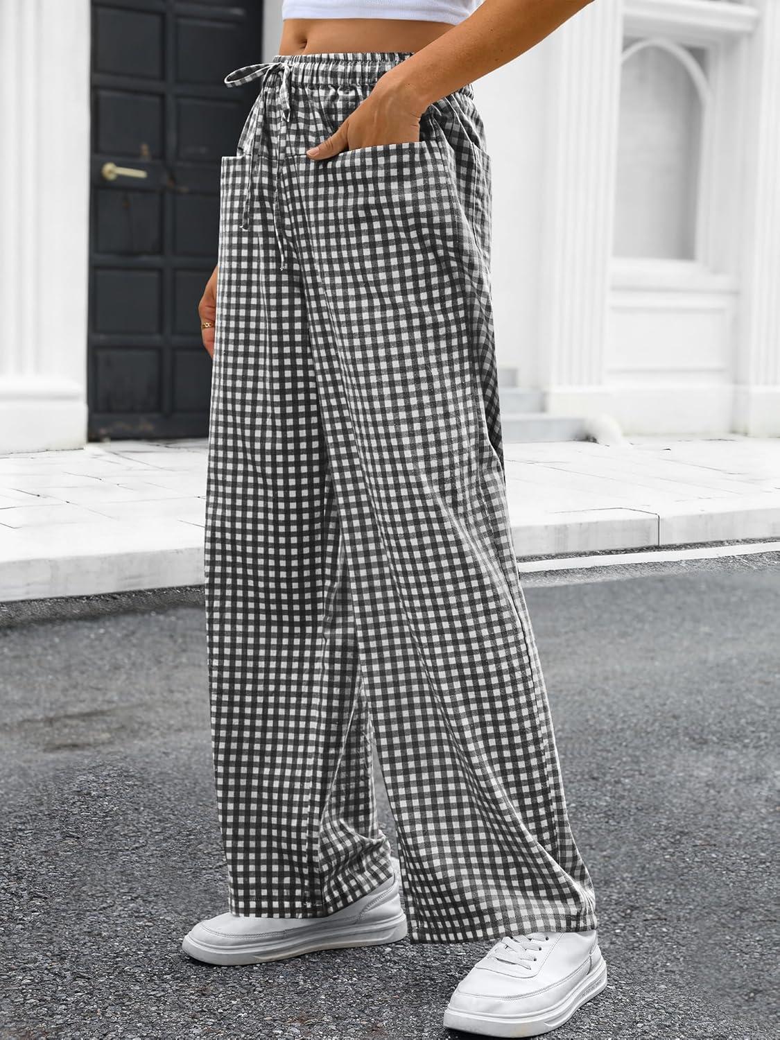 ANRABESS Womens Striped Gingham Pants 2025 Pajama Drawstring Wide Leg Lounge Plaid Pants Cute Casual Trousers with Pockets(Black White Plaid)