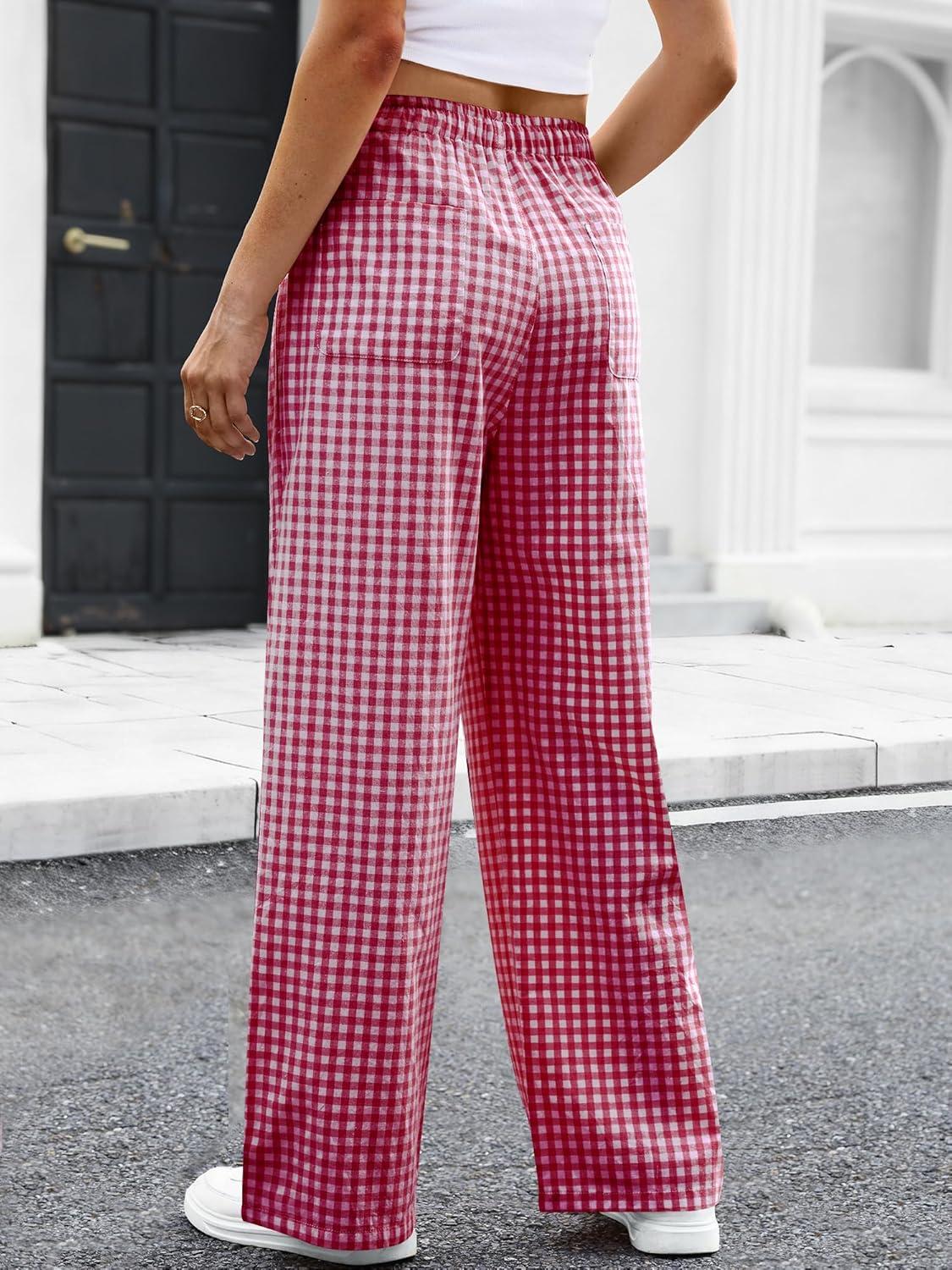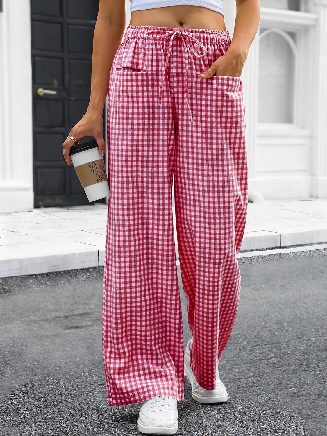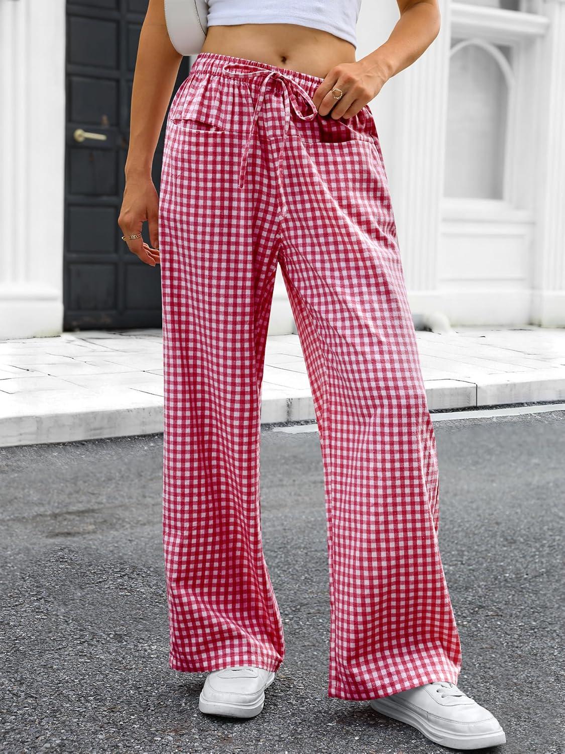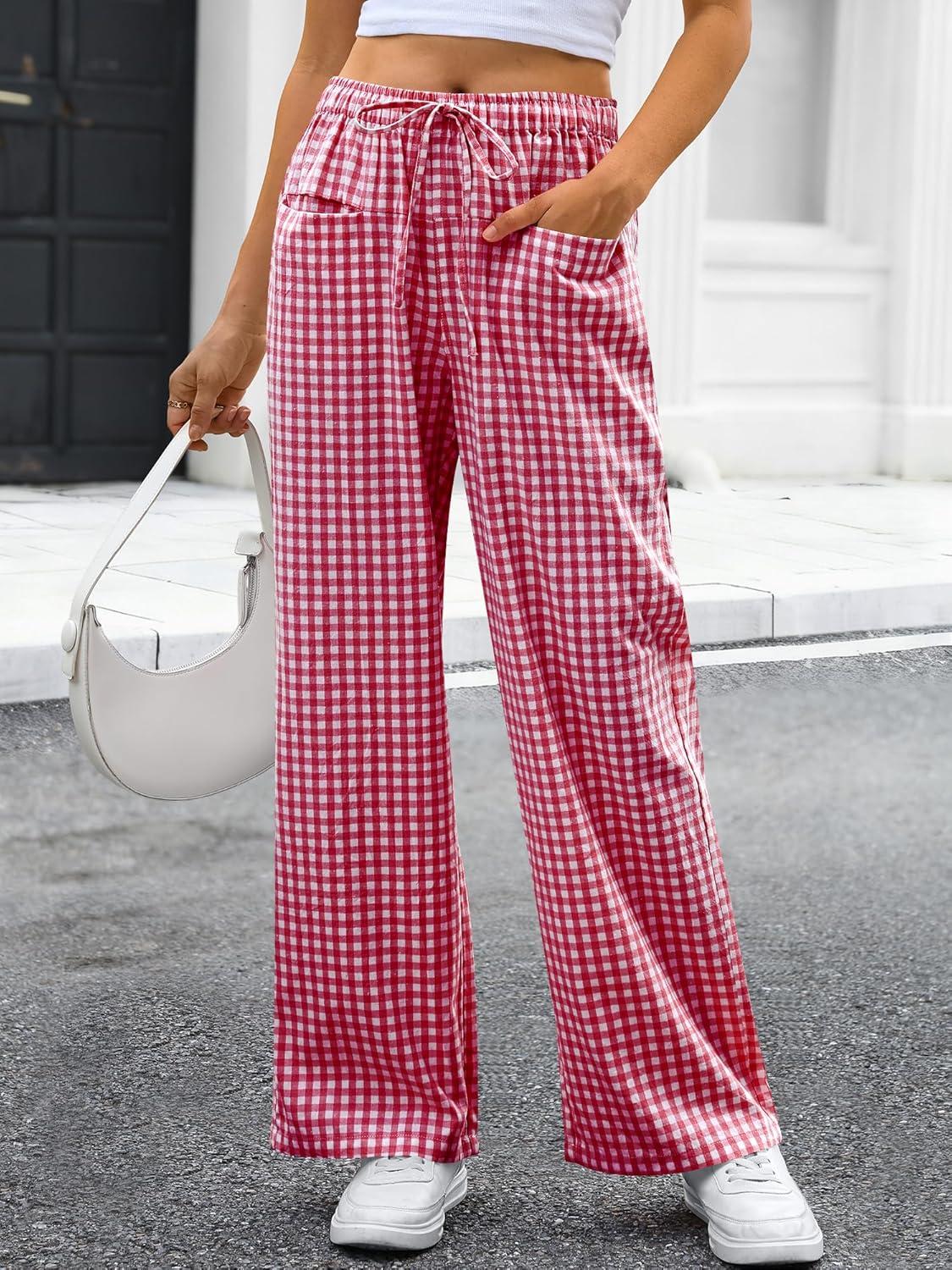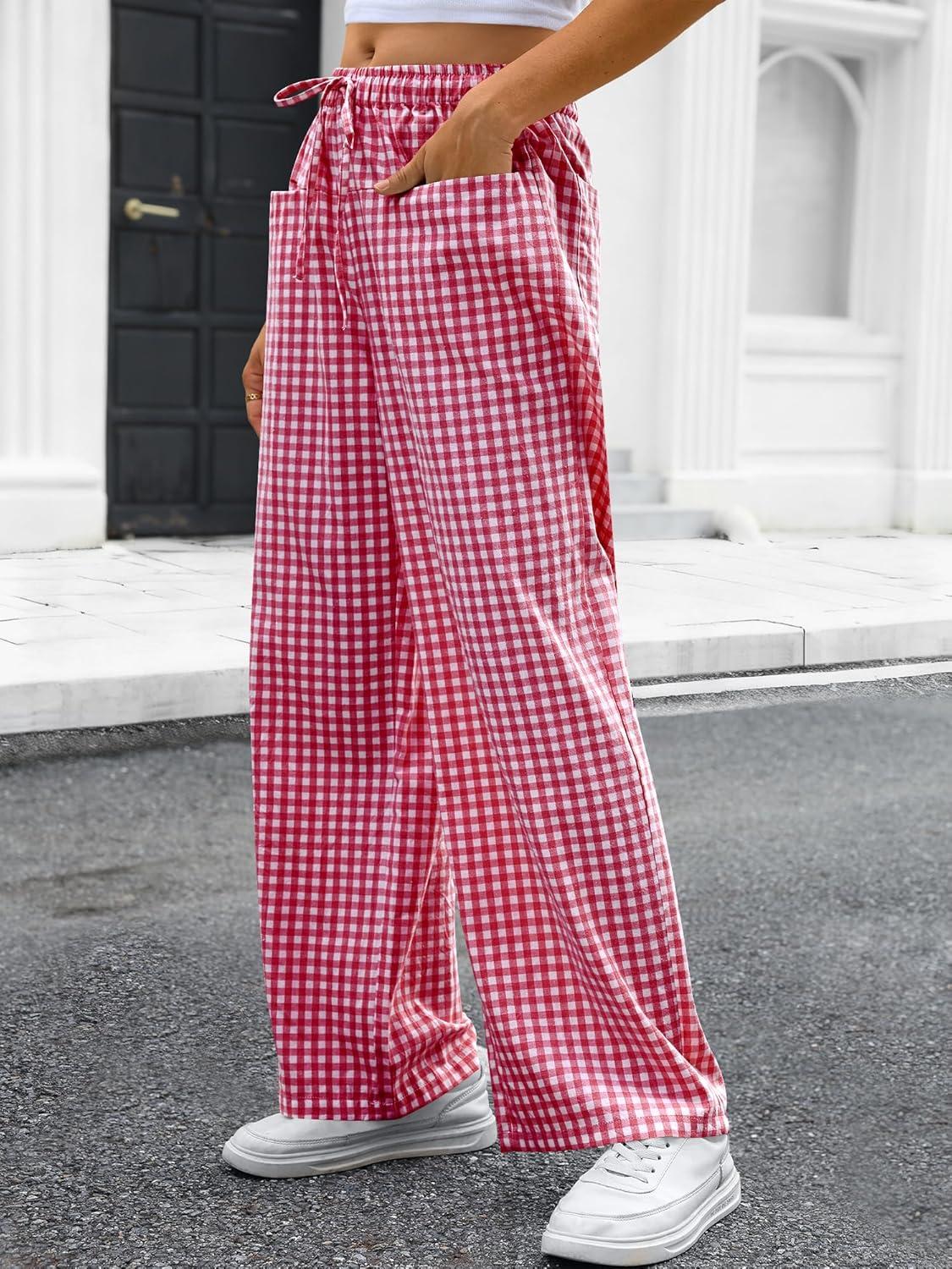 ANRABESS Womens Striped Gingham Pants 2025 Pajama Drawstring Wide Leg Lounge Plaid Pants Cute Casual Trousers with Pockets(Red White Plaid)