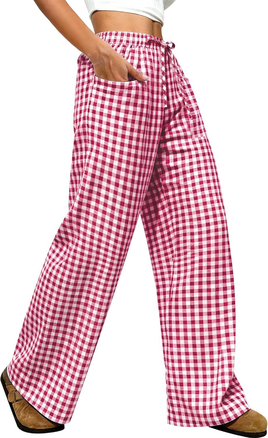 ANRABESS Womens Striped Gingham Pants 2025 Pajama Drawstring Wide Leg Lounge Plaid Pants Cute Casual Trousers with Pockets(Pink White Plaid)