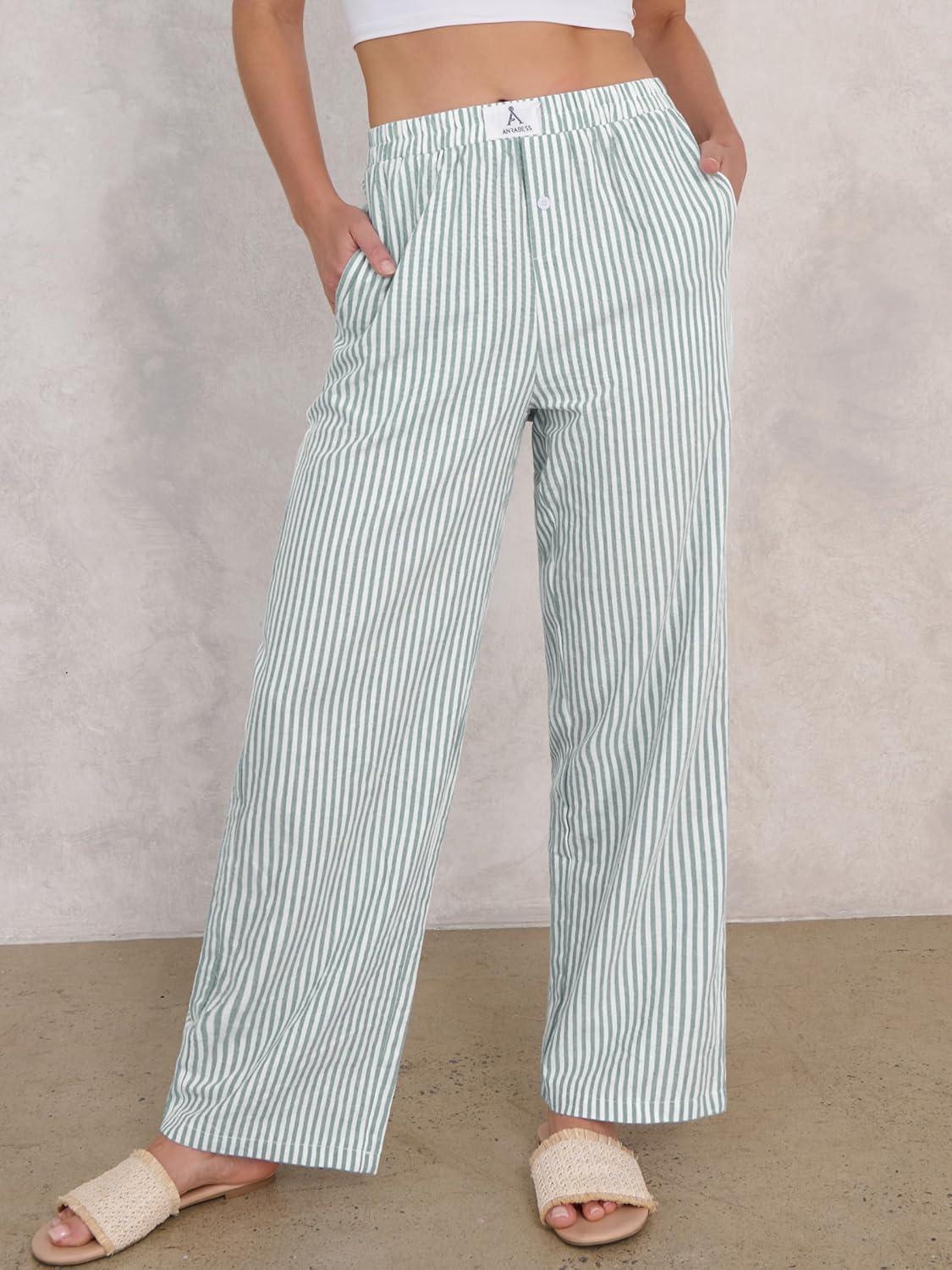 ANRABESS Womens Striped Gingham Pants 2025 Pajama Lounge Boxer Pants Cute Comfy PJ Bottoms with Pockets Y2K Plaid Outfits(Green White Stripe)