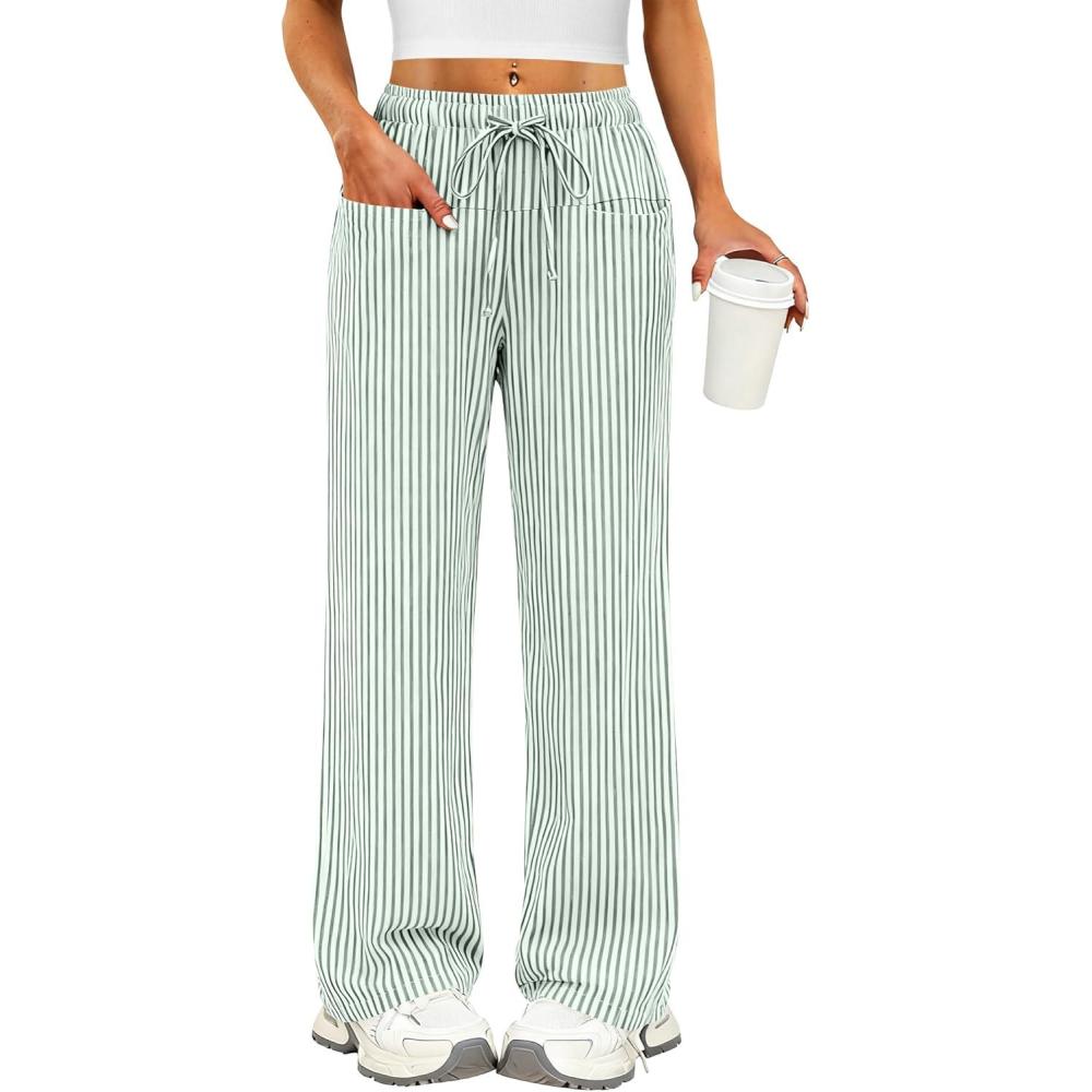 ANRABESS Womens Striped Gingham Pants 2026 Pajama Drawstring Wide Leg Lounge Plaid Pants Cute Casual Trousers with Pockets(Green White Stripe)