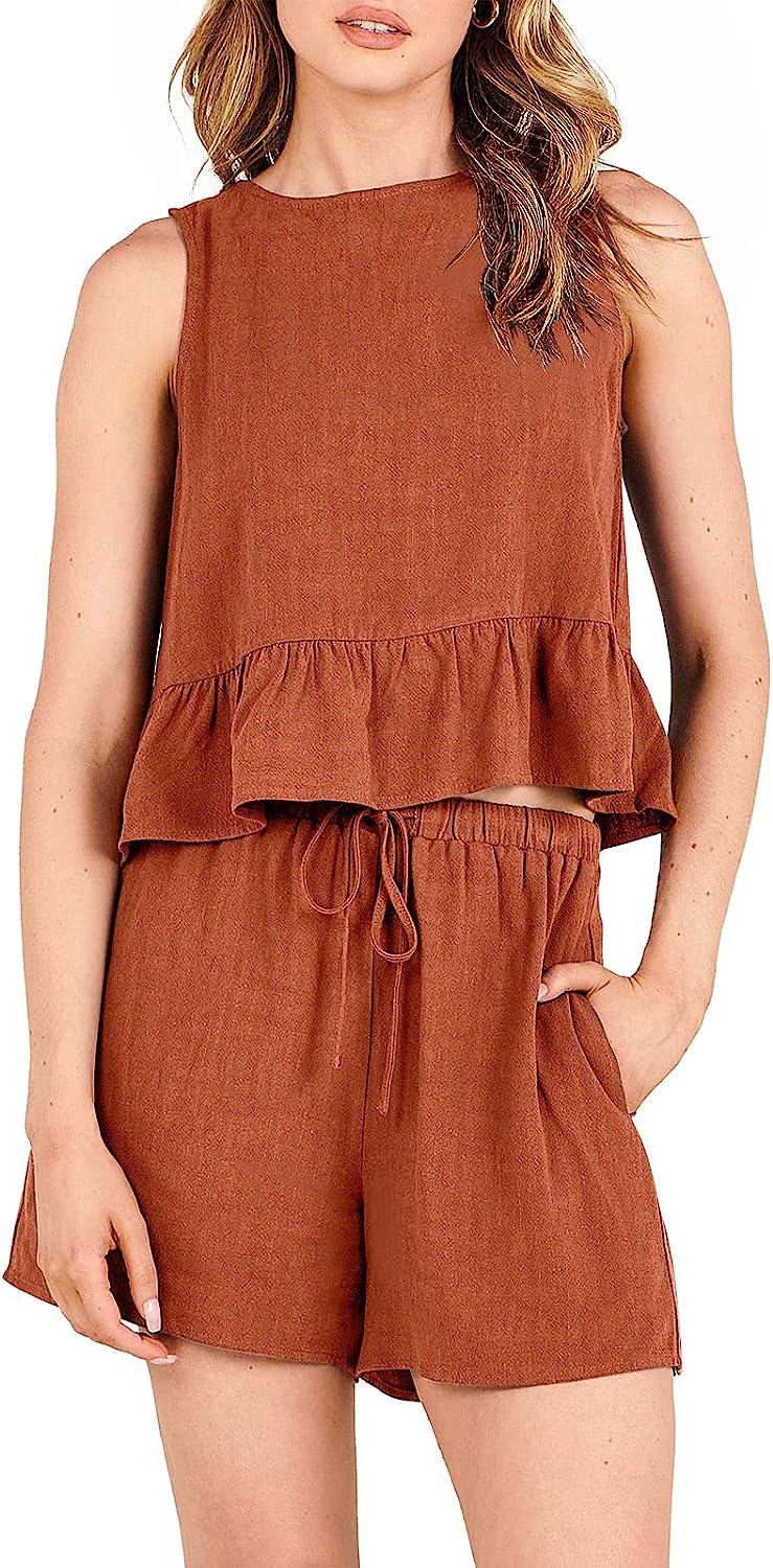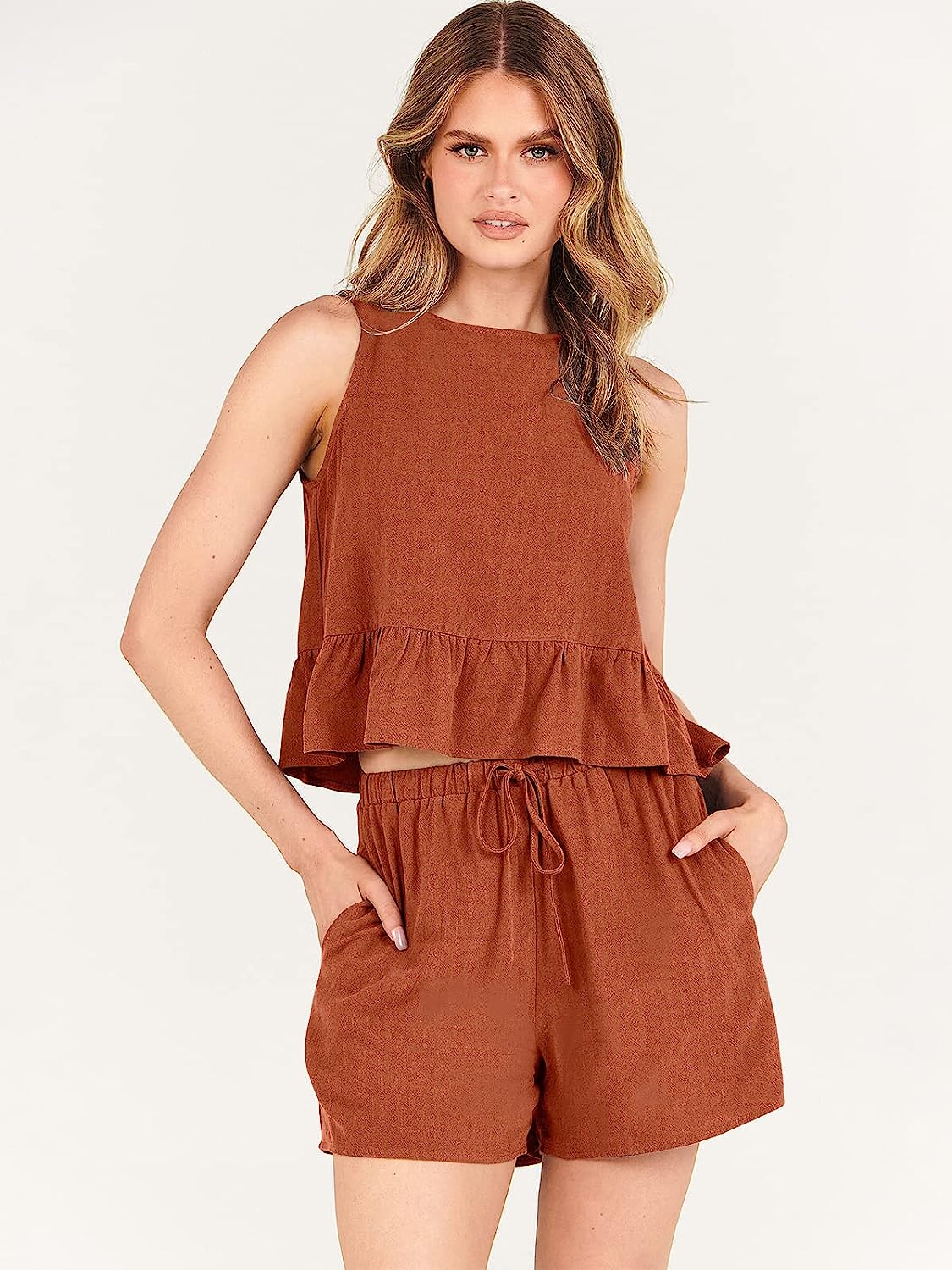 ANRABESS Women’s Summer 2 Piece Outfits Shorts Sets Sleeveless Ruffle Crop Top Tank and Drawstring Shorts Romper(Rust)